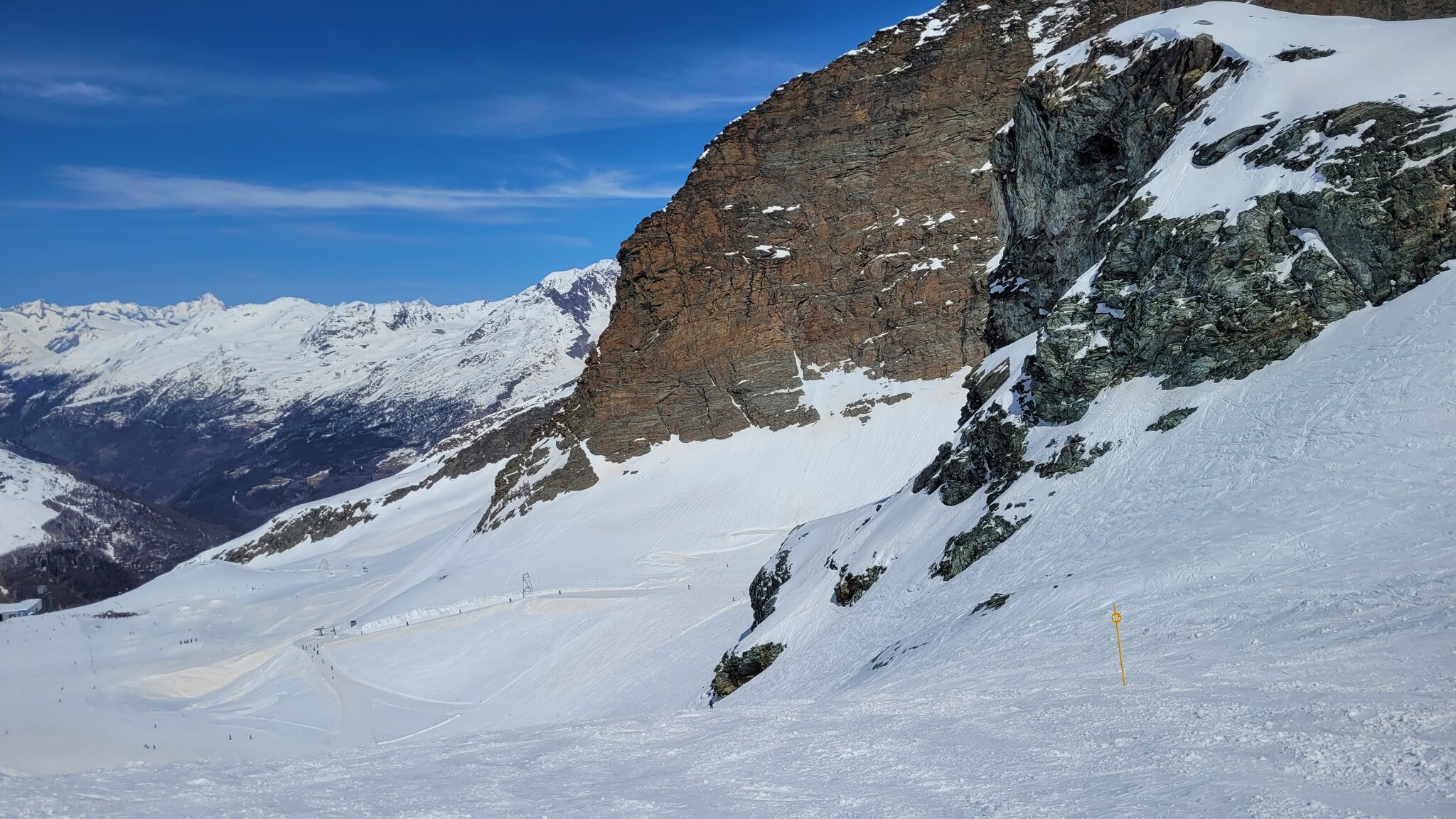 Wie schon gesagt, Plattjen, Spielboden, Längfluh, Feechatz, sowie Mittelallalin 1-2-3-4 und Stafelwald waren geschlossen. Überraschenderweise war der Skilift Mittaghorn geöffnet. Die restlichen Anlagen (also Alpin Express, Felskinn, Metro, Morenia, Egginerjoch, Leeboden und Bifig) waren geöffnet. Ich verstehe nicht, warum sie nicht in der Lage waren, Spielboden/Längfluh bis zum Ende der Saison zu öffnen, obwohl die Schneeverhältnisse hervorragend waren und dies im Fahrplan vorgesehen war... Wie auch immer, es ist Saas-Fee...