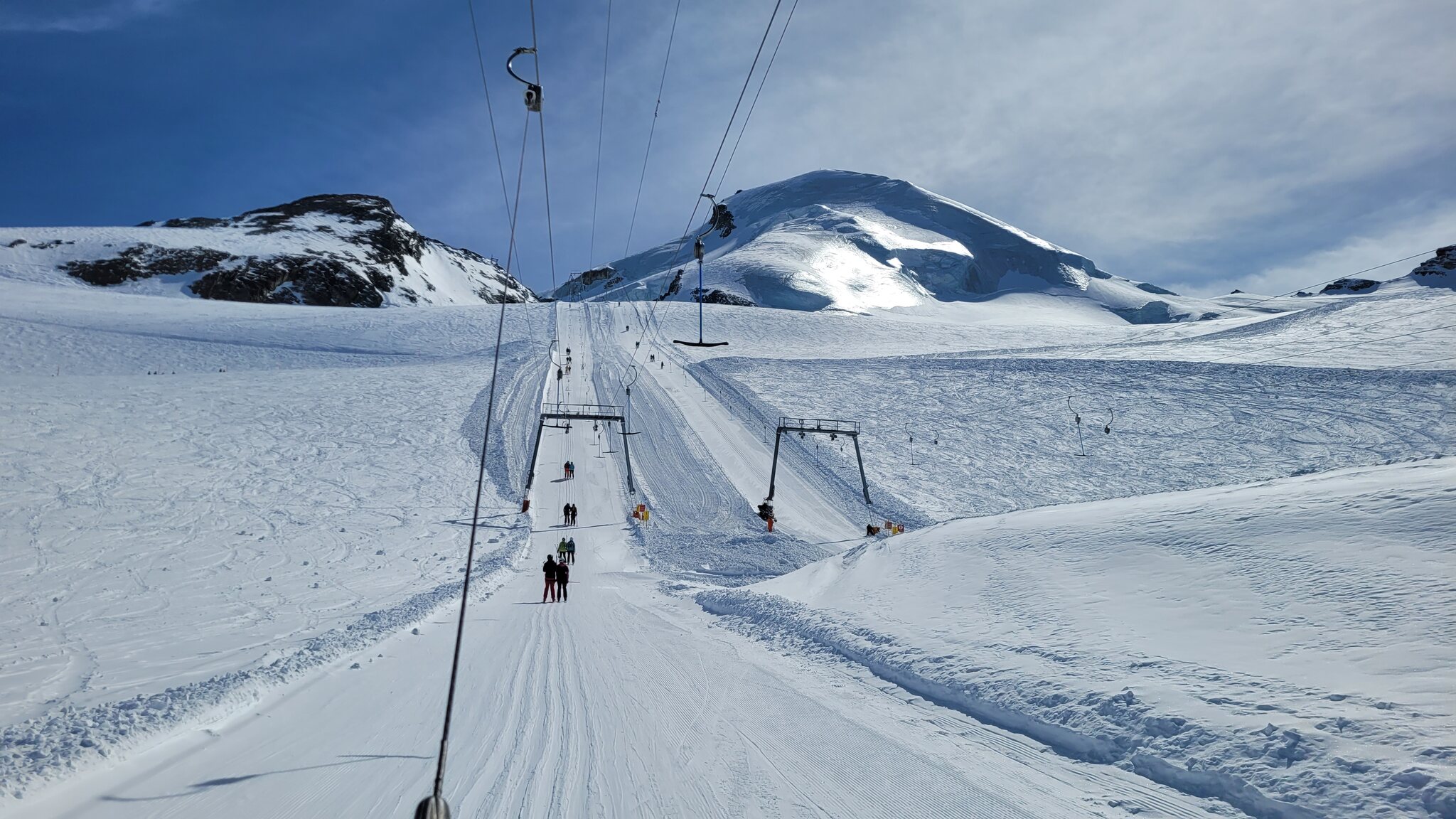 Die Schnee- und Pistenverhältnisse sind in Nicos Bericht bereits gut dokumentiert. Der Pulverschnee auf dem Gletscher war sehr angenehm zu fahren. Die Piste von Maste 4 zur Morenia Talstation hat zwar einige rutschige Stellen für meine ungepflegten Kanten, ist aber trotzdem machbar.