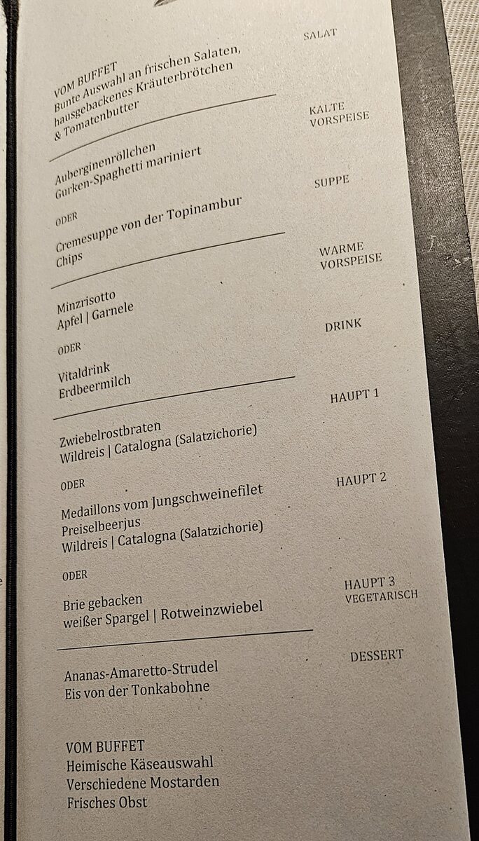 Für mich wieder durch die Bank überzeugend vom Spargelsalat über das Crêpes-Röllchen, den Schweinebraten bis zum Buttermilch-Mousse