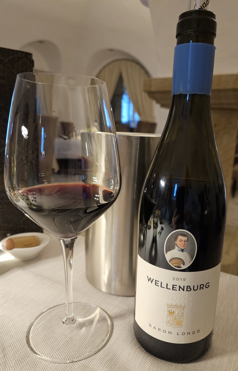 Dazu schon wieder eine Bordeaux-Cuvee, diesmal der 2019er Wellenburg von Baron Longo aus Neumarkt mit 13,5 Vol%. Cabernet Sauvignon und Merlot vertragen hier noch 2-3 Jahre Reife; klassische Cassis-Aromen mit recht griffigen Tanninen, die noch etwas runder werden dürften. Aber sehr gut passend zum Essen.