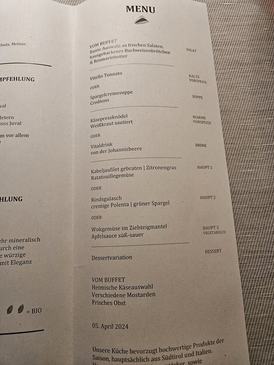 Nach einem Besuch von Burg Runkelstein, einer Schlenderrunde durch Meran und dem Kauf der Jahresration Wein im Kränzelhof in Tscherms hatte das Abendmenü seinen Höhepunkt im Zwiebelrostbraten, der eher als Rumpsteak daher kam