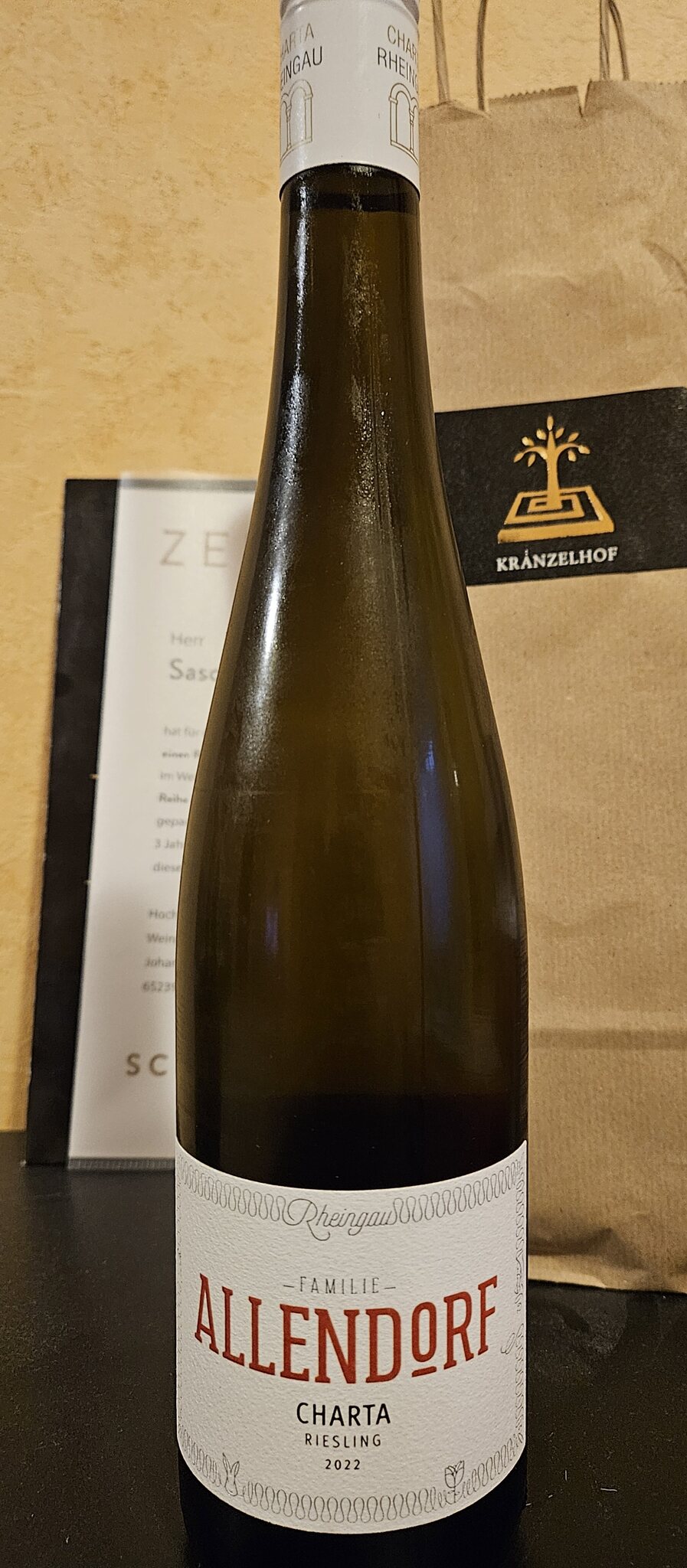 2022er Charta Riesling mit 12 Vol%. Mit Rheingauer Charta Rieslingen kann man eigentlich wenig falsch machen, da die geforderten Lese- und Ausbaukriterien einen gewissen Qualitätsrahmen definieren, der nur mit schlechtem Handwerk zu schlechten Ergebnissen führen kann.