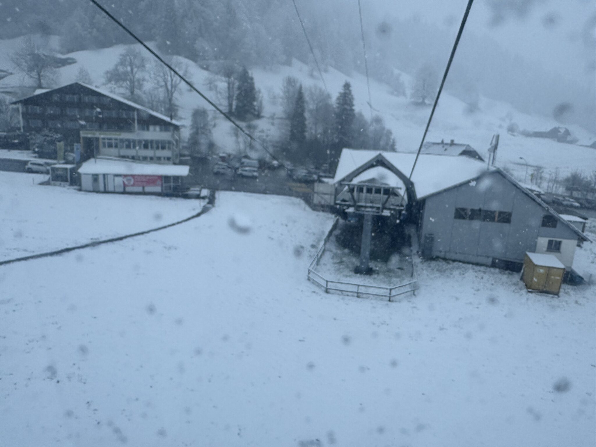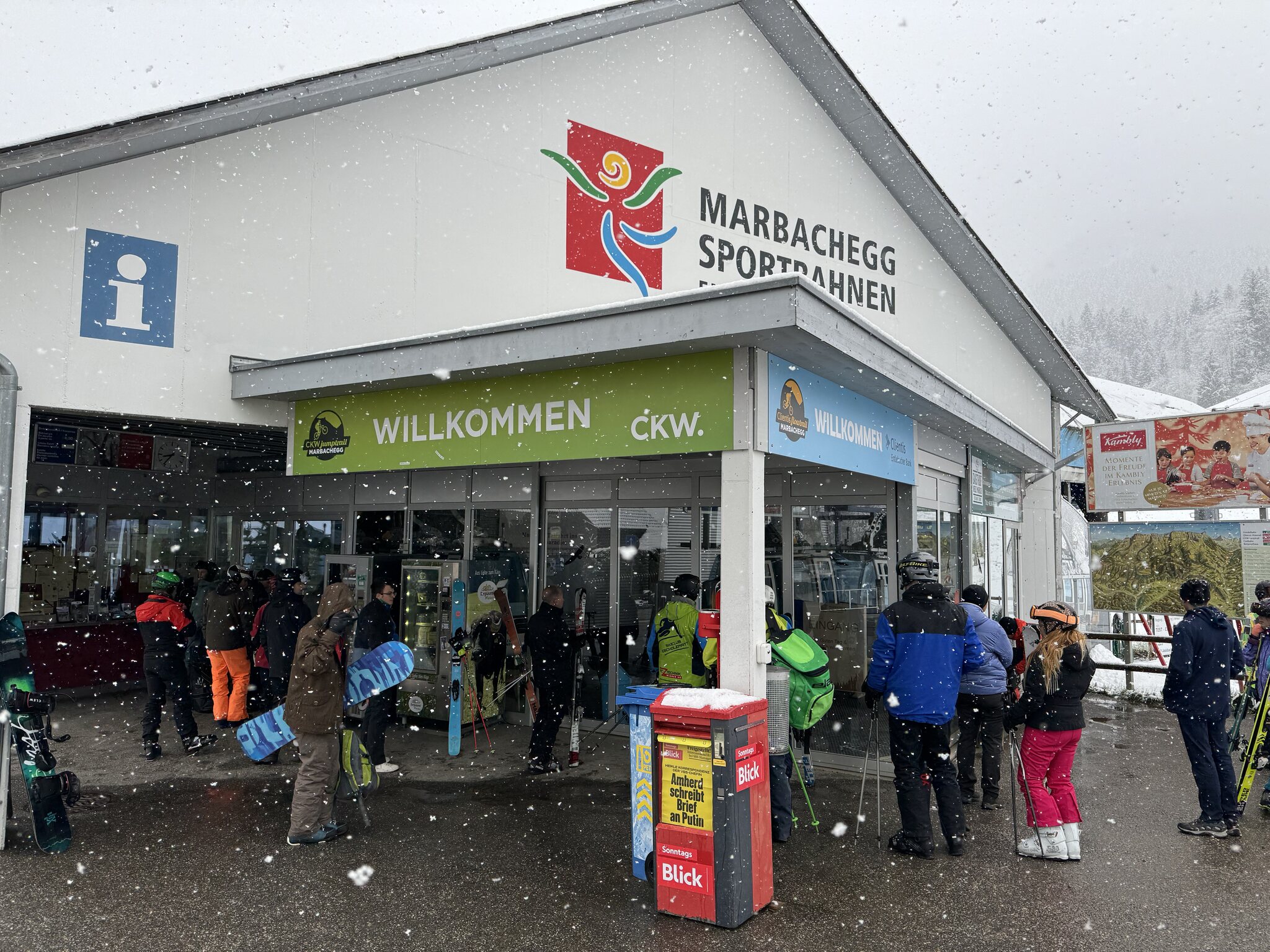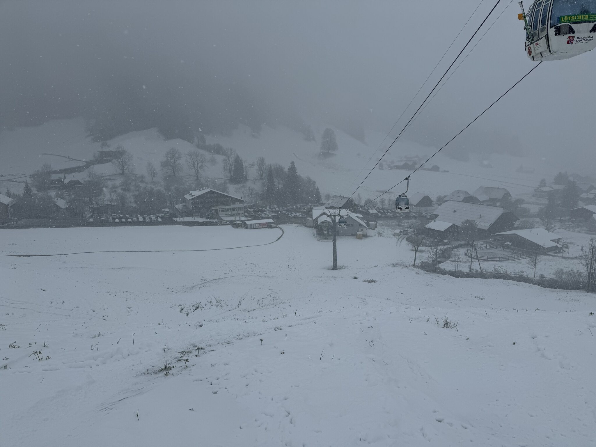 Bin in Marbach angekommen, die Strassen alle aper, ab 700m hat es angefangen zu schneien. Der Parkplatz gerade neben der Bahn ist um 08:40 schon fast voll, ich stehe an bei einer Schlange von ca. 10 Personen fürs Ticket. Momentan Schneefall, sie sind grad die Gondeln am ausgaragieren, Start soll um 9 Uhr sein.