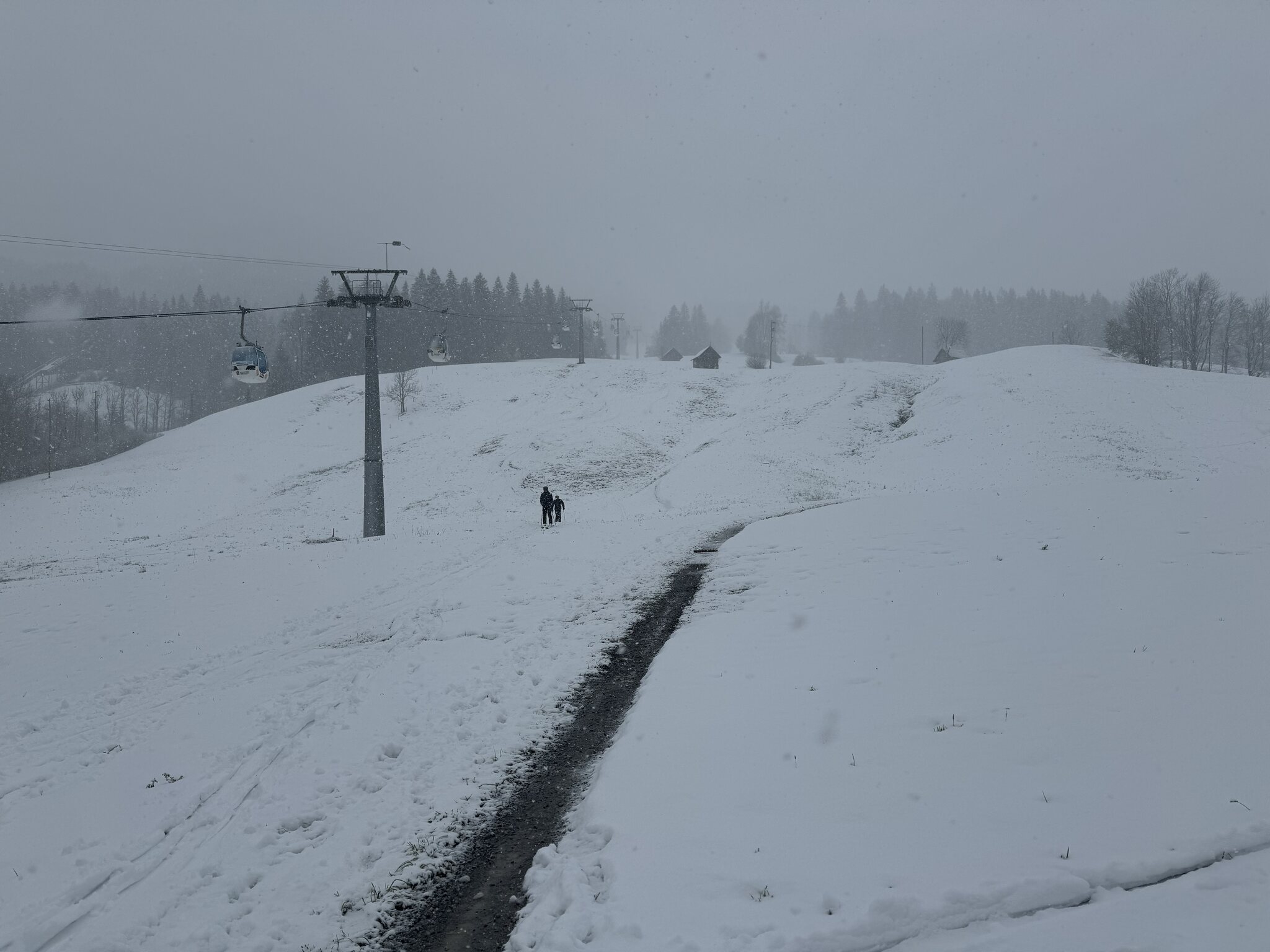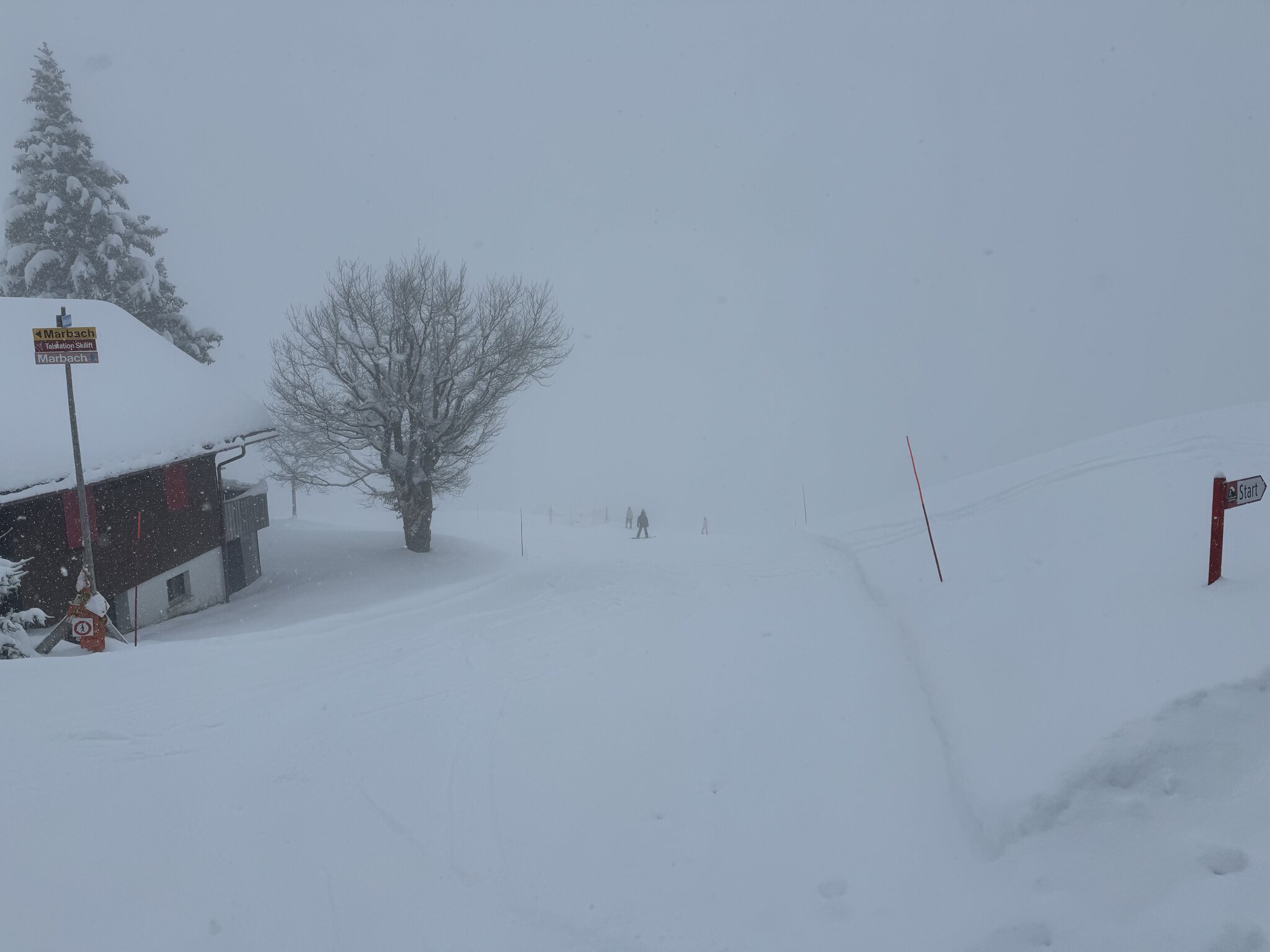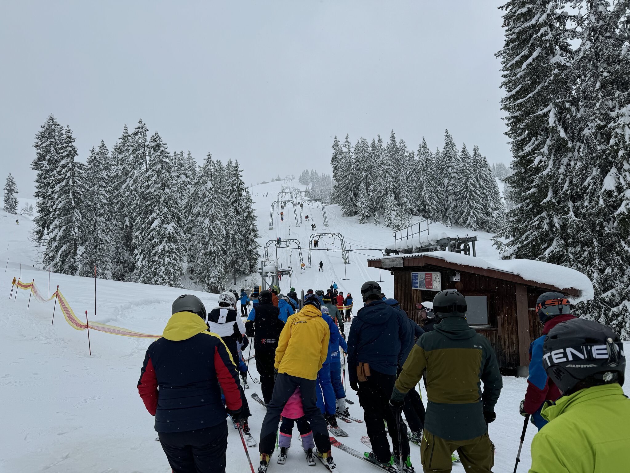Bin in Marbach angekommen, die Strassen alle aper, ab 700m hat es angefangen zu schneien. Der Parkplatz gerade neben der Bahn ist um 08:40 schon fast voll, ich stehe an bei einer Schlange von ca. 10 Personen fürs Ticket. Momentan Schneefall, sie sind grad die Gondeln am ausgaragieren, Start soll um 9 Uhr sein.