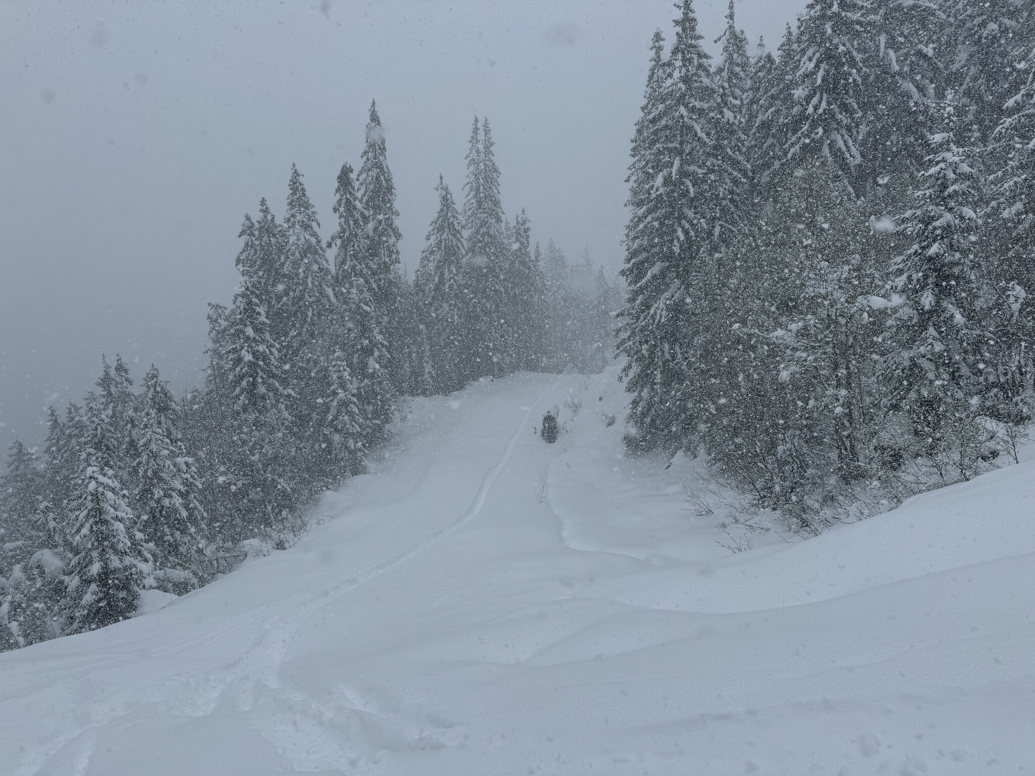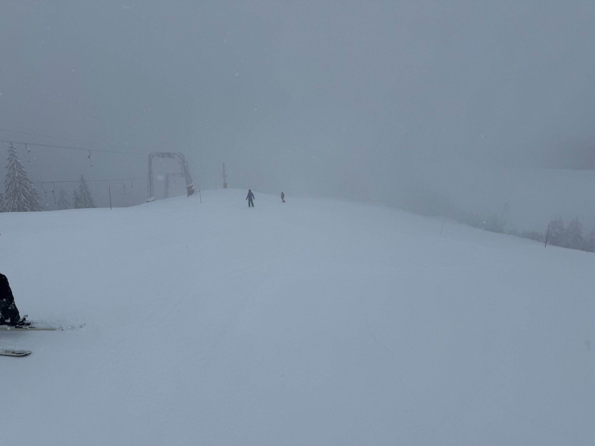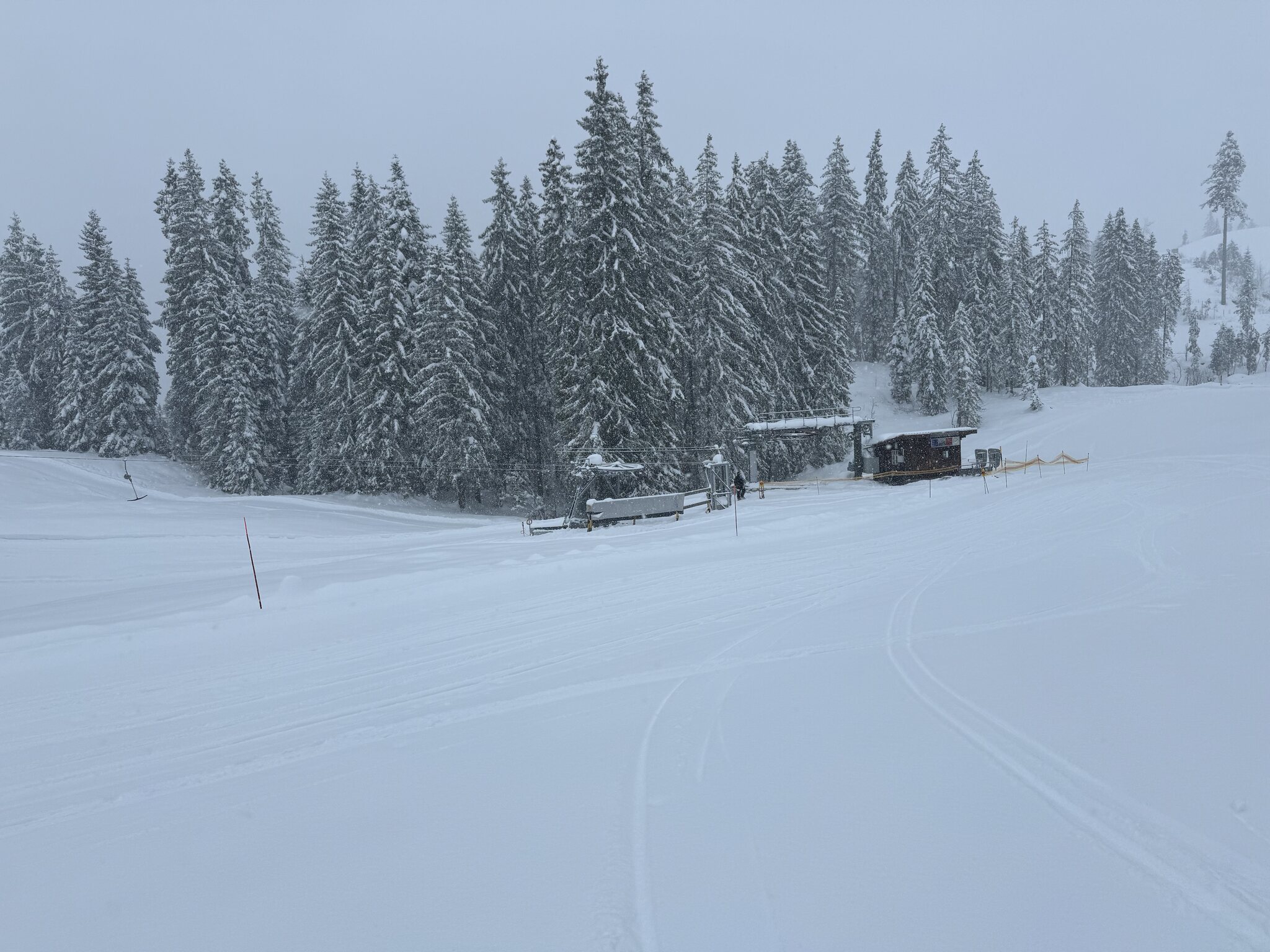 Die Piste ist in einem guten Zustand, hart mit Pulverschicht obendrauf, die Sicht ist auch ganz okay. Sie bereiten sogar den zweiten Schlepper vor.