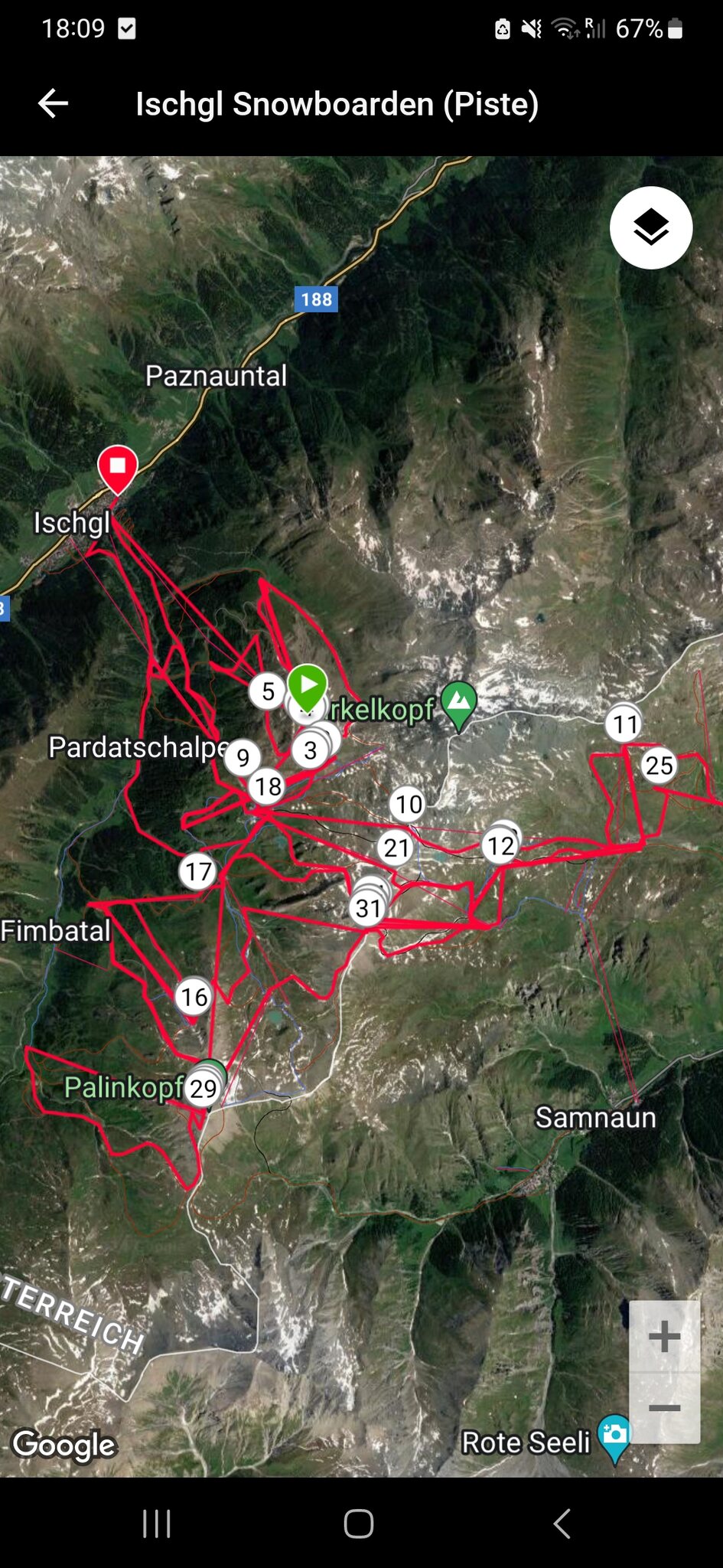Heute Dienstag war es ein richtiger Schnorcheltag. Die Pisten wurden gestern Abend präpariert, über Nacht hat es gute 20cm drauf geschneit. War natürlich sowohl auf den Pisten als auch nebenan richtig gut. Da ich alleine unterwegs bin, fahre ich nicht direkt völlig abseits im Gelände, das ist mir alleine doch zu heiß, falls doch mal was sein sollte. Meine Freundin kommt mit den Bedingungen nicht so gut zurecht, sie zog eine Skitour zum Paznauner Thaya vor.
