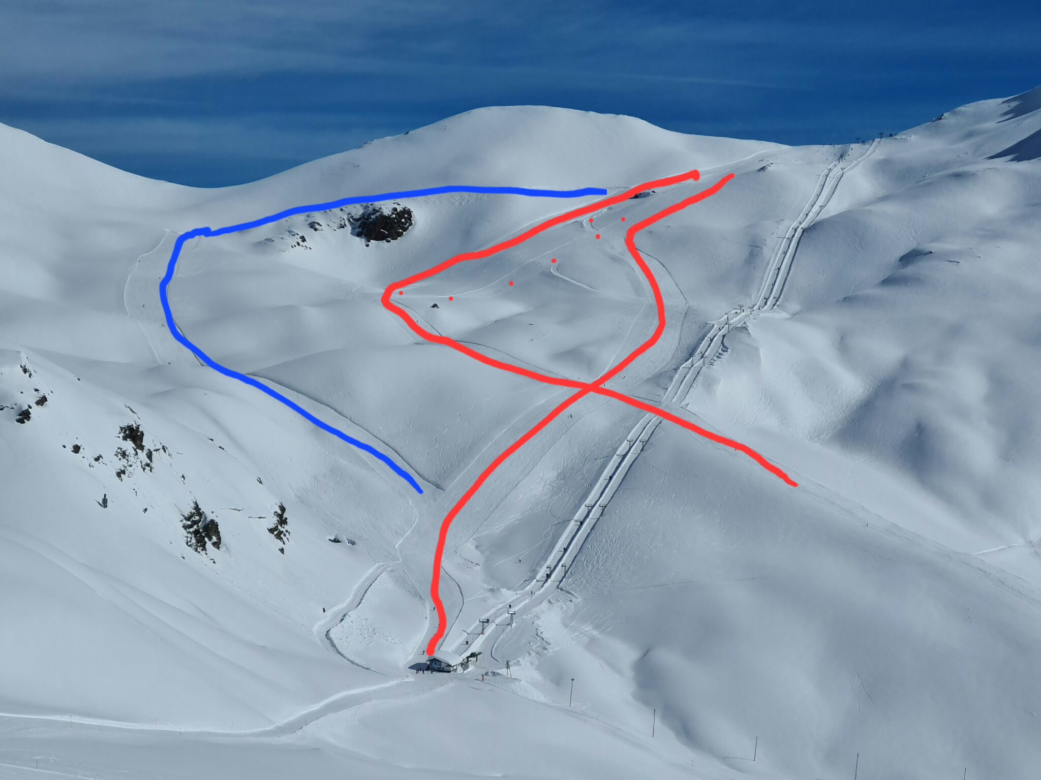 1. Scuol: Im Pistenplan sind an den Champatschliften eine Blaue und zwei rote Pisten eingezeichnet. Die zweite rote Piste geht nur bis zur Mitte der Lifte und biegt dann ab, woraufhin sie die andere rote Piste und den Doppelschlepplift kreuzt. Doch sie hat such oben noch eine Parallelpiste, die nicht im Pistenplan eingezeichnet ist, aber als Piste ausgesteckt ist, hier gepunktet dargestellt: