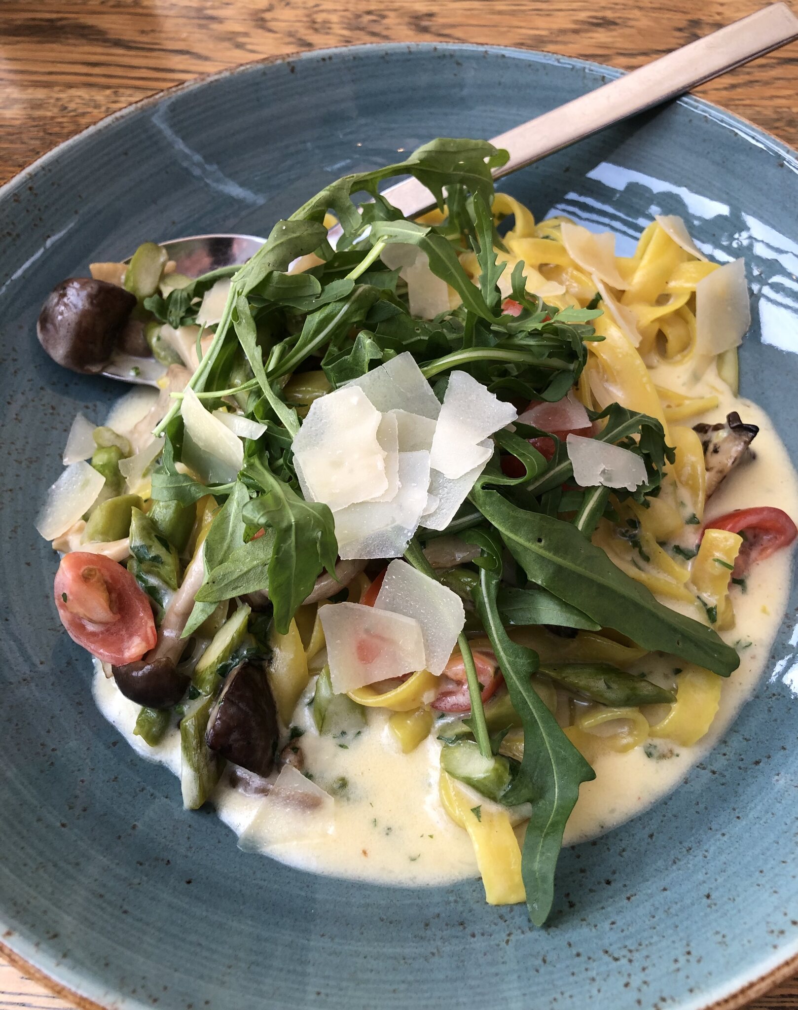 Allgäuer und hausgemachte Tagliatelle mit grünem Spargel, Waldpilzen, Parmesan & Gremolata.
