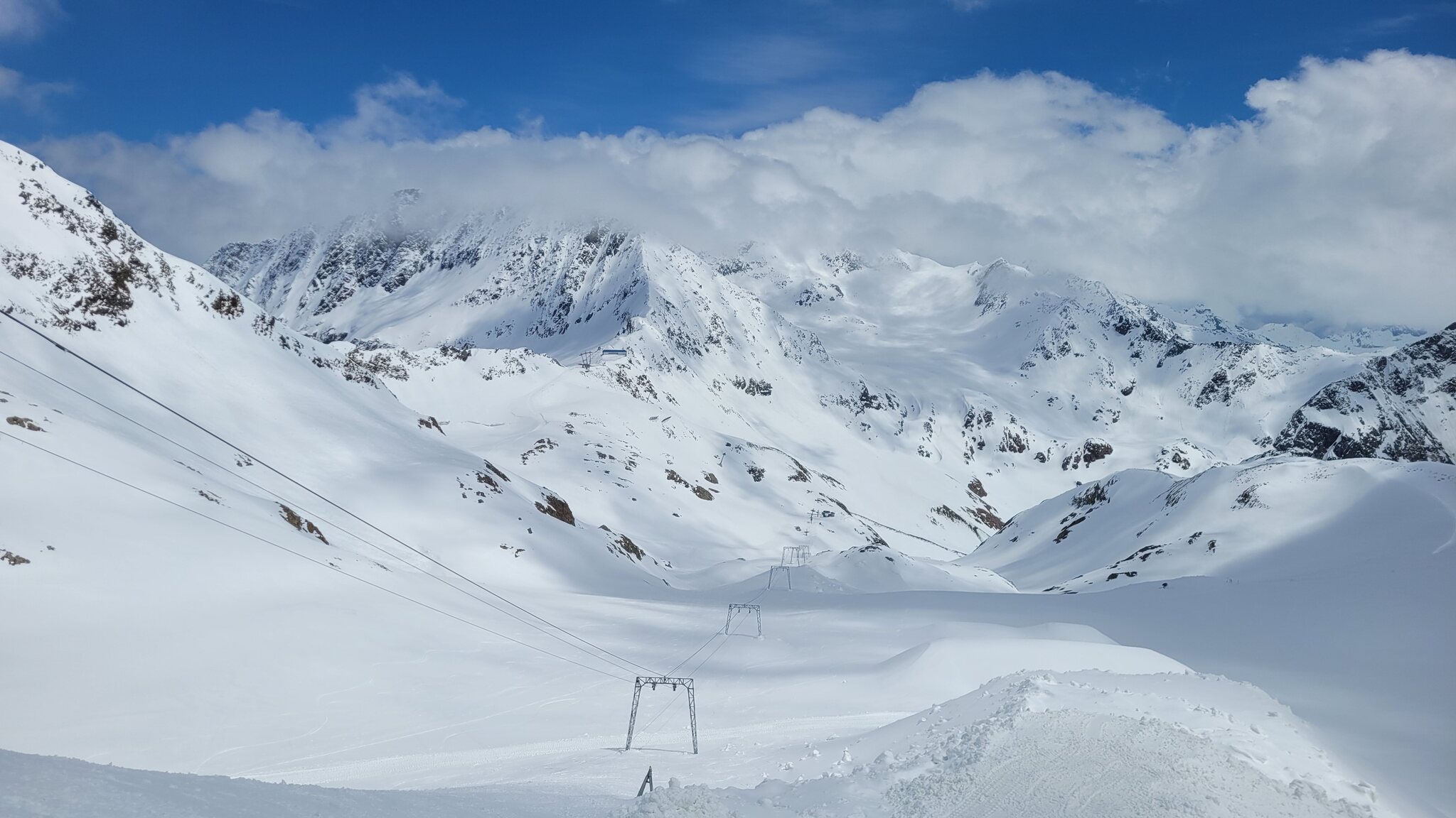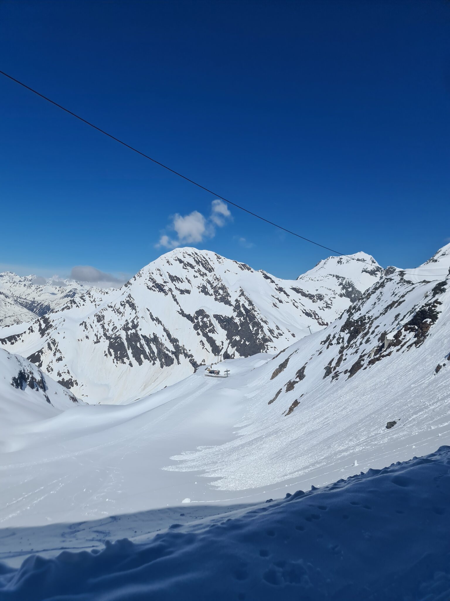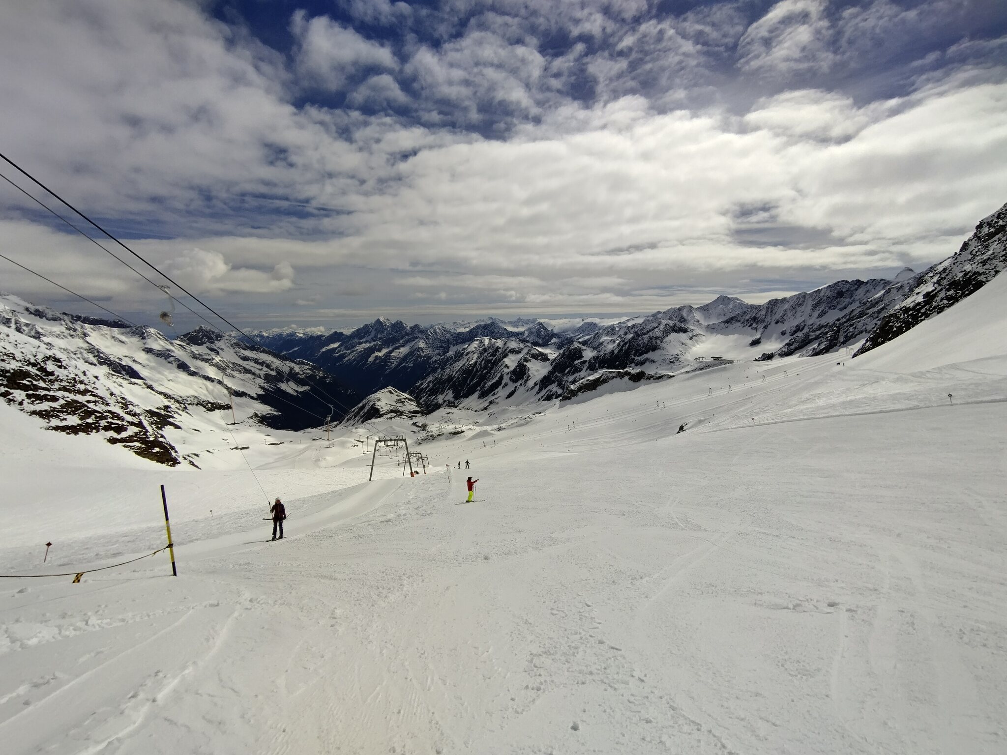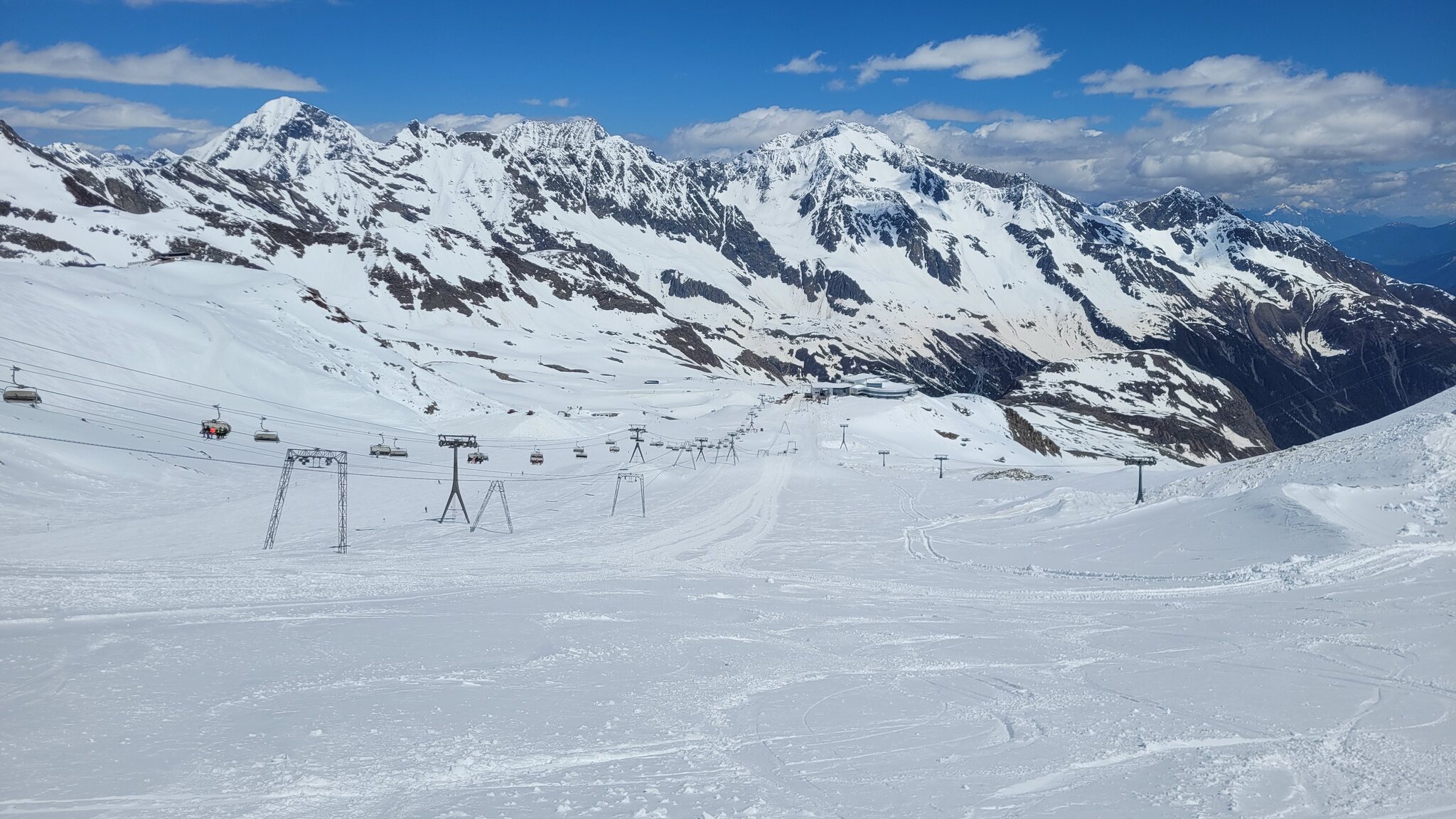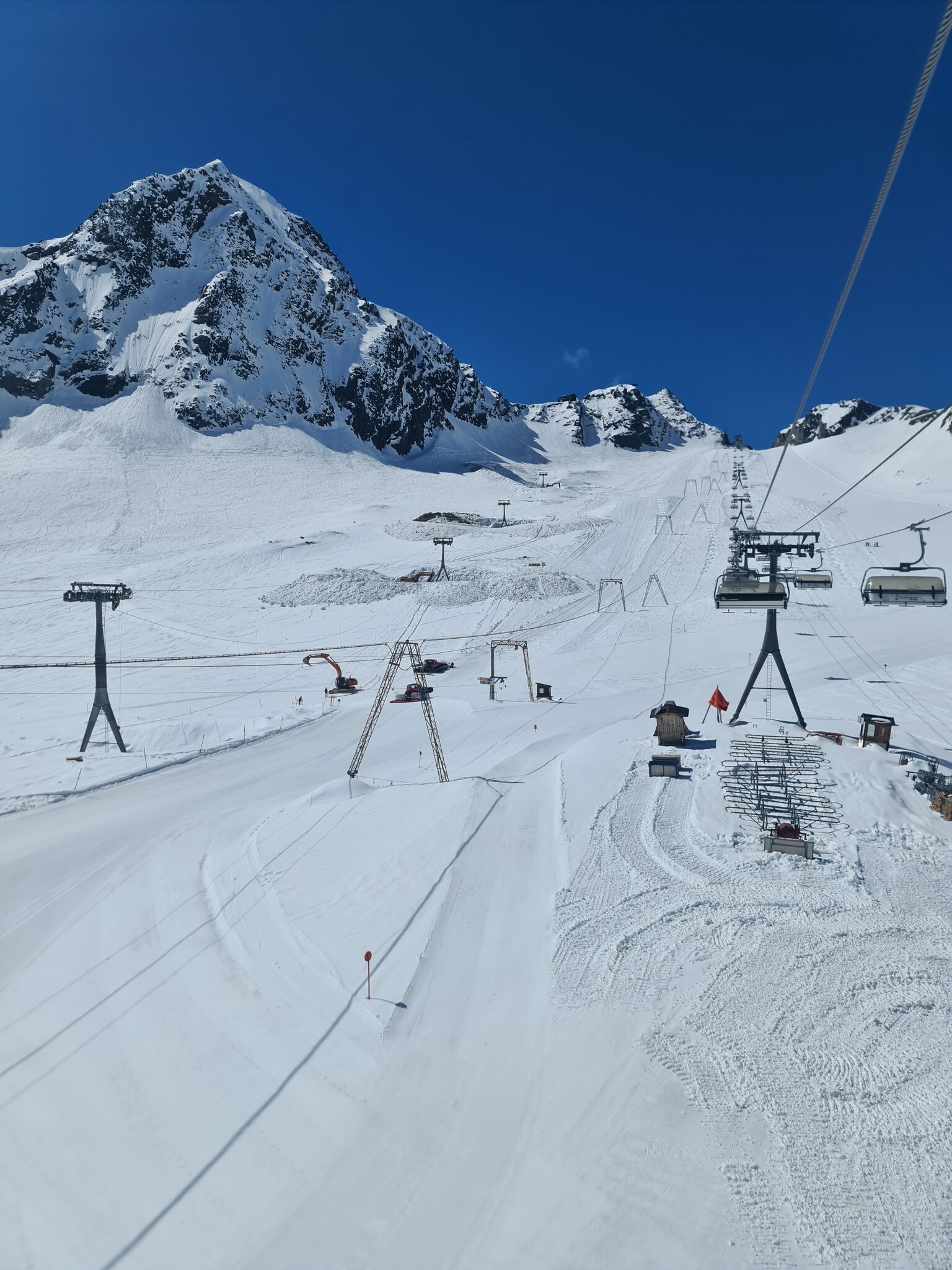 Heute war noch mal gutes Wetter gemeldet und meine Vignette von Auffahrt war auch noch gültig, daher ging es heute nochmal auf den Stubaier Gletscher. Am Morgen gab es unten eine lange Schlange an der 6er-EUB, die nur suboptimal befüllt wurde. Letztes Jahr um die Zeit war das kein Thema mit der 3S-Bahn. Aber oben war Kaiserwetter: