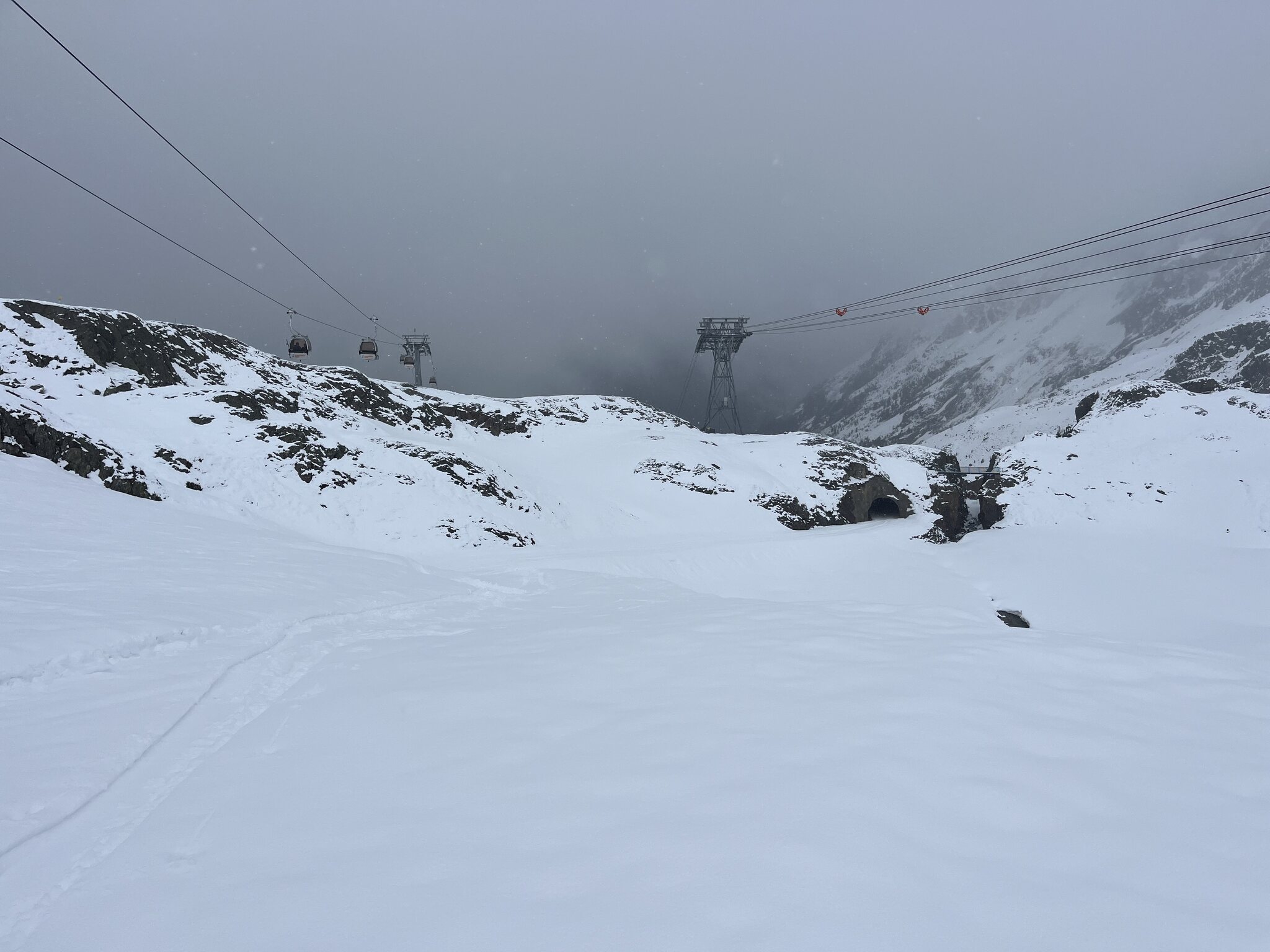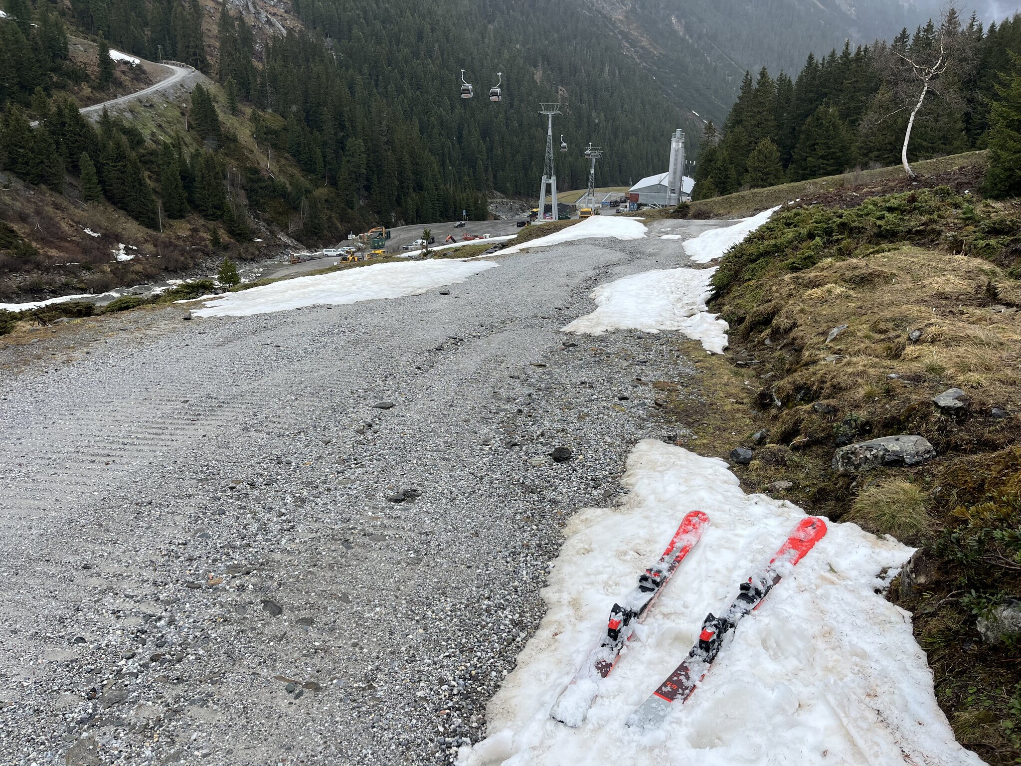 Start bei der Mittelstation: Sogar im Tunnel liegt noch genügend Schnee: Na dann wollen wir mal: Gut ist dieser Fahrweg so steil. Der Neuschnee ist bremsig: Hier wird es erstmalig etwas kritisch: Blick zurück: …und nach vorne: Hier, wo kein Neuschnee mehr liegt, ist es eigentlich einfacher. Vorher wusste man nie, ob unter dem bisschen Schnee grad Kies oder Steine lauern: Noch findet sich ein Weg: Erstes Mal ganz kurz anschnallen: Zweites Mal abschnallen, auch nicht weit: Erst hier, also wirklich am Parkplatz unten ist Schluss: Das hat wirklich Spass gemacht!