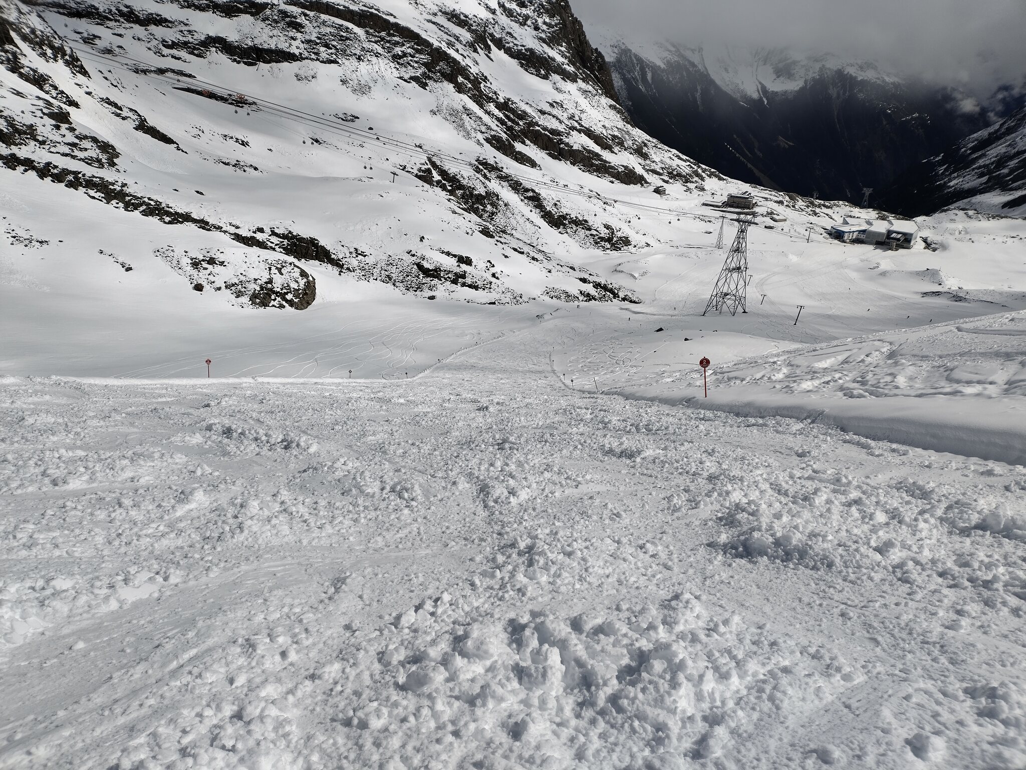 Apropos Lawinen: Nassschneelawinen gingen von allen halbwegs steilen Hängen ab. Dieser hat sogar die neue blaue Piste an der Rotadlbahn erwischt, diese wurde danach gesperrt.