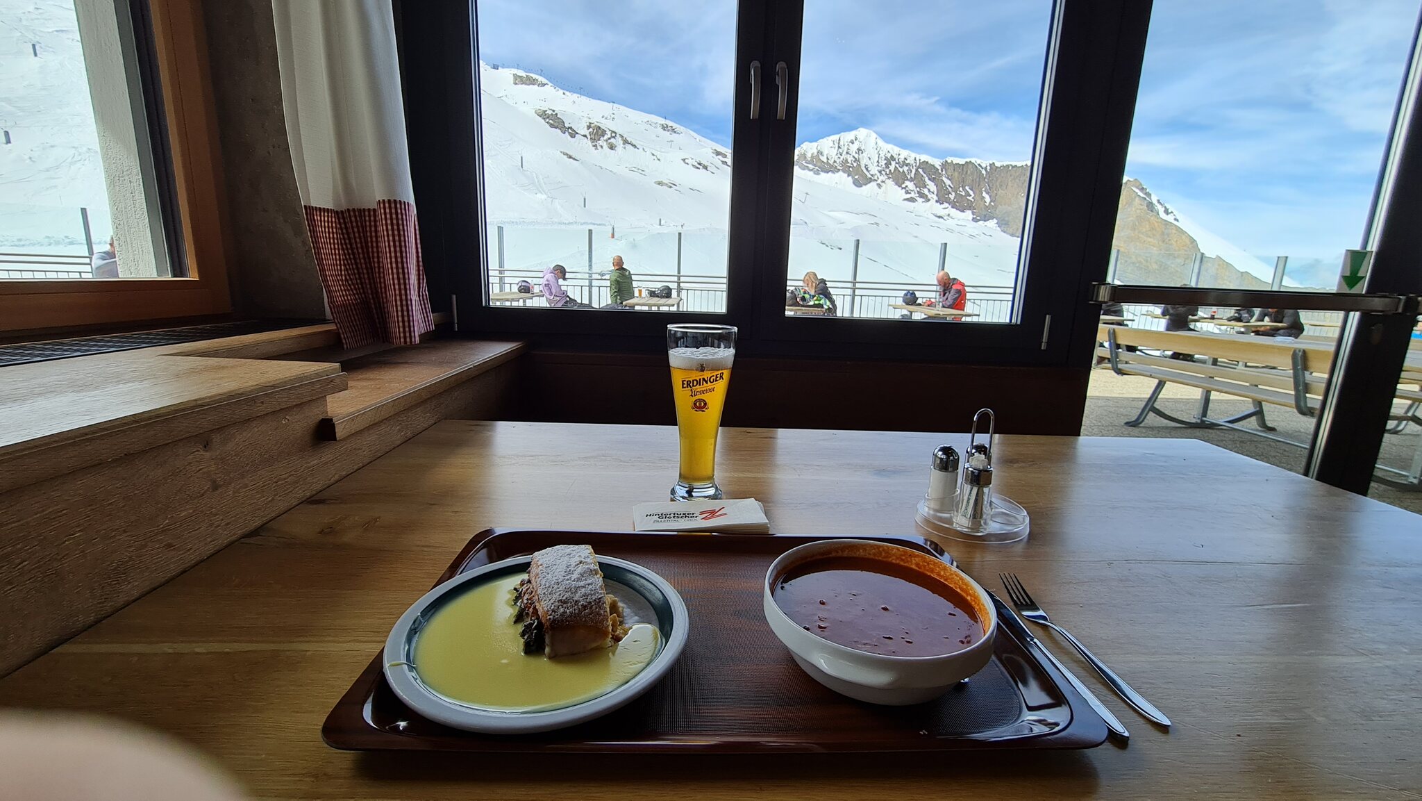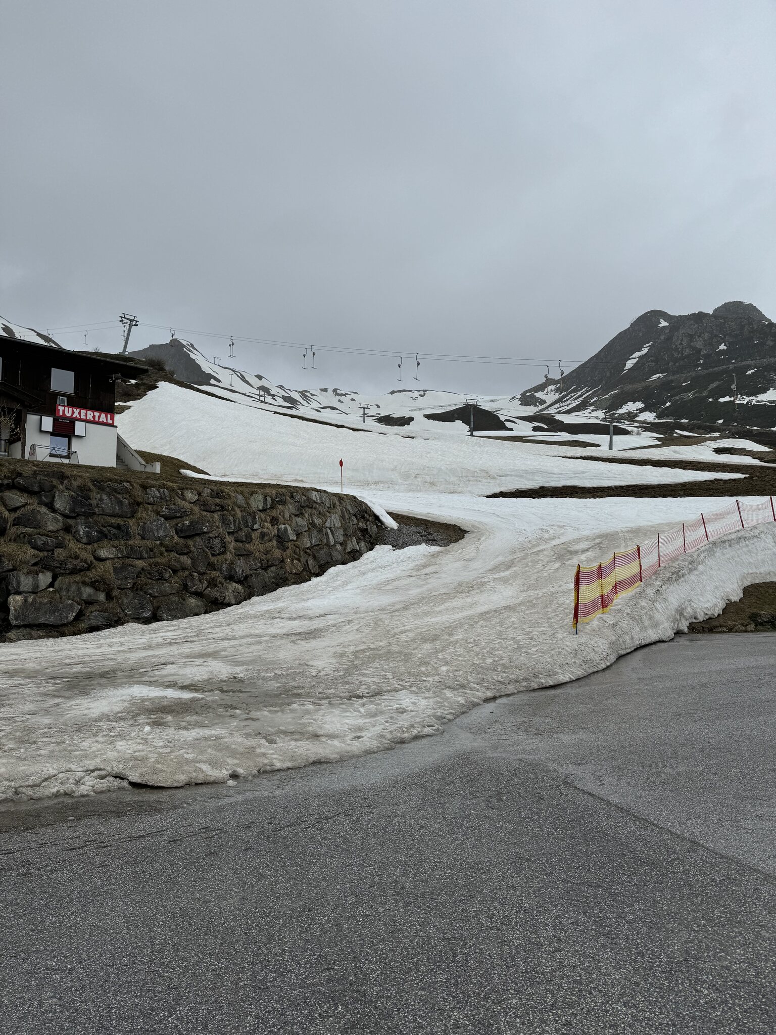 Um kurz nach 4 bin ich daheim losgefahren und war um 8 an der Talstation in Tux. Es war bis auf ein paar Rennteams nichts los. Es gelten bereits die Sommertarife, ich habe 50€ gezahlt.