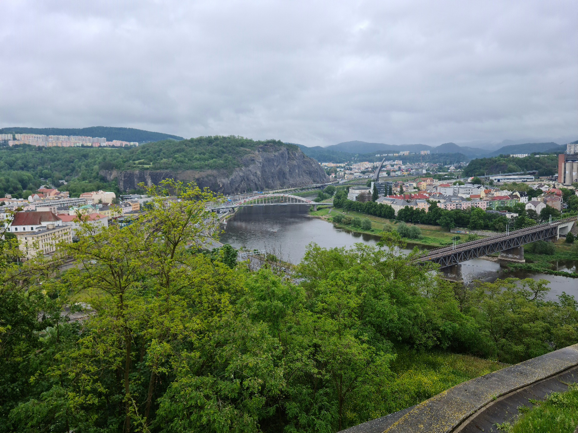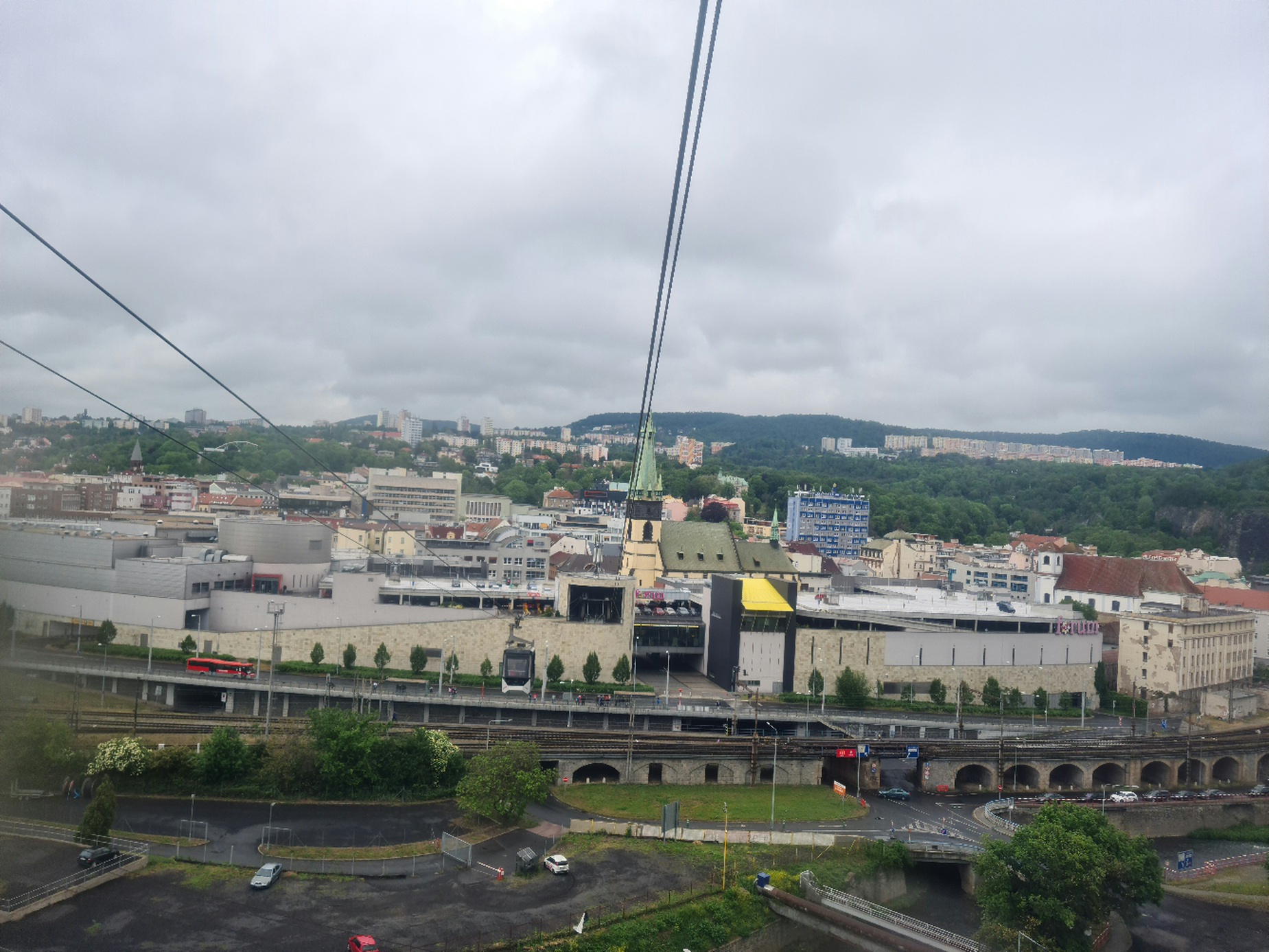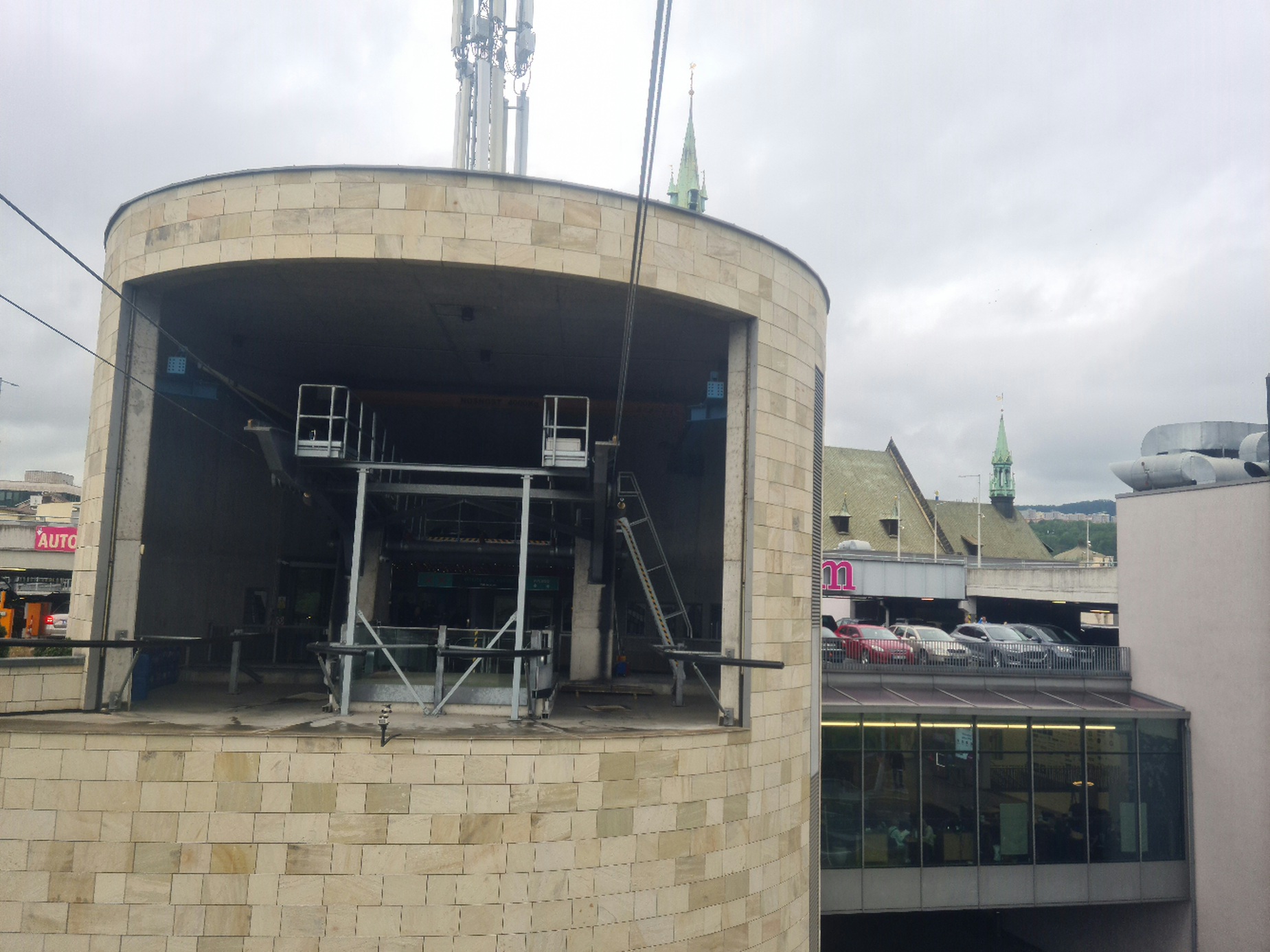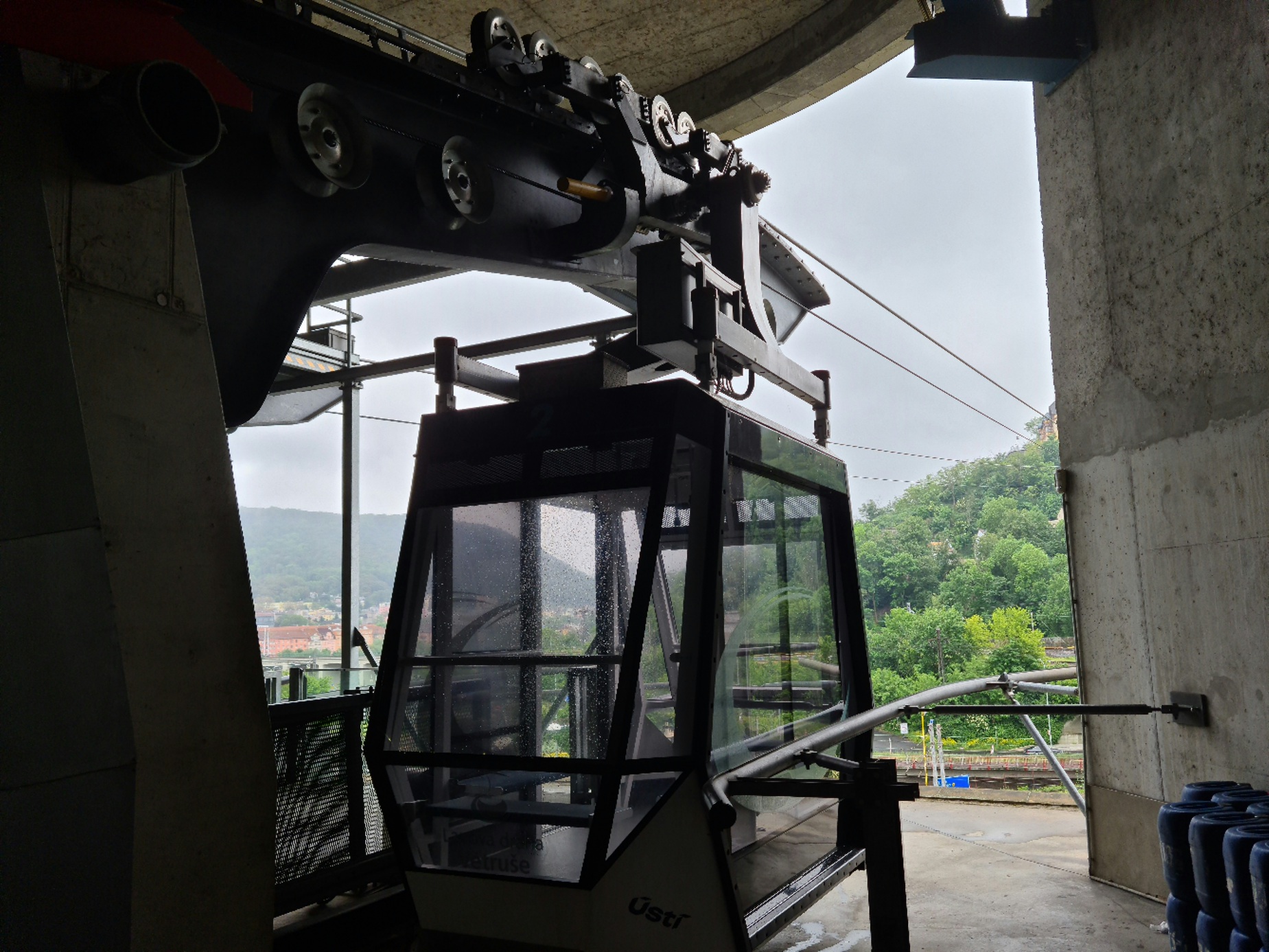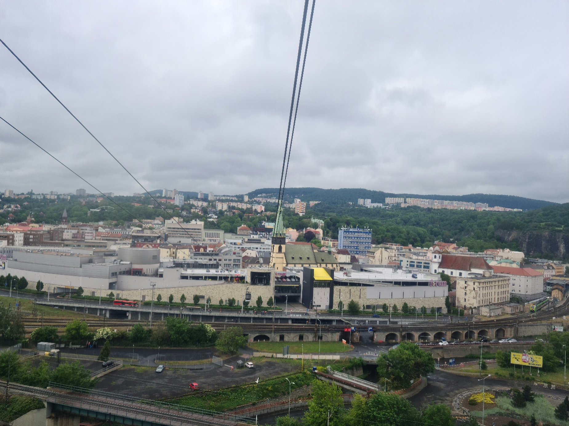 Eigentlich war der Plan, am Vormittag die VR101- Sesselbahn in Krupka zu nehmen, und anschließend nach Prag zu fahren. Doch knapp oberhalb von Krupka war bereits alles im Nebel, sodass ich umdenken musste. Schnell ist dann aufgefallen, dass man an der Abfahrt Türmitz abfahren und dann weiter nach Aussig fahren kann, und dort dann auf ein großes Einkaufszentrum trifft. Doch aus diesem hinaus führt auch eine kleine Pendelbahn von Bartholet, welche ihre etwas über 300m lange Strecke stützenlos überwindet. Auch wenn die technischen Daten nicht beeindrucken erschließt die Pendelbahn einen schönen Aussichtspunkt, wobei ihr Hauptzweck wohl die schnelle Verbindung mit dem obenliegenden Hotel ist. Sie fährt im Viertelstundentakt, sodass sie ihre Förderleistung von 360 p/h nicht annähernd erreicht. Doch auch die 60 p/h reichen oft aus, bei Bedarf werden dann aber doch Zwischenfahrten eingelegt.