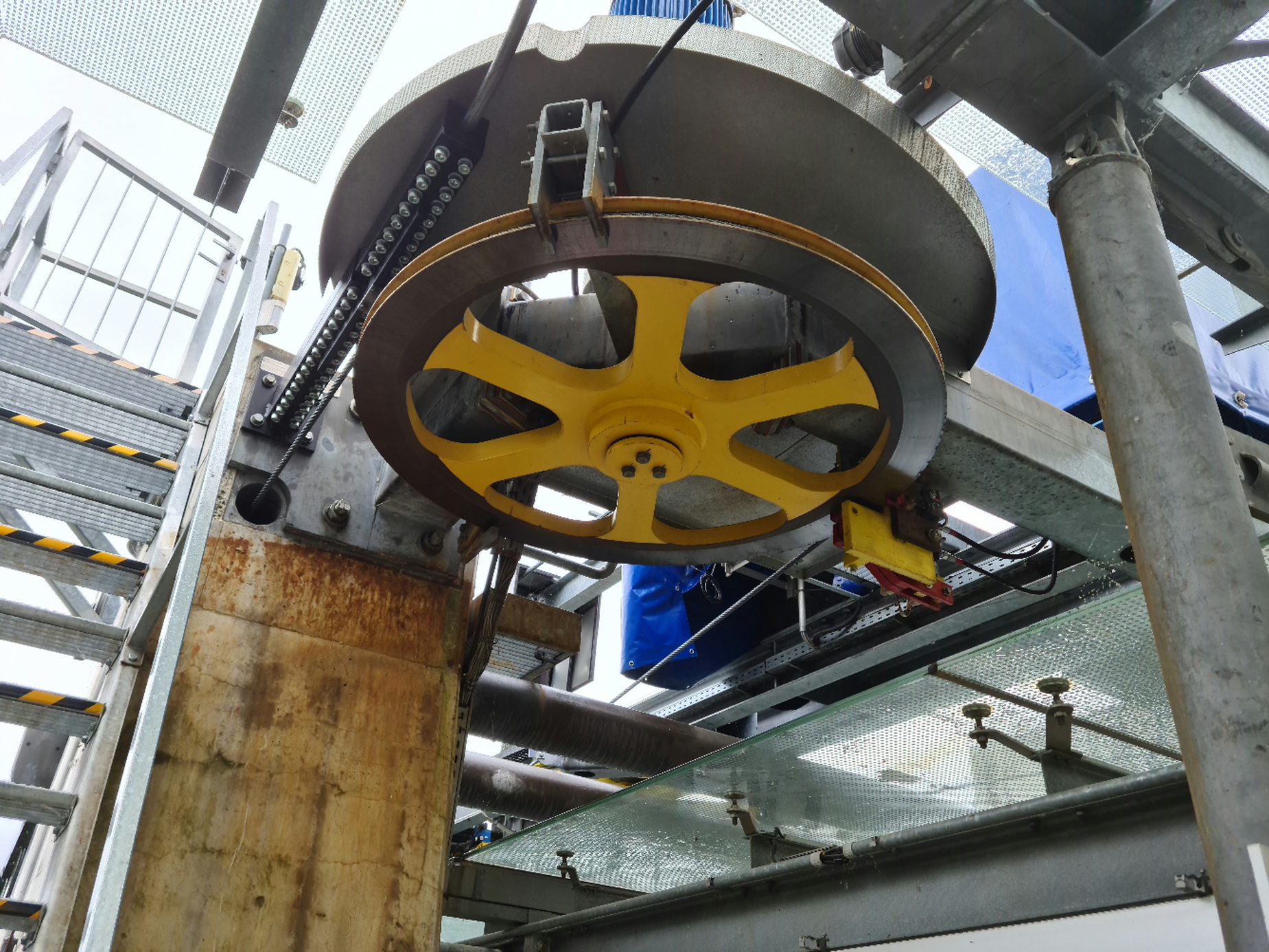 #14- In der Bergstation angekommen, sieht man schnell den Betonsockel, auf dem die Umlenkscheibe steht.
