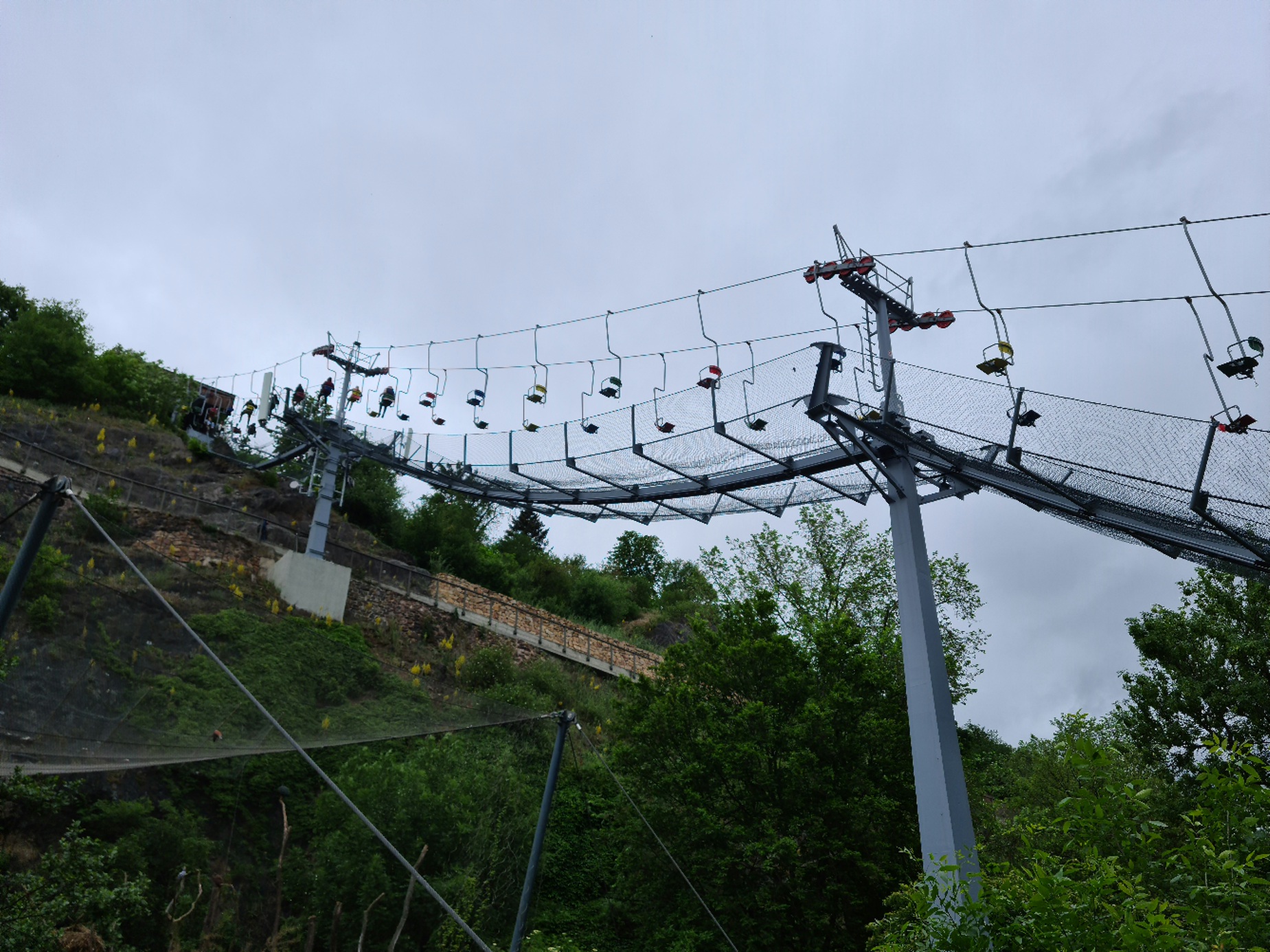 #12- Blick auf den Großteil der Trasse. Interessant ist das Netz, was auf geschätzt 90 der 106m angebracht ist. Aber es ist sinnvoll, denn wenn größere Gegenstände/Menschen runterfallen würden, würden diese sonst im Vogelkäfig oder auf dem Gehweg landen.