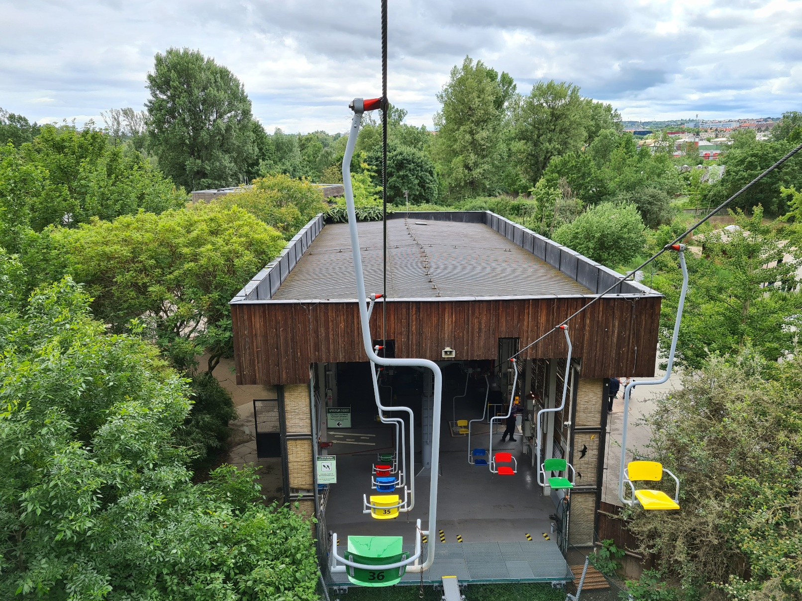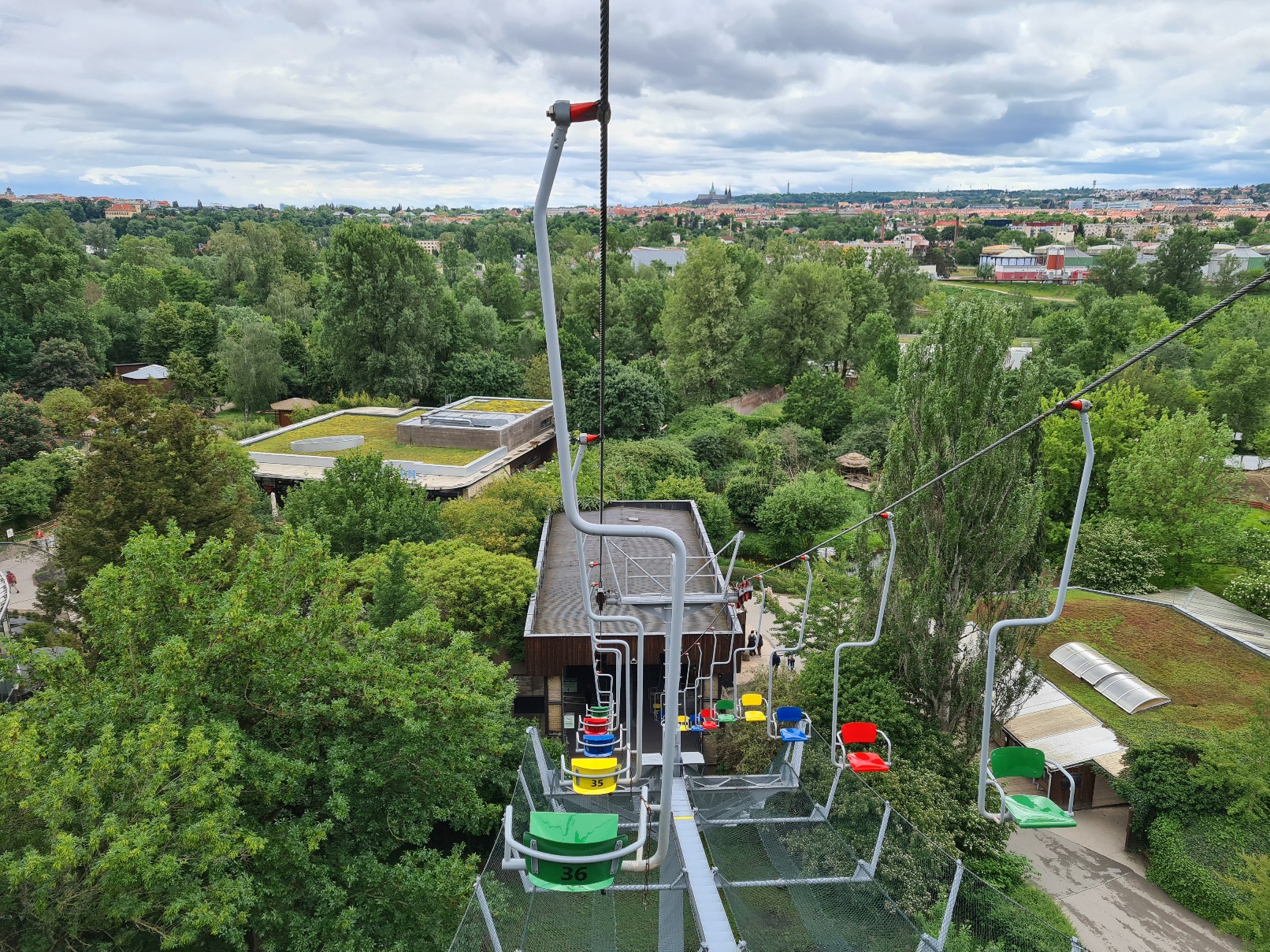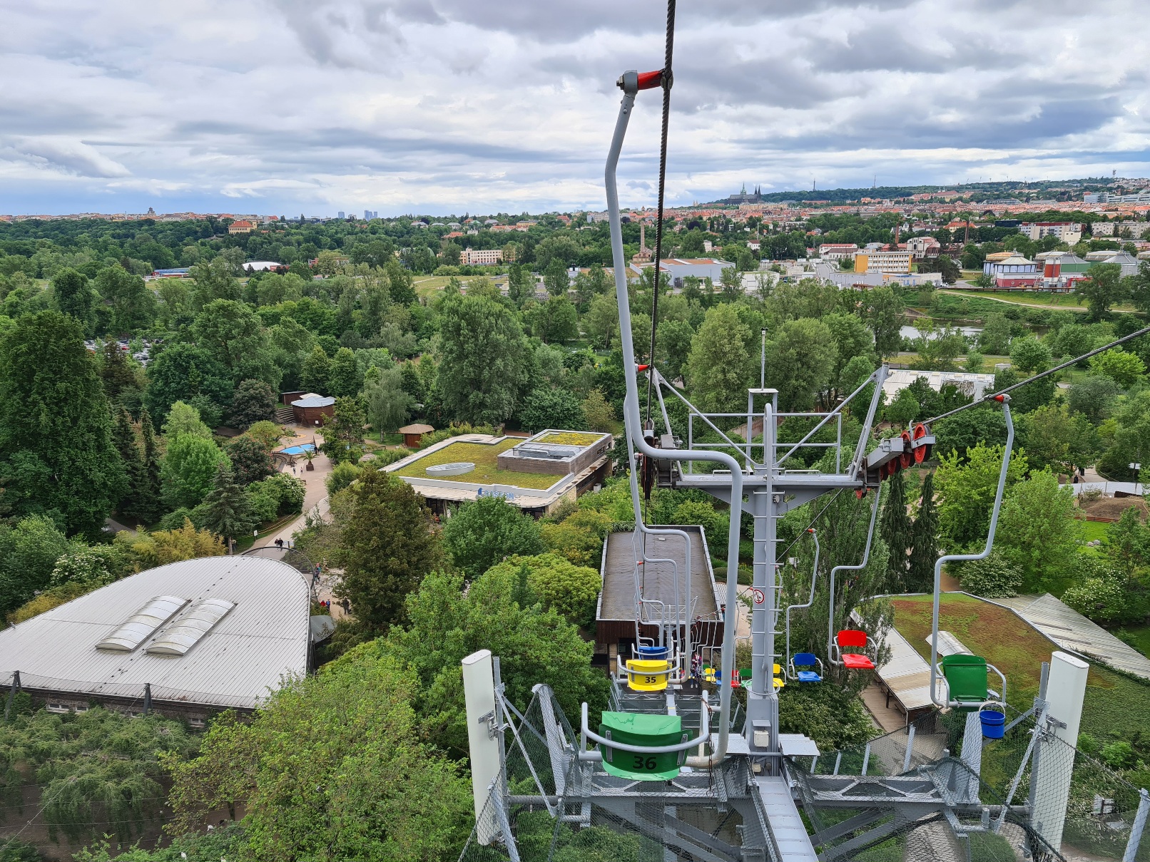 Anschließend fuhr ich weiter nach Prag. Dort ging es zunächst zum Zoo, wo seit 1977 die 1970 von Transporta Chrudim gebaute Einersesselbahn ihre Runden dreht. Scheinbar wurde sie tatsächlich nach ihrem Bau 7 Jahre ungenutzt stehen gelassen, bevor man sie dann in Betrieb nahm. Seitdem ist sie mit ihren steilen 50 Höhenmetern auf 106m Länge auch wegen ihrer tollen Aussicht eine beliebte Attraktion im Zoo, was sich auch in der Förderleistung von 720p/h widerspiegelt. Zusammen mit der langsamen Fahrgeschwindigkeit von 0,85 m/s sorgt sie für einen äußerst geringen Sesselabstand, sodass die Bahn über 50 Sessel hat. Die Fahrt kostet pro Richtung 40 Kč, was etwa 1,60€ sind.