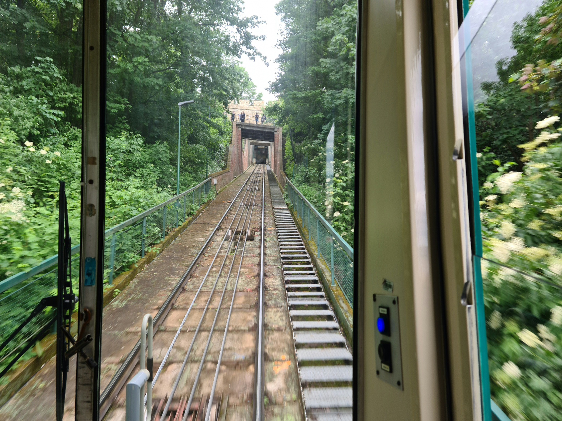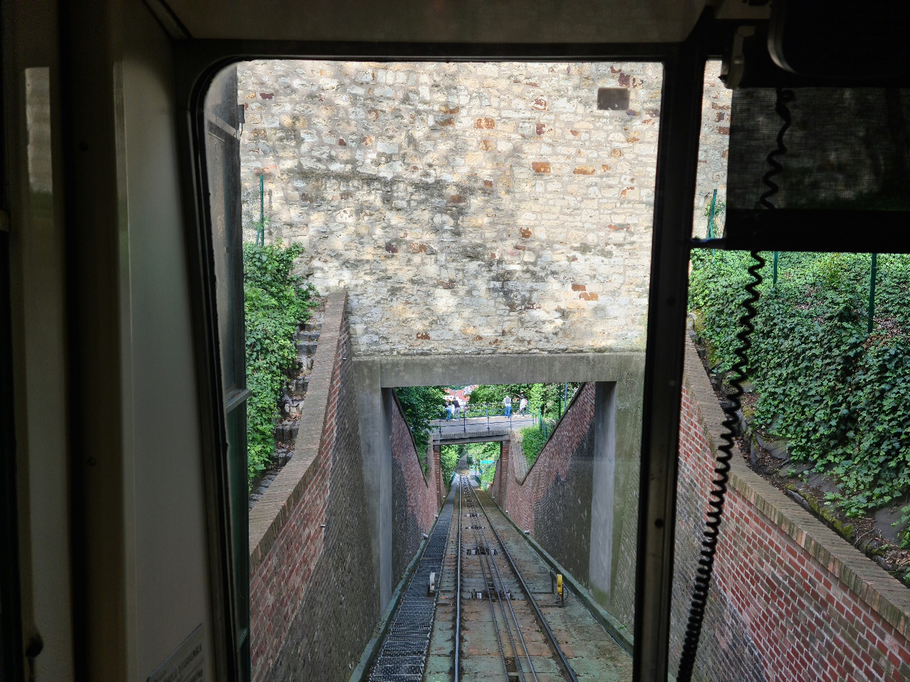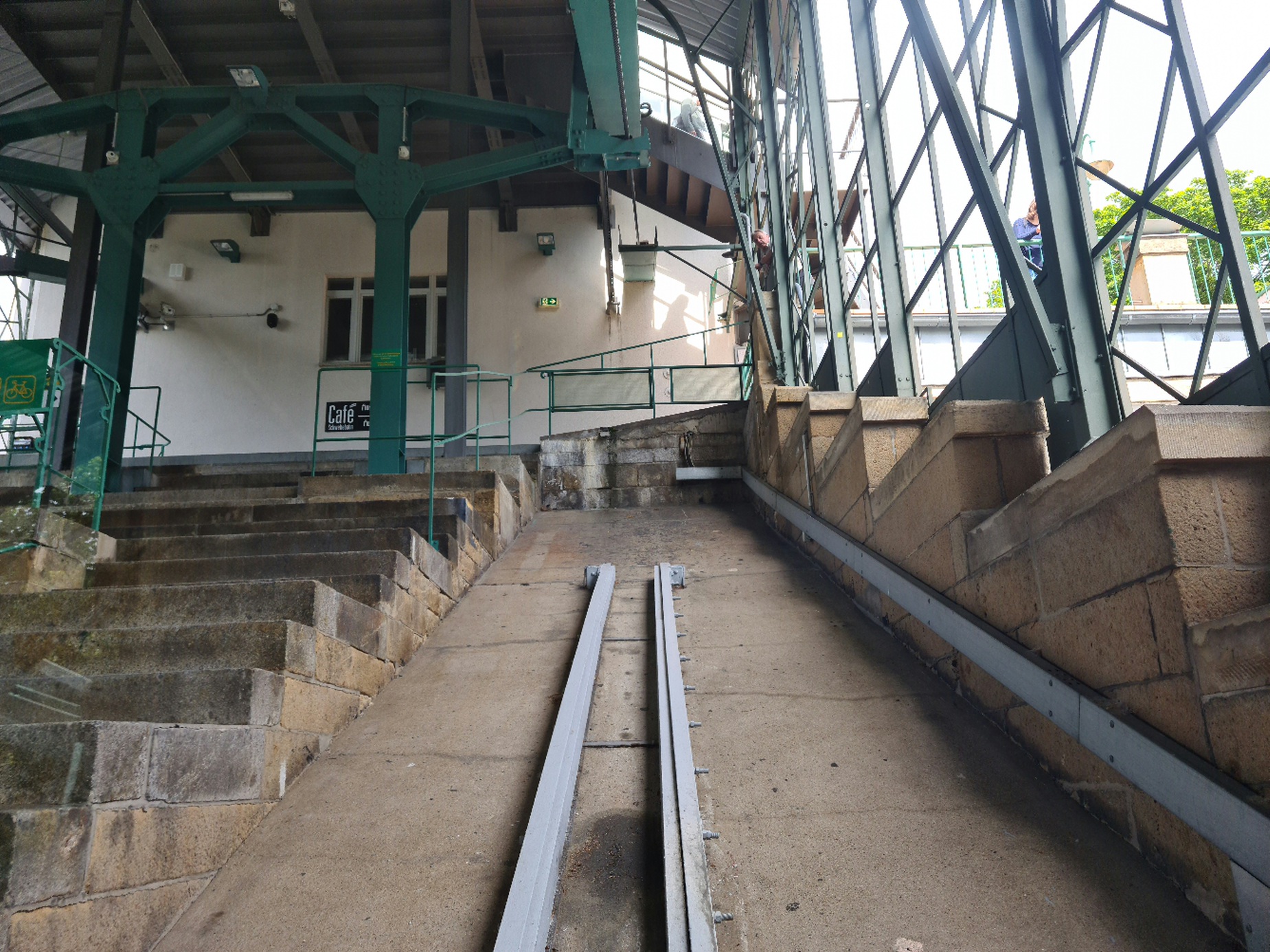 #20- In der Standseilbahn. So wie ich die Seilführung verstehe, sind die inneren Seile Führungsseile für die Weiche in der Mitte, links ist das Zugseil zu erkennen, rechts wäre es auch, da das Zugseil an den beiden Wagen endet, sieht man den rechten Teil nicht.
