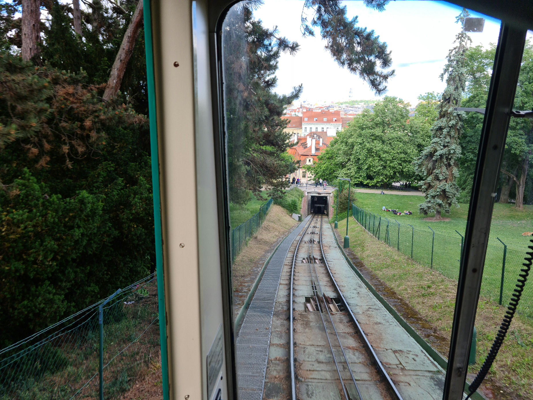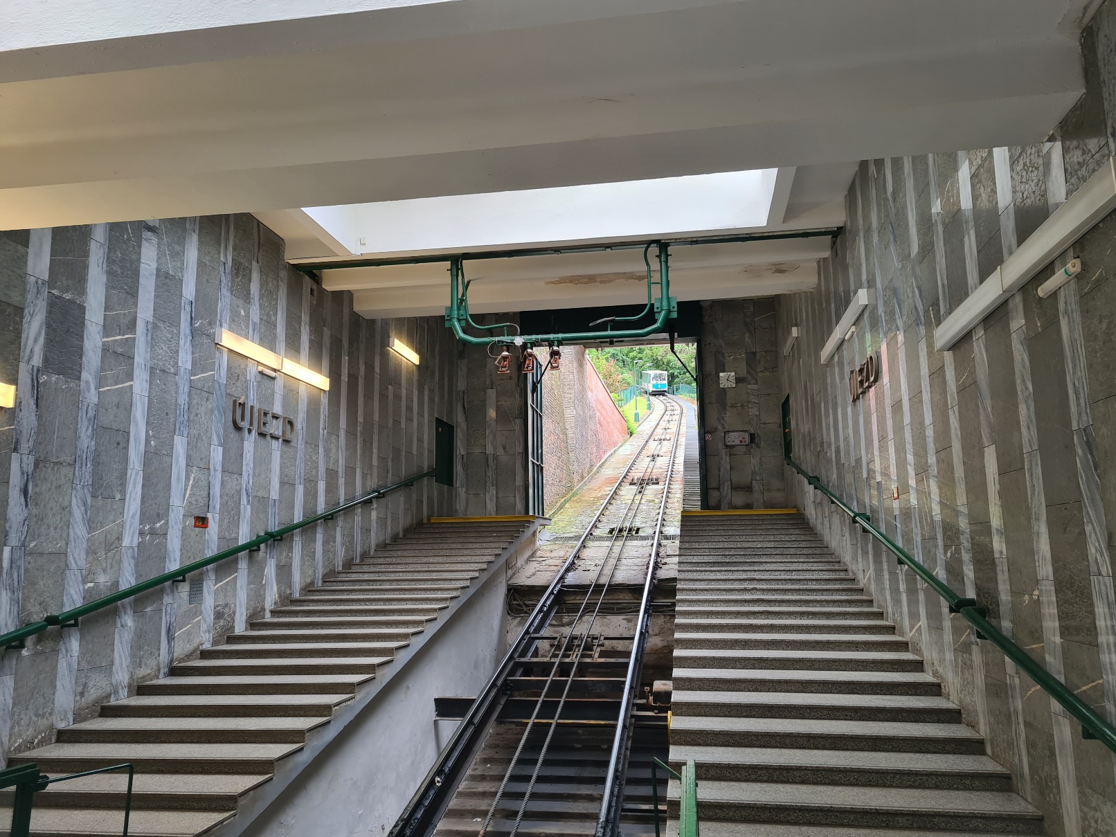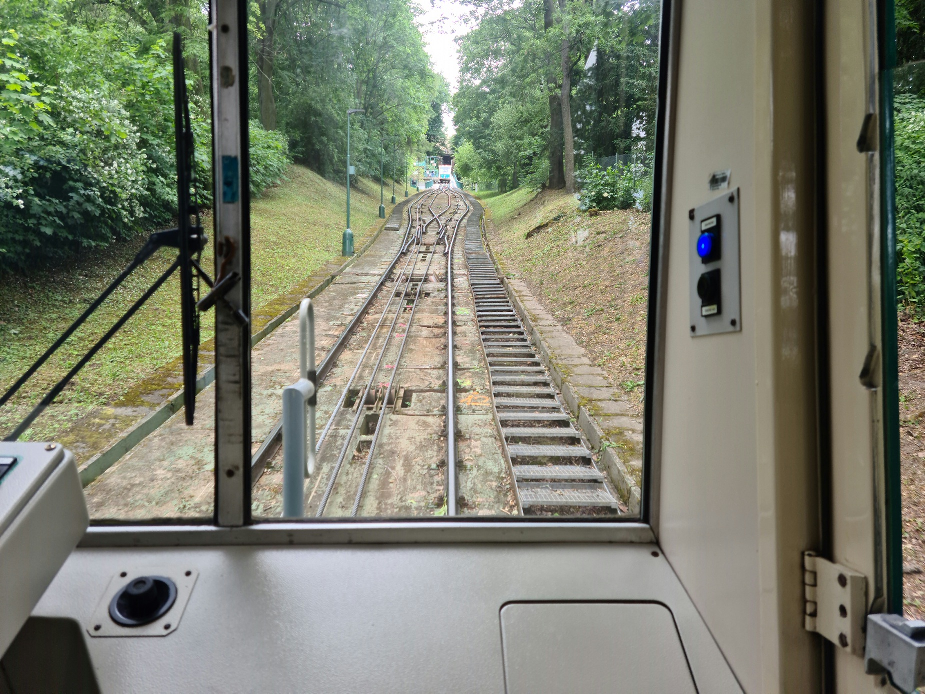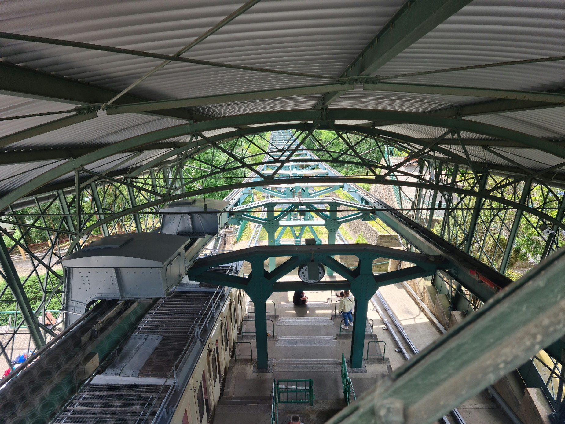 #20- In der Standseilbahn. So wie ich die Seilführung verstehe, sind die inneren Seile Führungsseile für die Weiche in der Mitte, links ist das Zugseil zu erkennen, rechts wäre es auch, da das Zugseil an den beiden Wagen endet, sieht man den rechten Teil nicht.