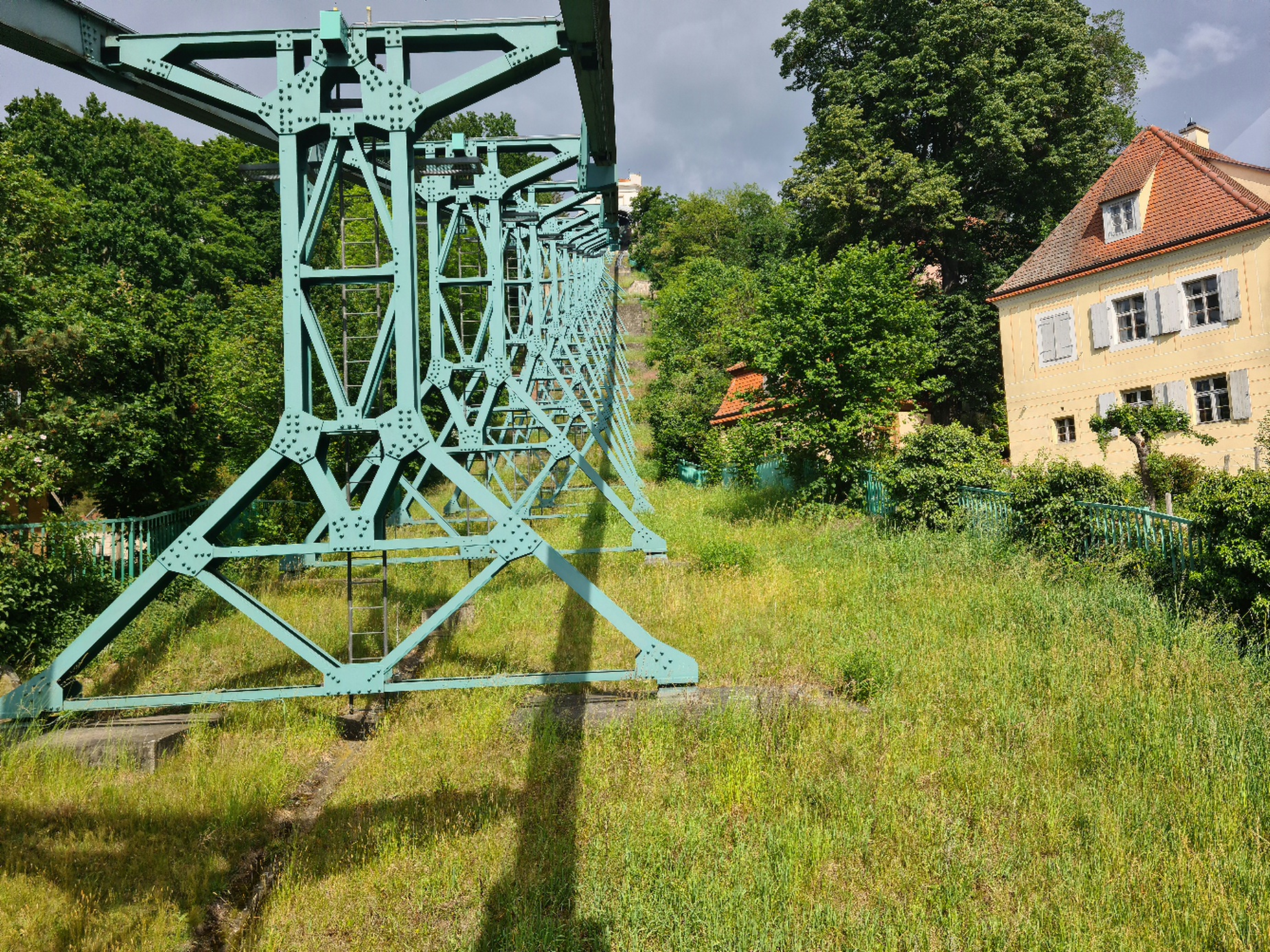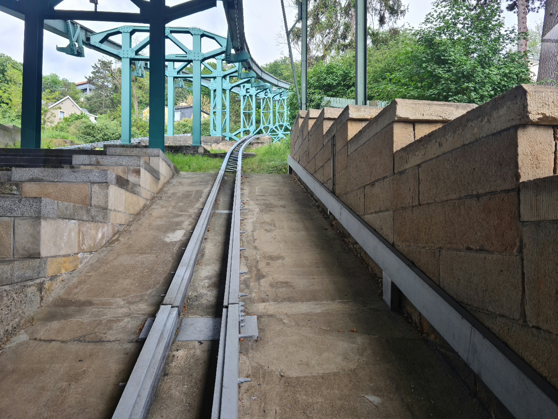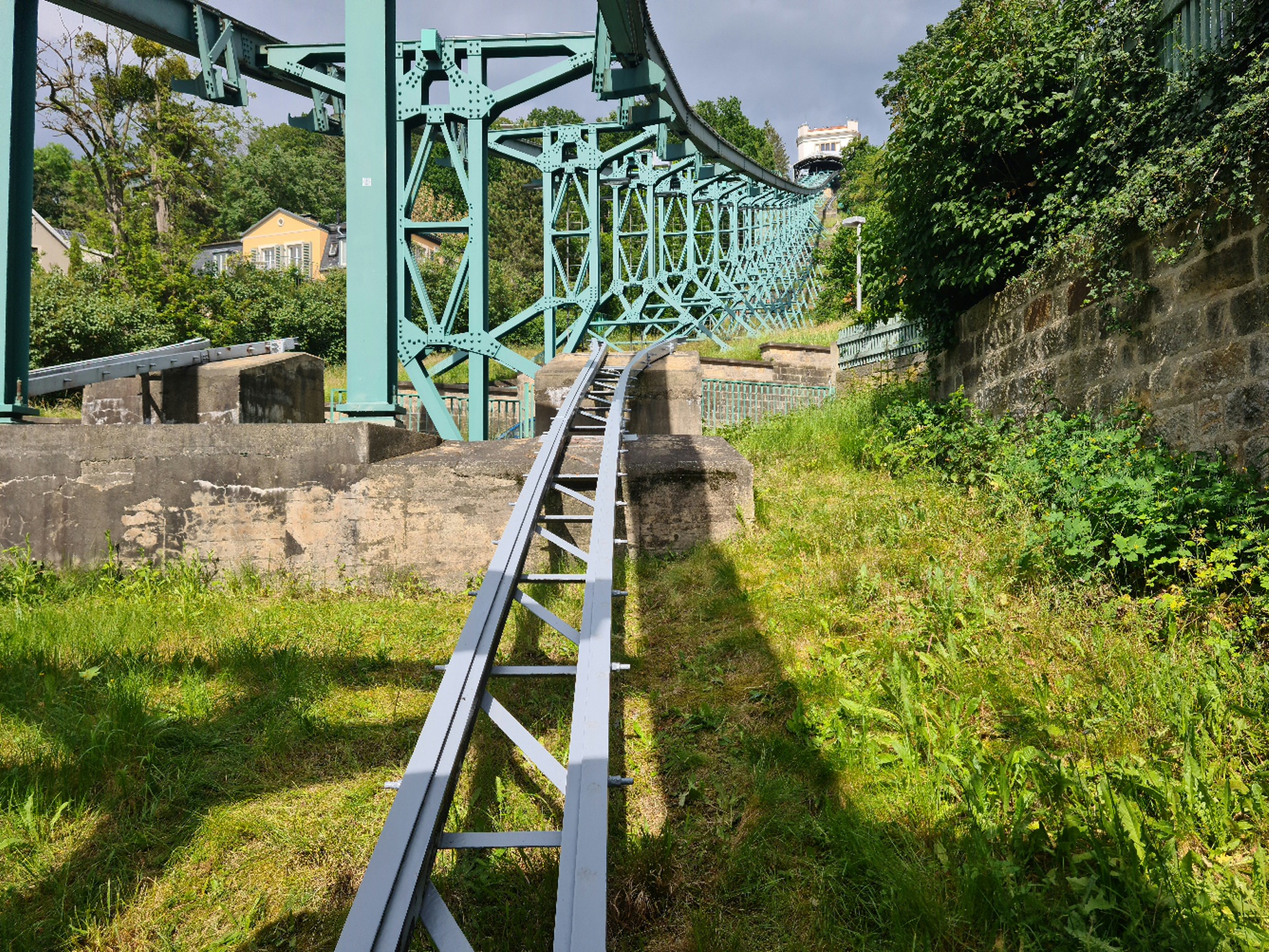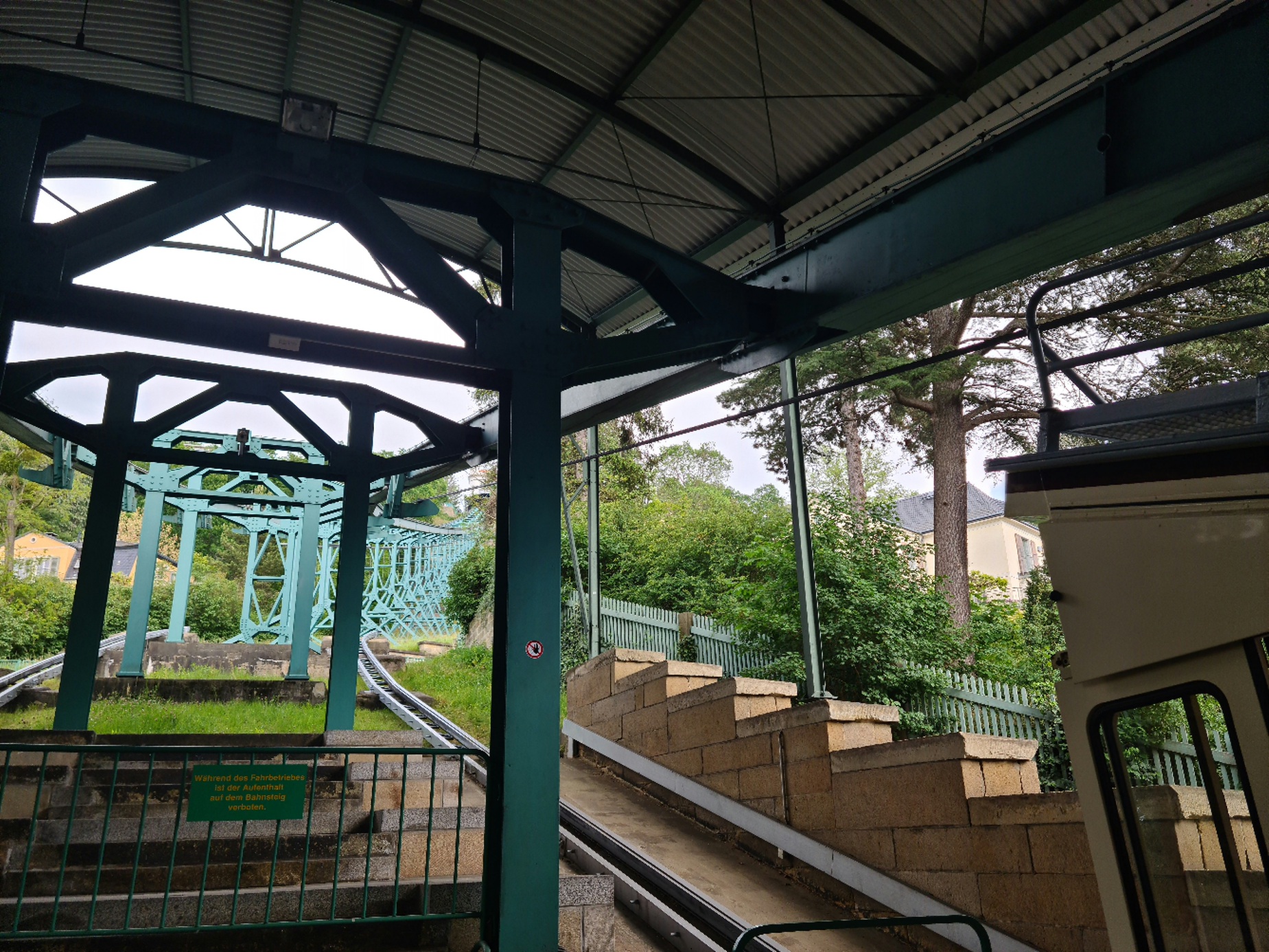 Am nächsten Tag ging es dann nach Dresden. Dort wartet die 1901 gebaute Schwebebahn darauf, gefahren zu werden. Sie ist die wohl einzige Bahn ihres Typs, ist aber anders als die Schwebebahn in Wuppertal tatsächlich eine Seilbahn, denn sie hat ein Zugseil. Ihre Trasse hat unten eine Kurve und wird kontinuierlich steiler. Die Bahn fährt mit einer geringen Geschwindigkeit und ist wohl vorrangig eine Aussichtsbahn. Eigentlich hätte es auch noch eine nahe gelegene Standseilbahn mit Baujahr 1895 gegeben, diese war jedoch wegen Revision geschlossen.