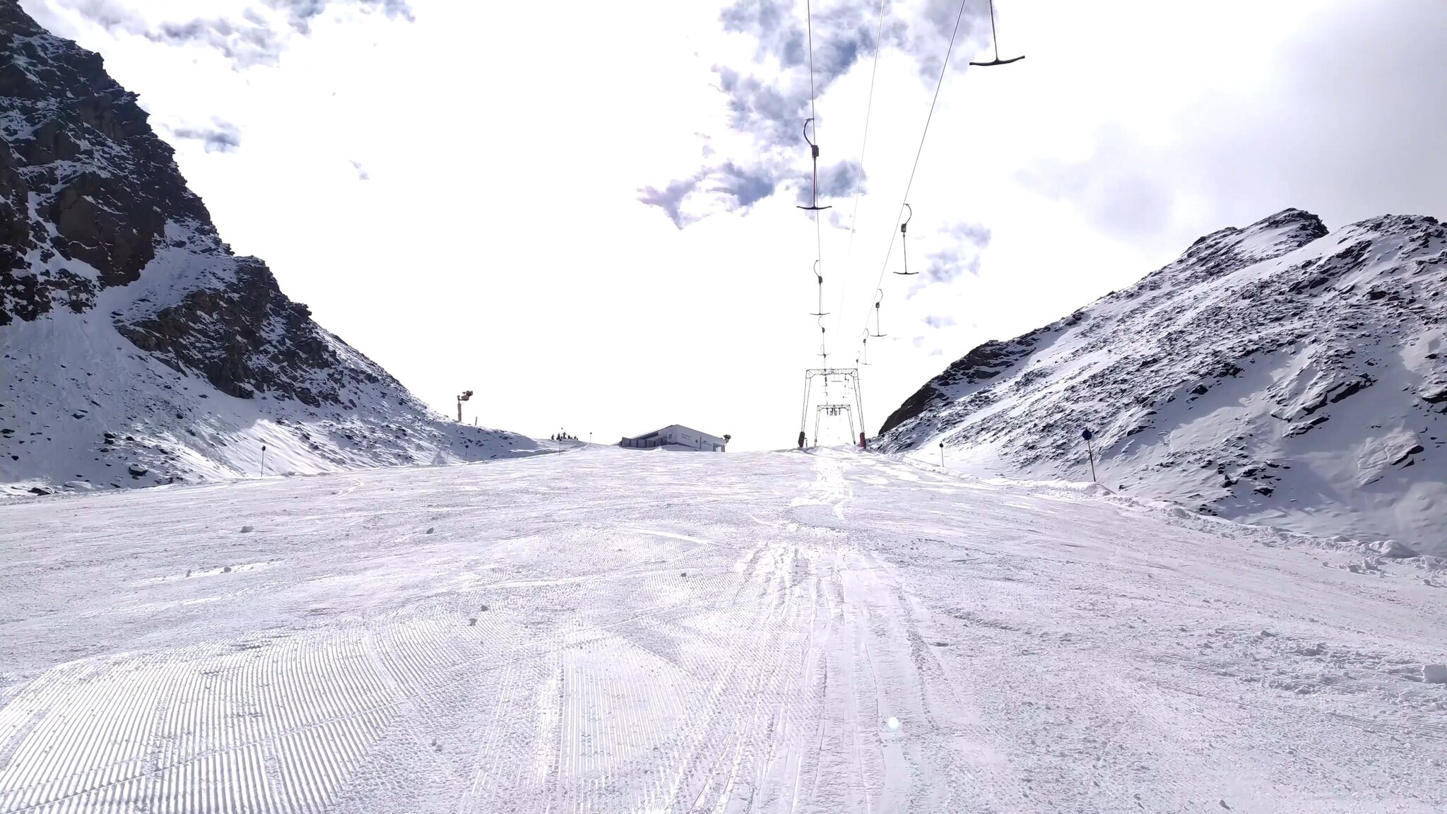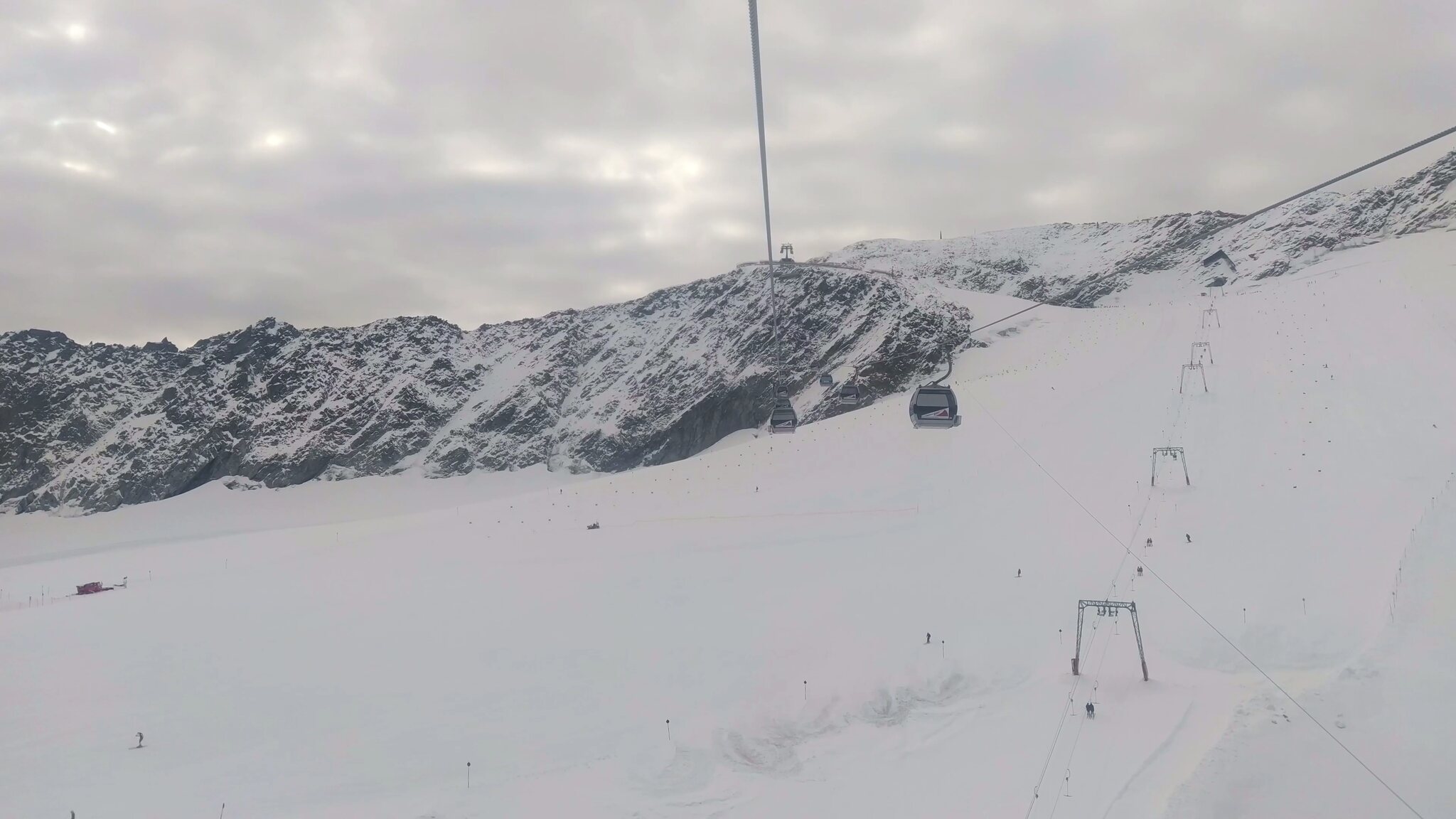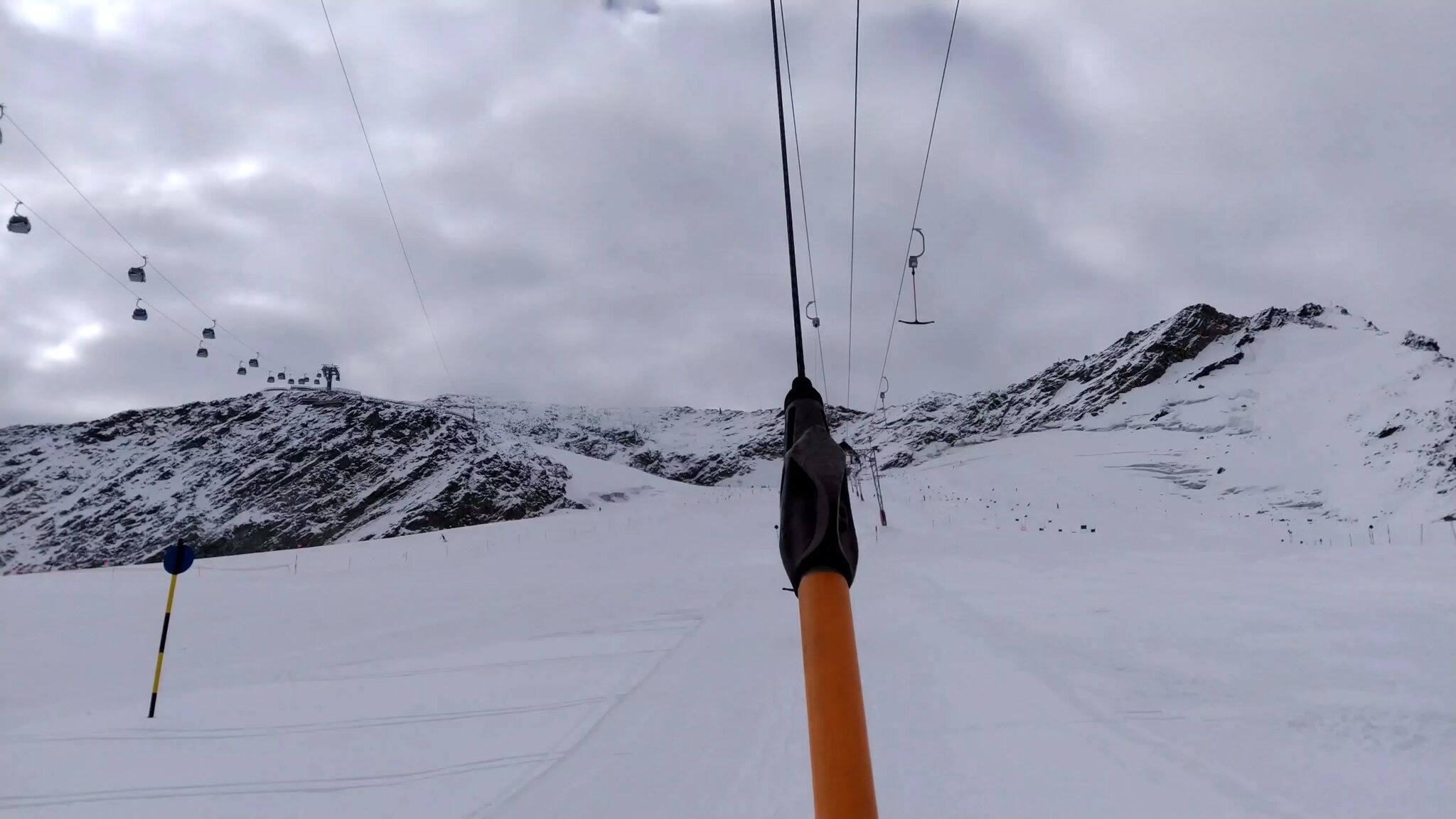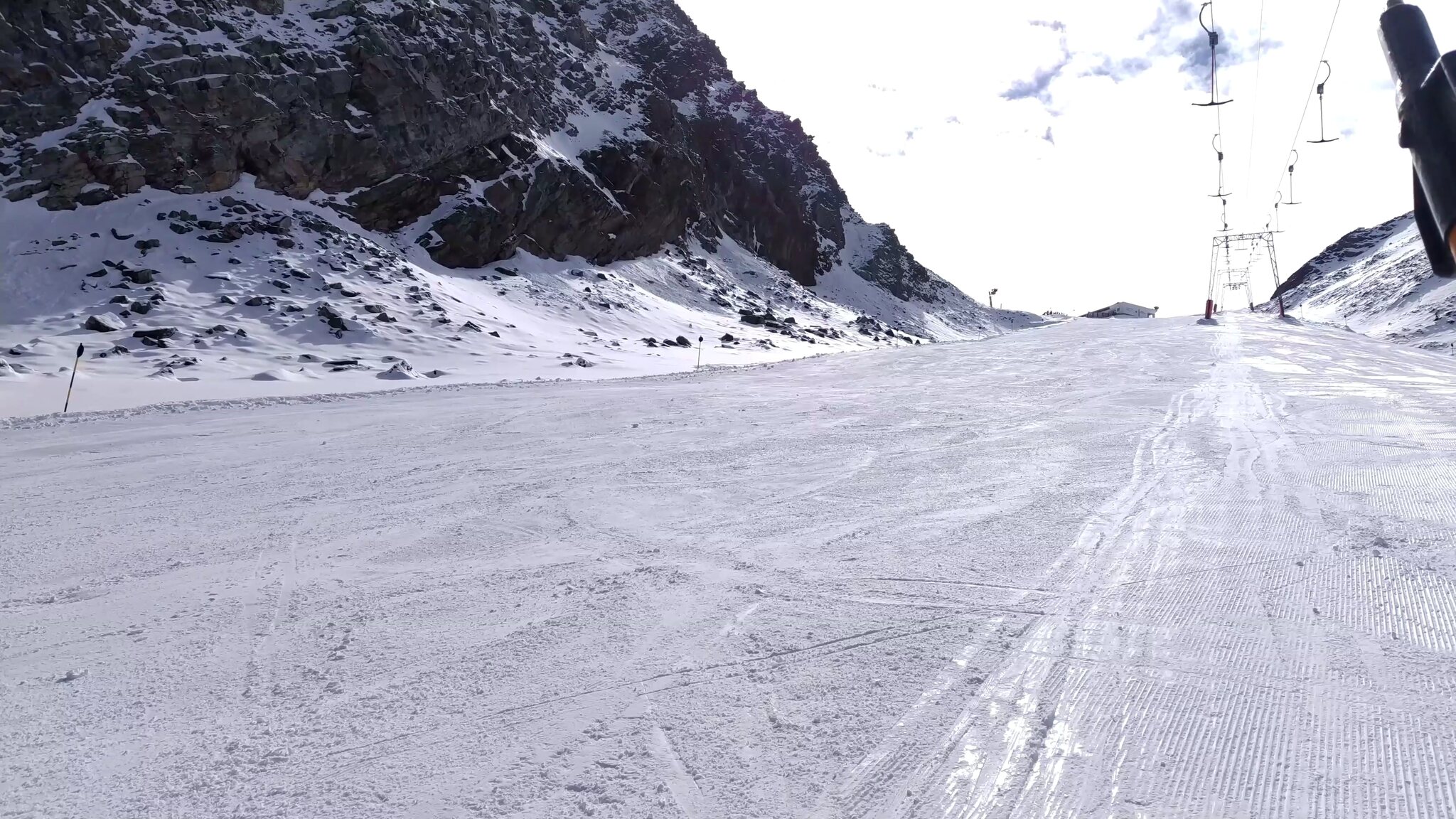 #19- Seitenblick zum Sl Mutkogl. Etwas weiter hinten ist auf dem Felsen ein verdächtiges Häuschrn zu sehen. Es handelt sich dabei um das alte Liftlerhäuschen des Schlepplifts Panorama, welcher 2017 wegen des Gletscherrückgangs leider stillgelegt wurde. Heute ust es kaum vorstellbar, dass dort jemals ein Schlepplift fahren konnte. Es bestehen aber Ersatzpläne, bei deren der Schlepplift Mutkogl bis zu seinem Zwischeneinstieg verkürzt würde.