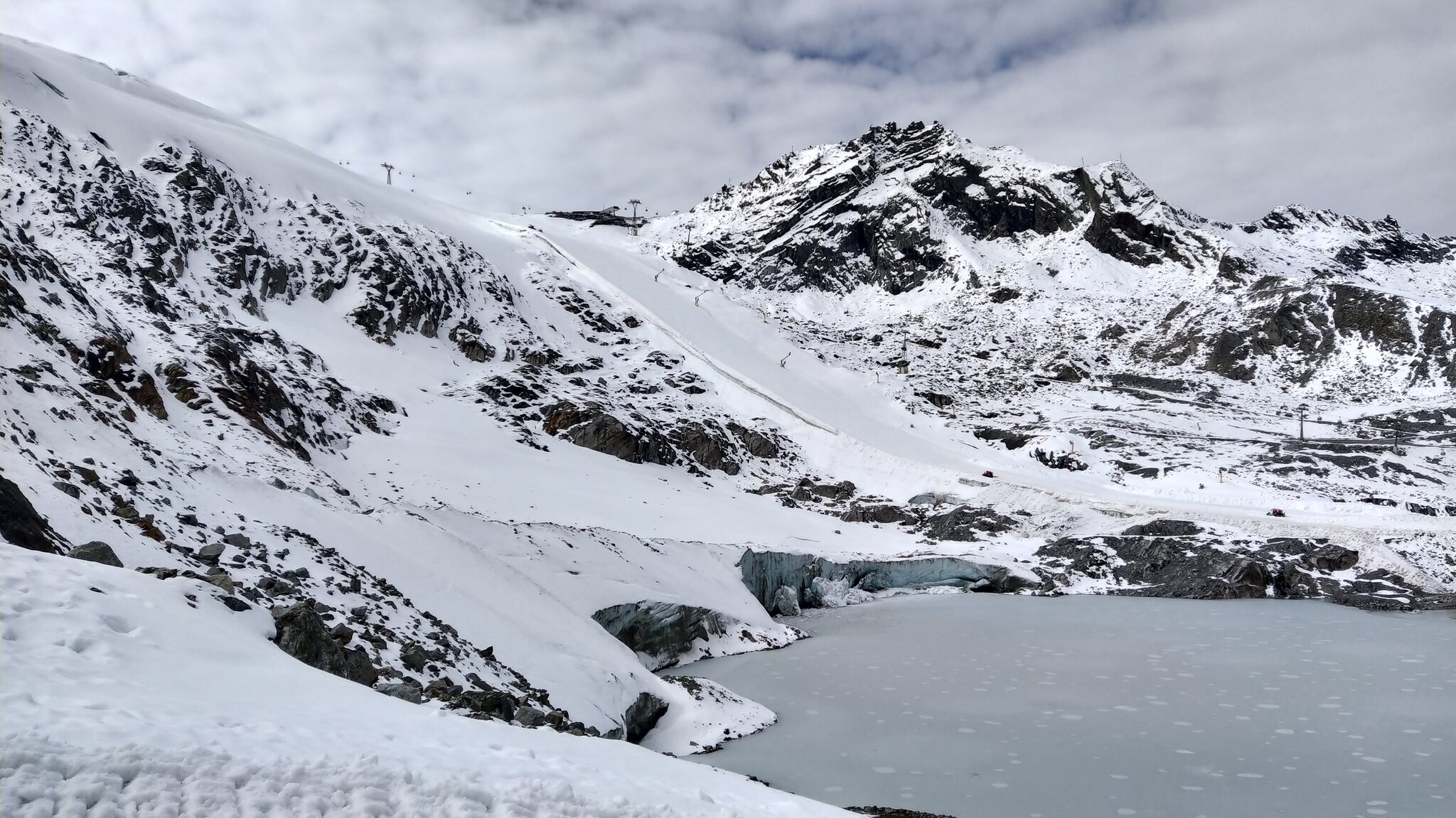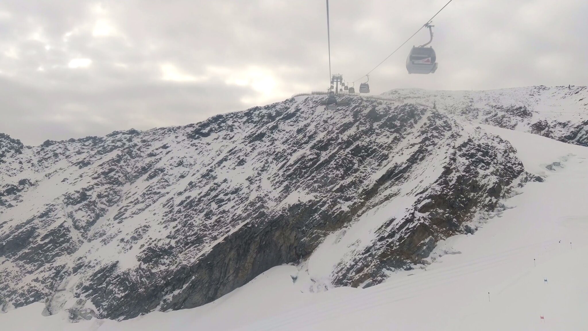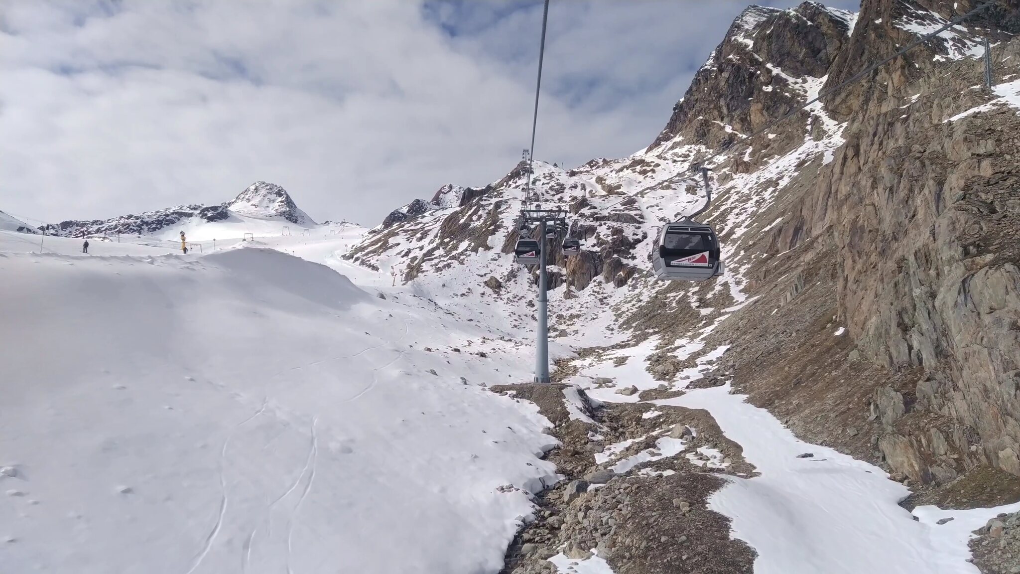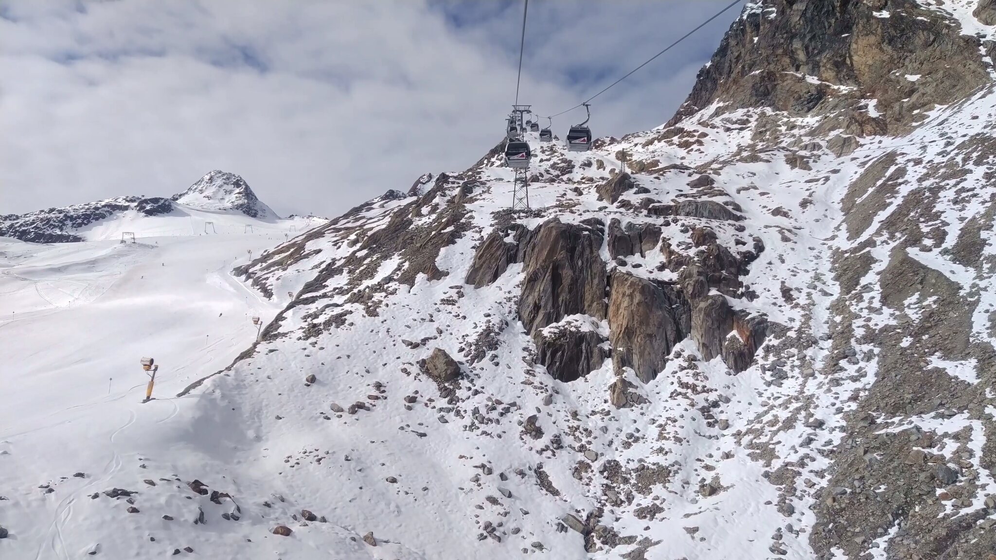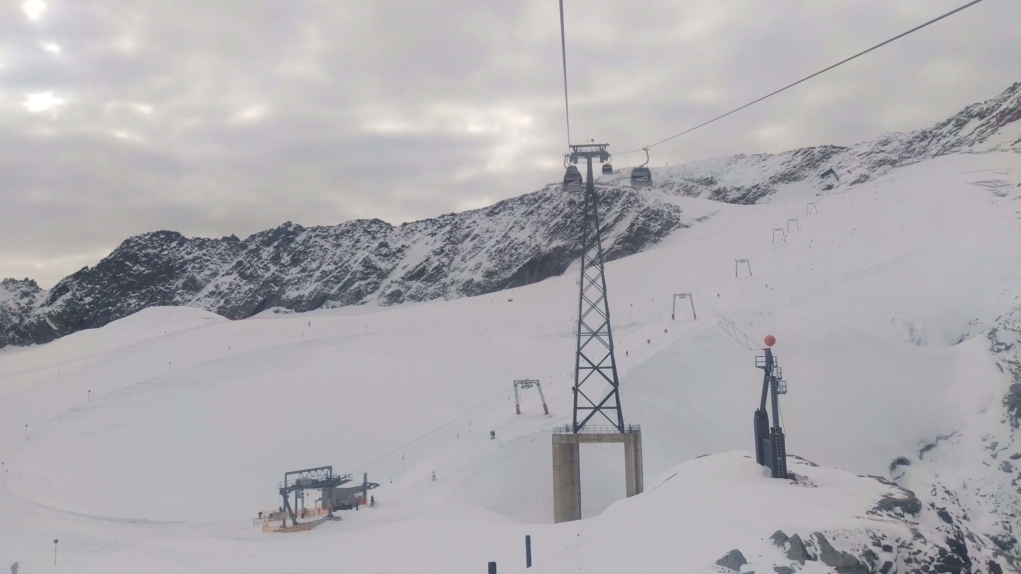 #19- Seitenblick zum Sl Mutkogl. Etwas weiter hinten ist auf dem Felsen ein verdächtiges Häuschrn zu sehen. Es handelt sich dabei um das alte Liftlerhäuschen des Schlepplifts Panorama, welcher 2017 wegen des Gletscherrückgangs leider stillgelegt wurde. Heute ust es kaum vorstellbar, dass dort jemals ein Schlepplift fahren konnte. Es bestehen aber Ersatzpläne, bei deren der Schlepplift Mutkogl bis zu seinem Zwischeneinstieg verkürzt würde.