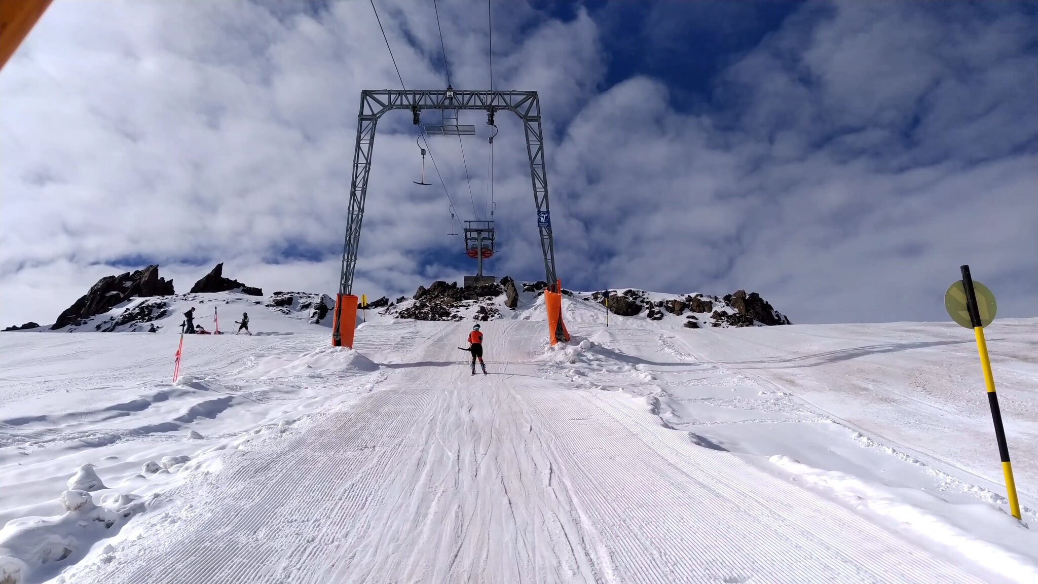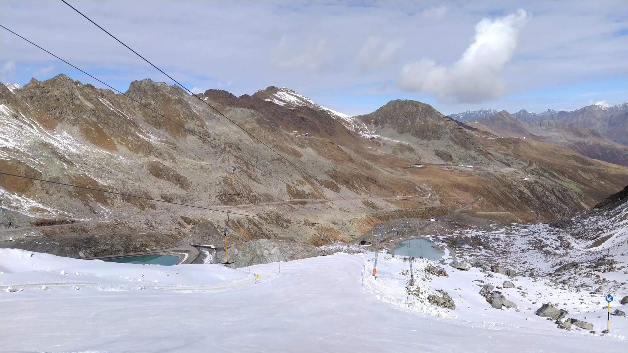 #33- Dann ging es wieder in Richtung schwarze Schneidbahn. Links ist noch der Ziehweg zu sehen, welchen ich 2020 in seinem letzten Herbst gefahren bin, dann wurder er wegen des Gletscherrückgangs stillgelegt. Der neue Weg ist skifahrerisch zwar ansprechender (beim alten musste ich schieben, um anzukommen), das neue Förderband finde ich aber nicht gelungen und viel zu langsam. Genauer gesagt war ich im Skatingschritt schneller...