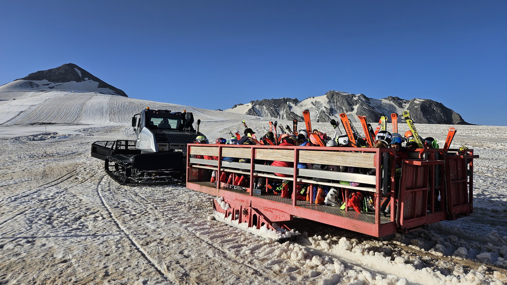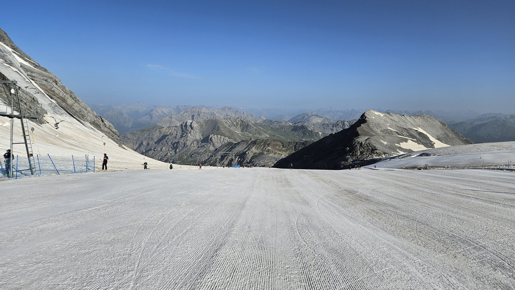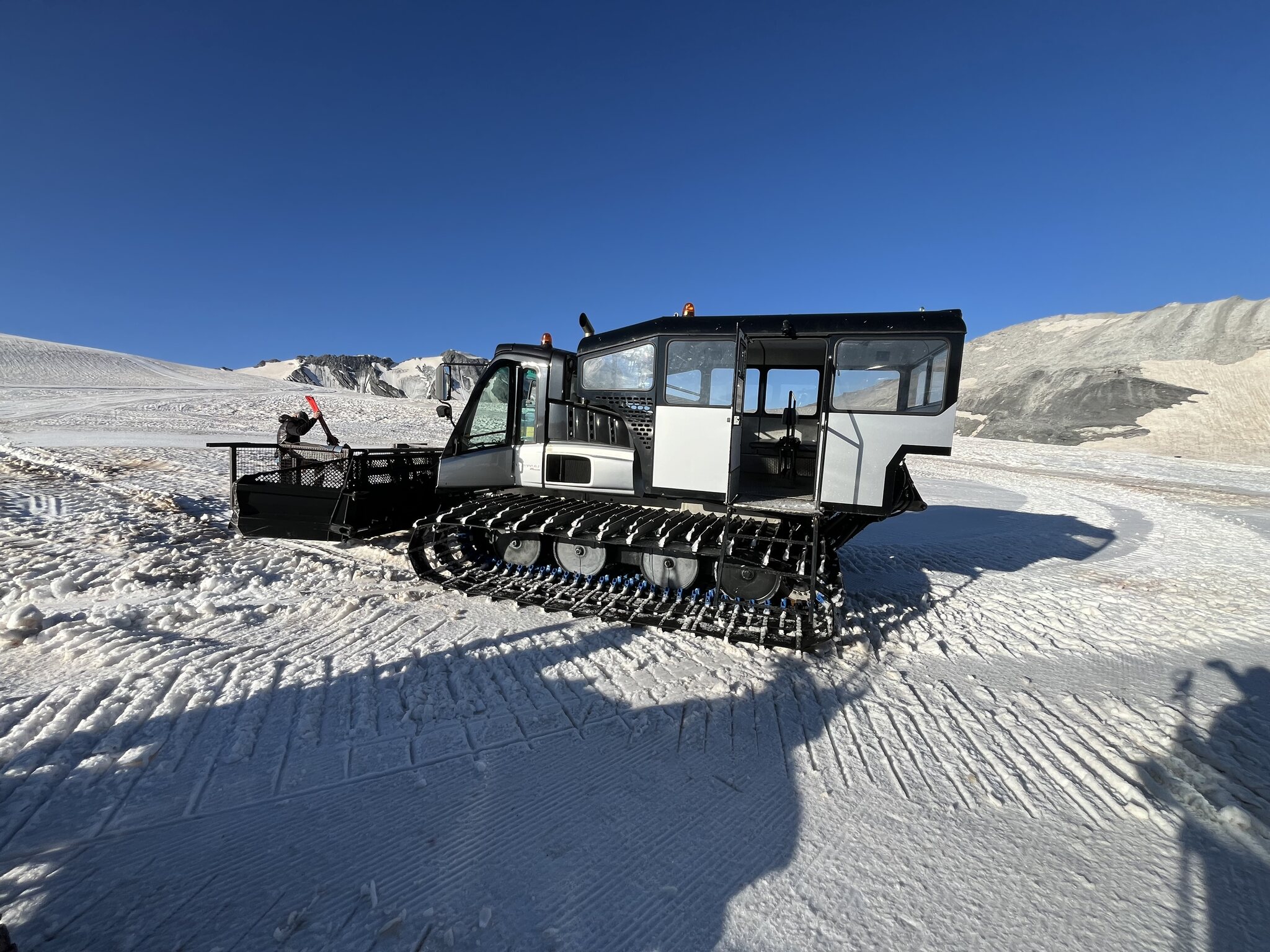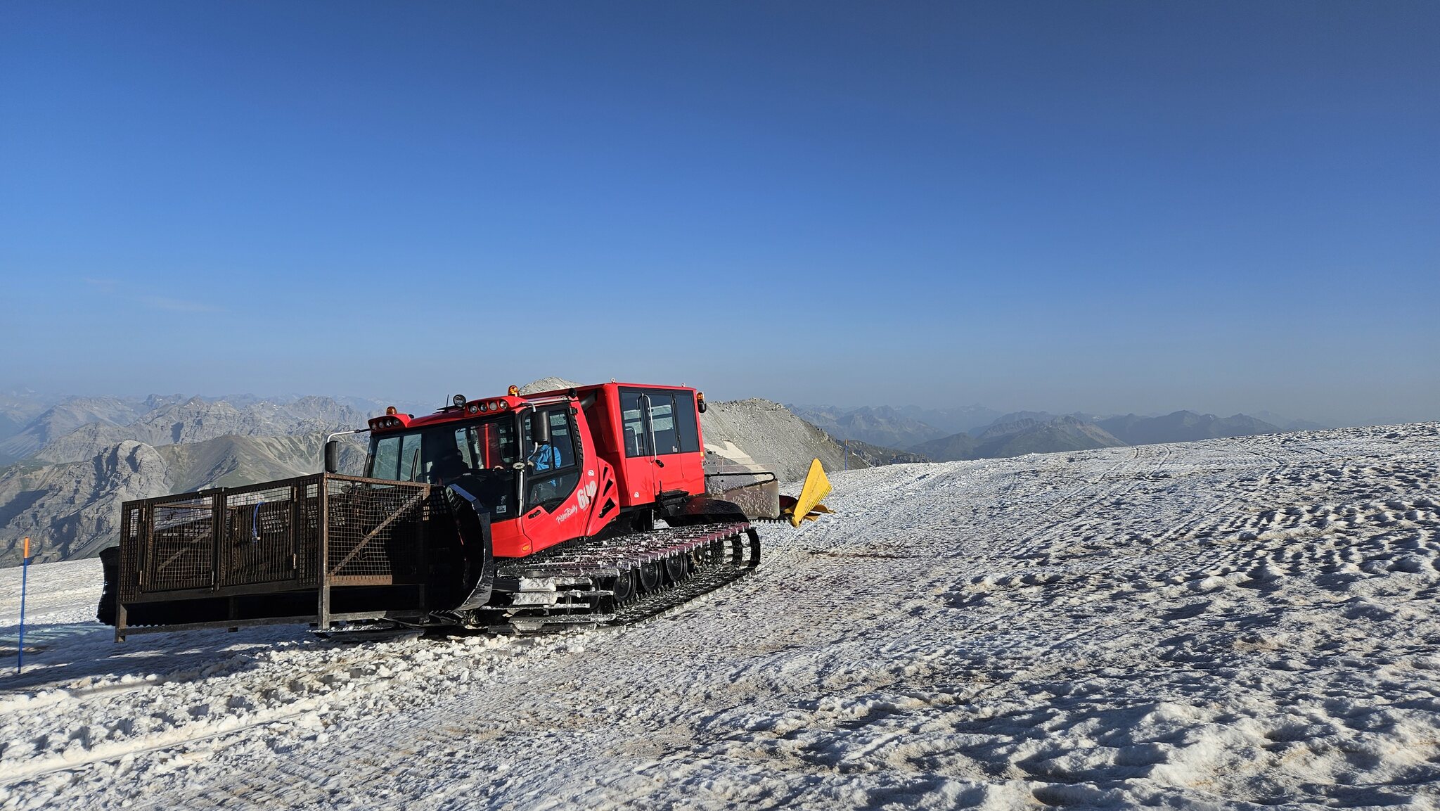 Parkplatz um 7.30 Uhr so leer? Die Talabfahrt ist auch mit mehrfachen Abschnallen nicht mehr möglich. Aber bis zur Mittelstation sollte es noch problemlos gehen. Heute ist es total entspannt: Aus der Rumpelkiste ein Blick zur Berninagruppe: Los geht’s! Nix los: Der Schnee ist genial. Er konnte dank der klaren Nacht trotz der hohen Temperaturen gut durchfrieren, ist hart aber griffig, überhaupt nicht eisig. Wie immer sehr gut präpariert! Beim Trasse war ein Stubaier am Werk: Edit 10.15 Uhr: