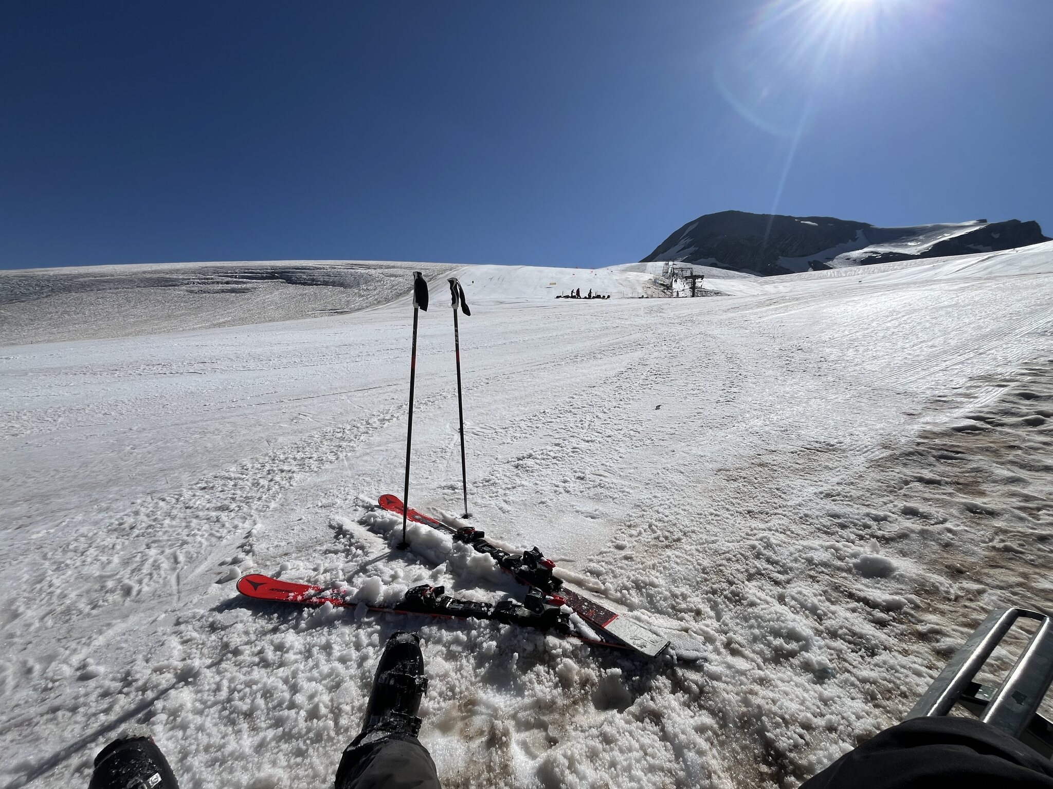 Zuerst fahre ich fast ausschliesslich Cristallo, da es dort bald mal ganz leicht auffirnt und so perfekt ist. Gegen 10 Uhr wird es dann aber leicht bremsig. Zeit für Payer, da ist nun auch perfekt. Schon schade und etwas peinlich, dass der Geister nicht läuft. Blick zur Weisskugel und Wildspitze: Kurze Pause: Edit 11.15 Uhr: