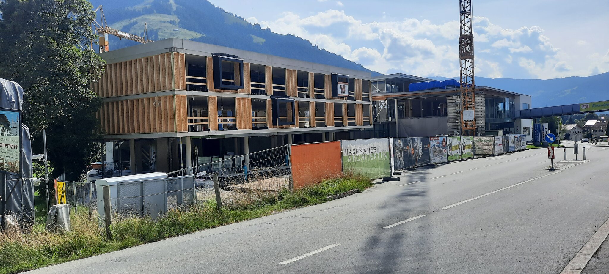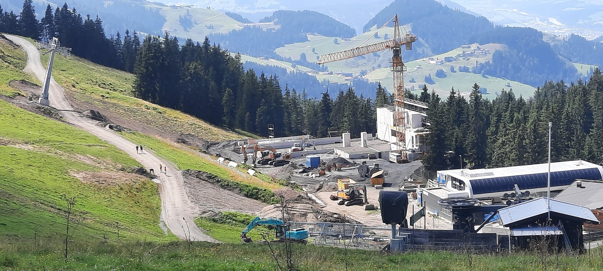 In Scheffau liegen beide Eibergbahnen zerlegt am Parkplatz Richtung Söll. Damit ist auch hier der Bau gestartet; es wird eine 8 KSB/B von Doppelmayr.