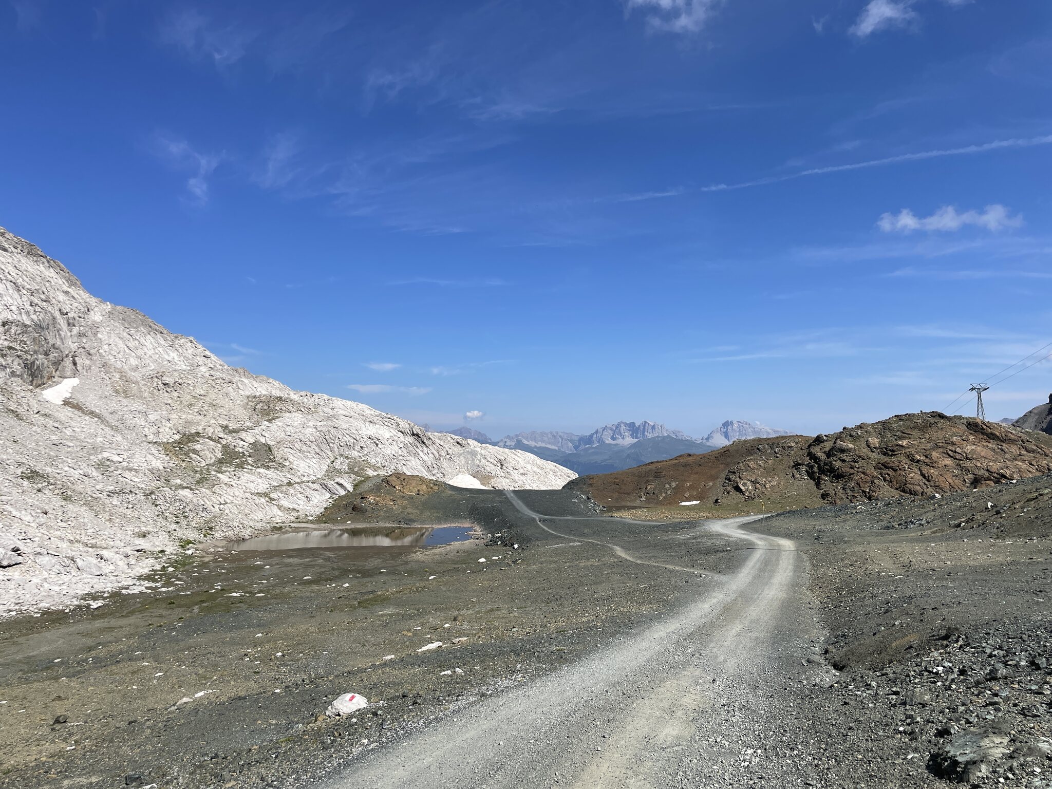 Wir fahren aber rechts um den Hügel herum. In diesem Bereich ist die Szenerie im Sommer nicht sehr anschaulich. Viel planiertes Geröll, Bahnen, Maschinen. Ein Industriequartier in den Bergen. Positiv: Ab hier verläuft die Abfahrt mehrheitlich auf Singletrails.