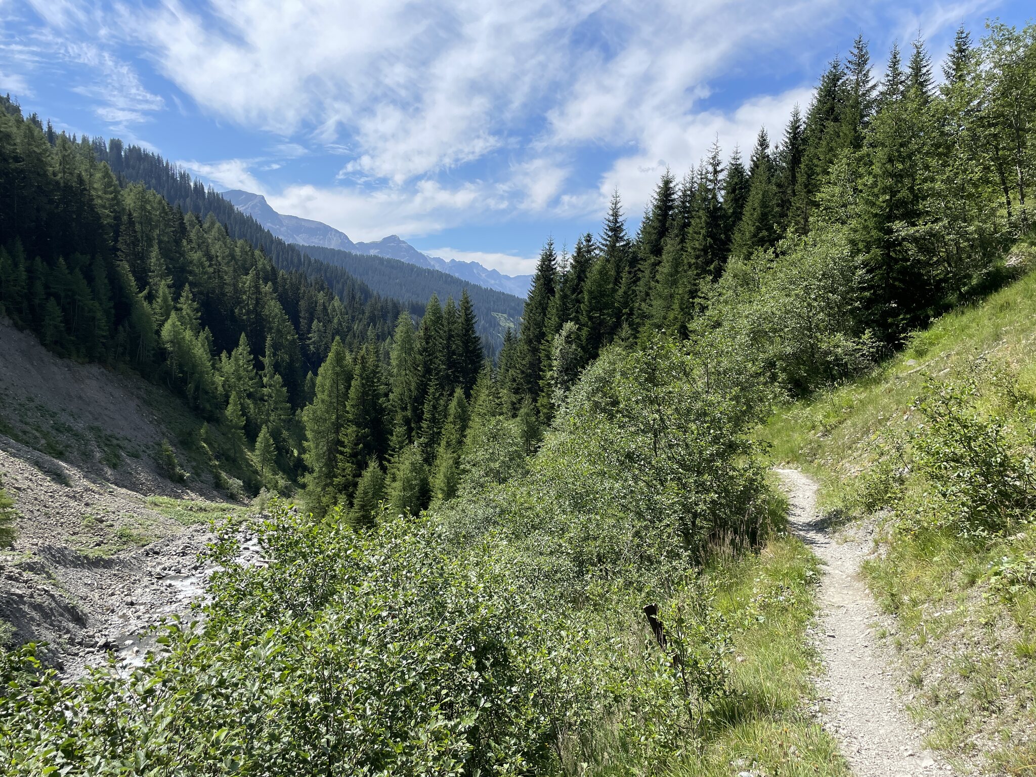 Ungefähr bei der Talstation des SL Kreuzweg zweigt der Weg nach links ab und bald gelangt man in Höhenlagen mit mehr Vegetation.