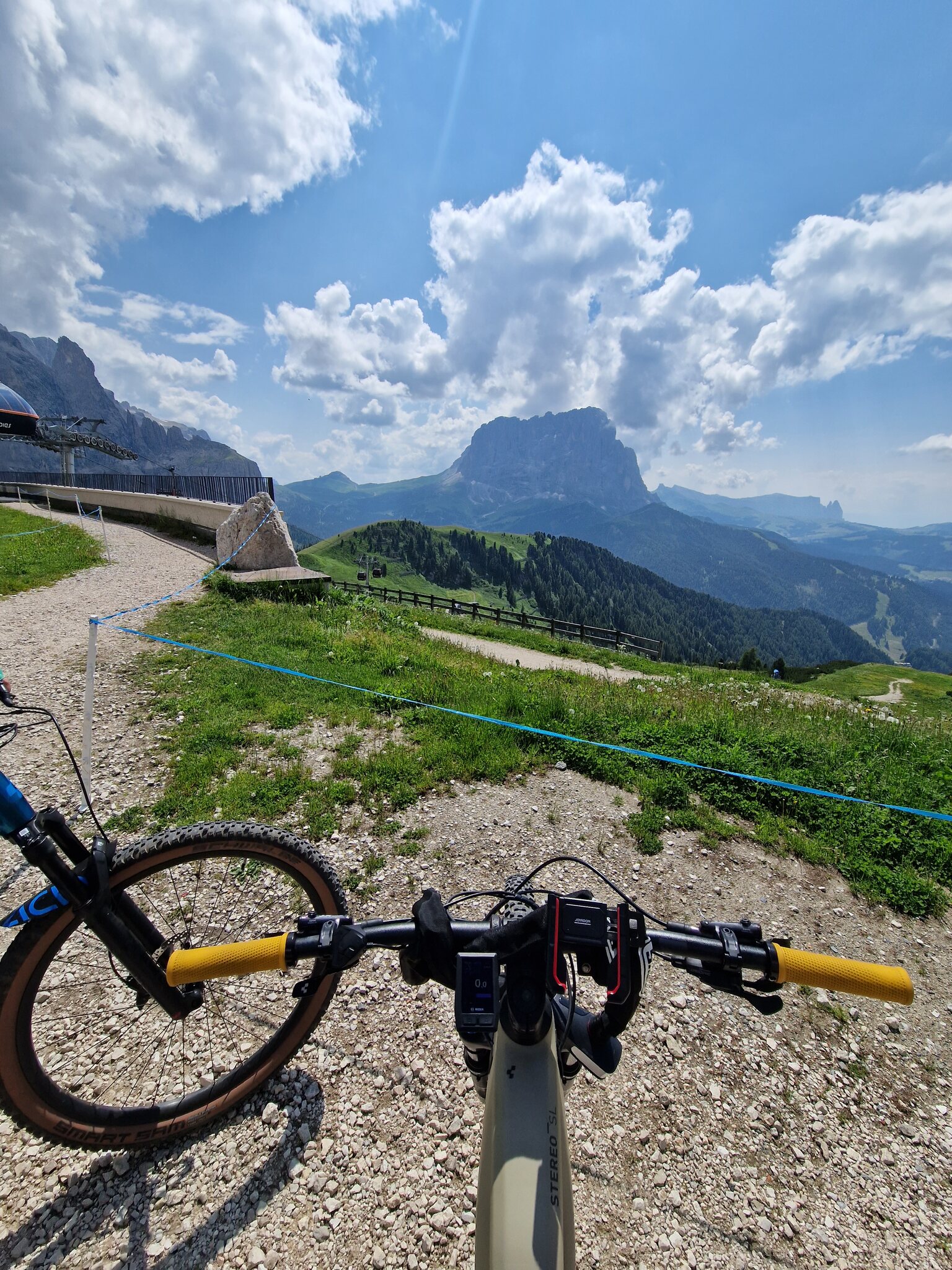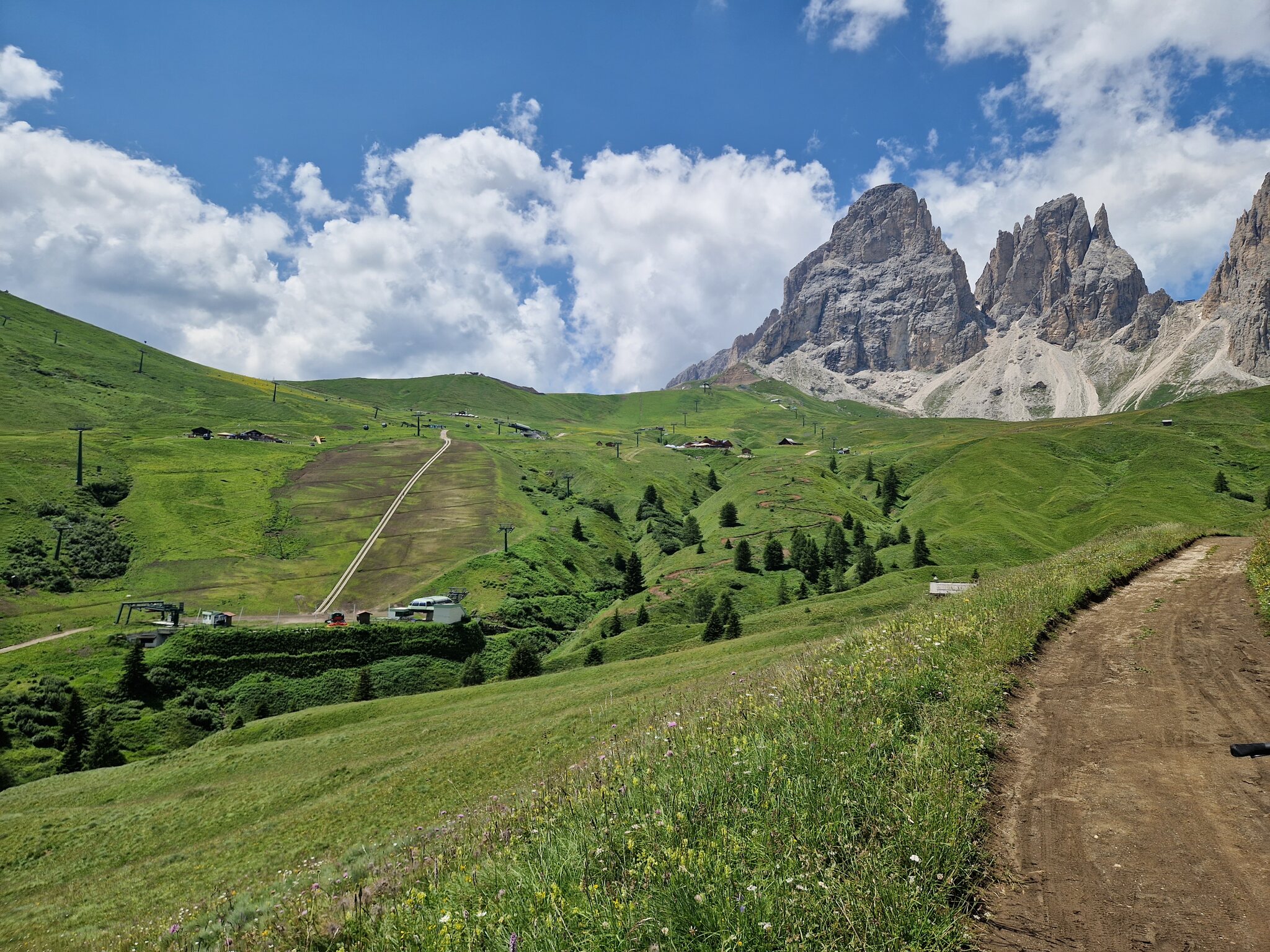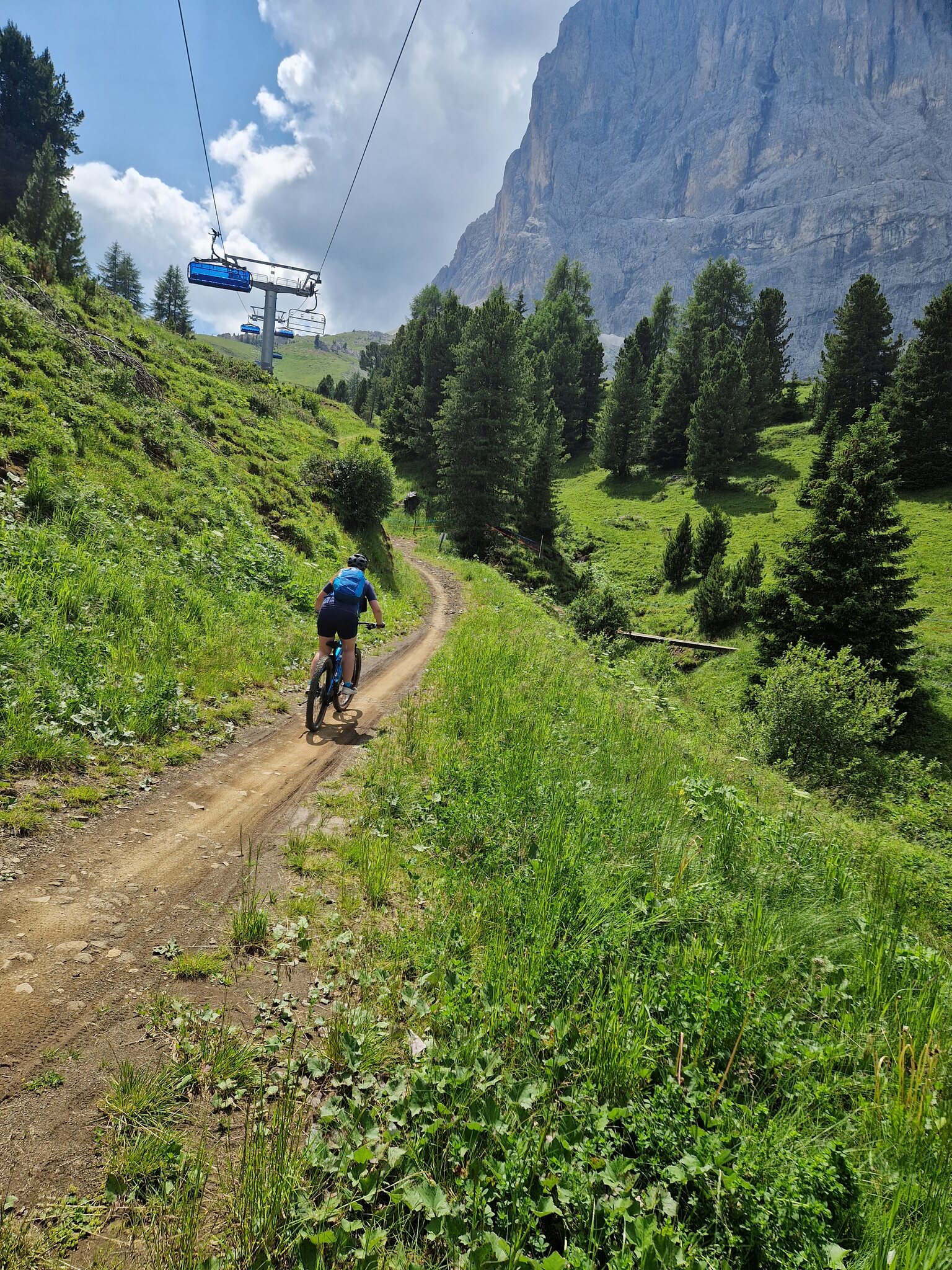 Auch der weitere Verlauf macht Hoffnung, so können wir über den geplanten Fahrweg bis zum Sellajoch hinauf fahren Rückblick zum Belvedere Sektor Hier wurde wohl auch an der Piste gearbeitet Wir fahren weiter durch die steinerne Stadt und gelangen zur Bergstation des Gran Paradiso Dort beginnt ein ca. 7km langer FlowTrail bis Plan de Gralba Der Pflegezustand des Trails ist deutlich besser als auf denen des bisherigen Tages und der Spaß am Biken kommt zurück Leider viel zu schnell erreichen wir das Ende des Trails Da die Zeit schon fortgeschritten ist, verzichten wir auf weitere Experimente entlang der Piste nach nach Wolkenstein und nehmen lieber die Straße.