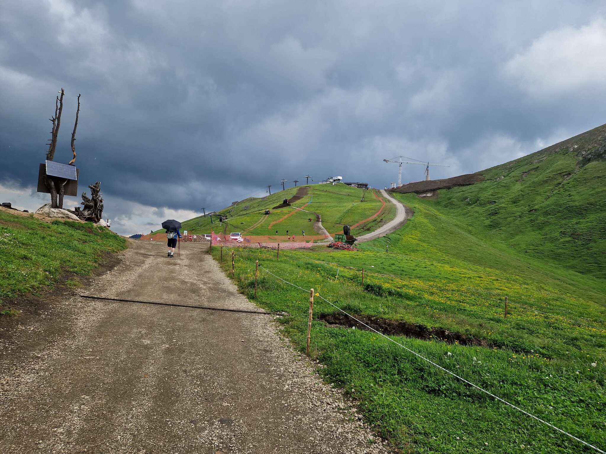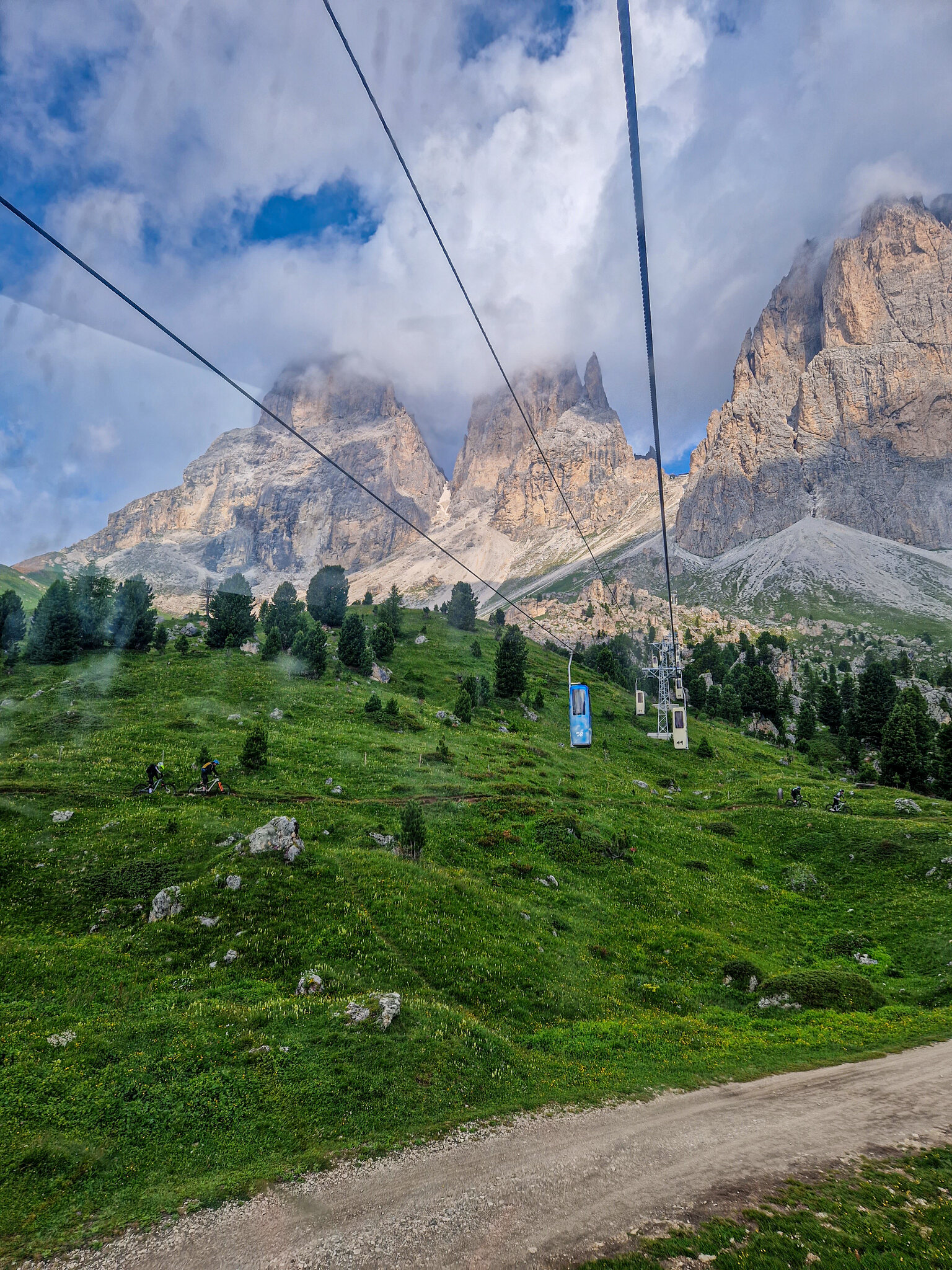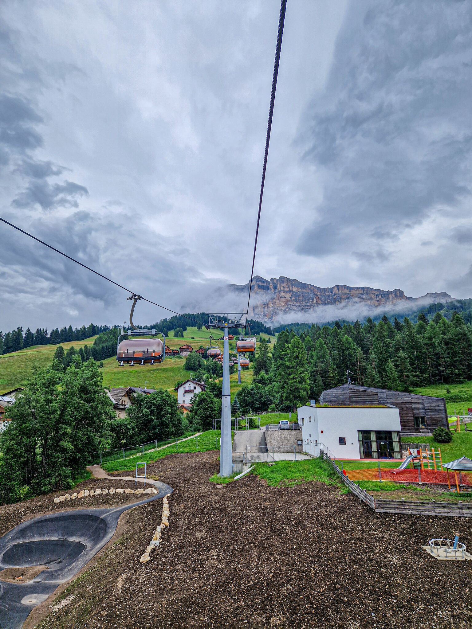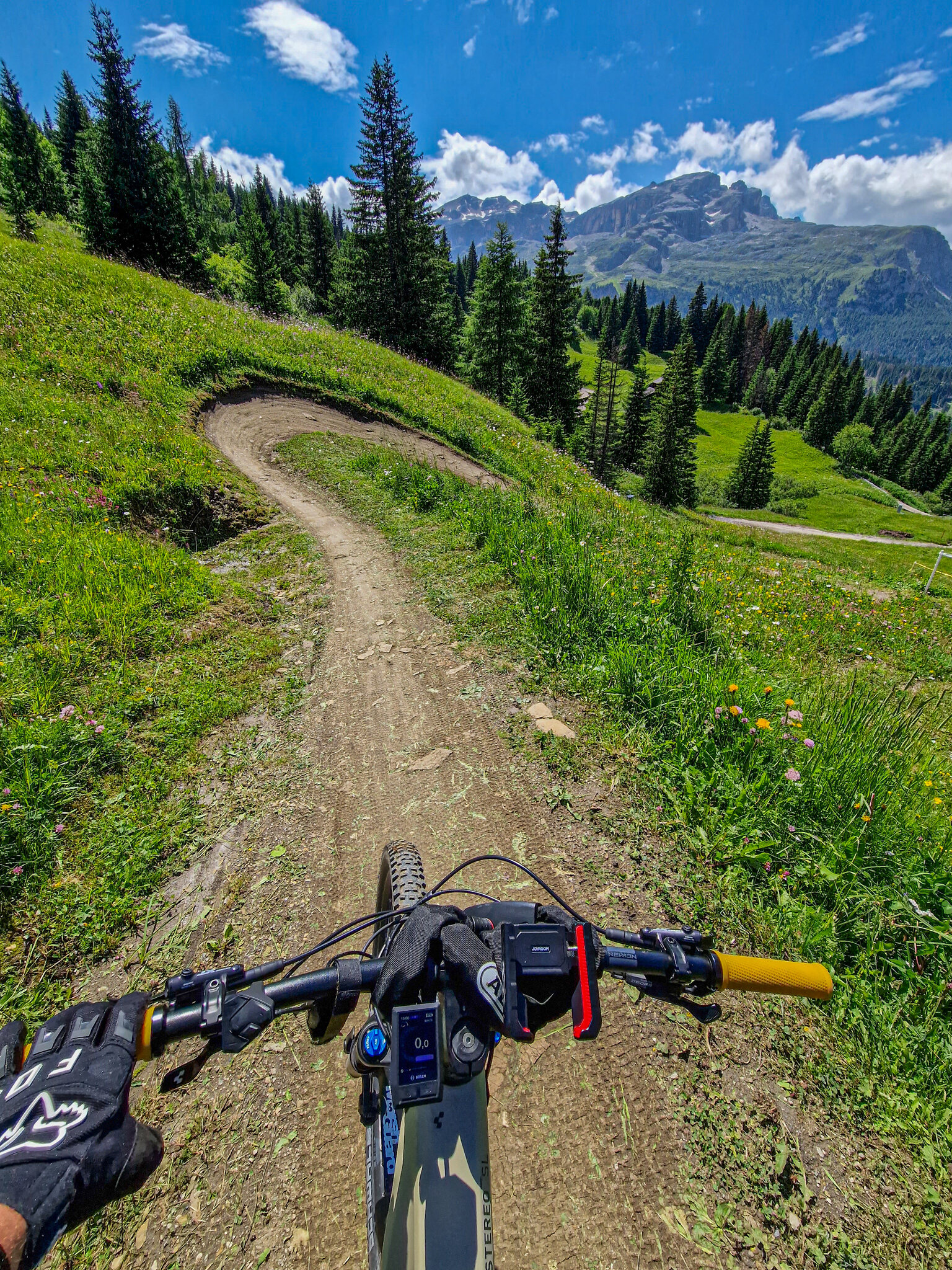 Auch der weitere Verlauf macht Hoffnung, so können wir über den geplanten Fahrweg bis zum Sellajoch hinauf fahren Rückblick zum Belvedere Sektor Hier wurde wohl auch an der Piste gearbeitet Wir fahren weiter durch die steinerne Stadt und gelangen zur Bergstation des Gran Paradiso Dort beginnt ein ca. 7km langer FlowTrail bis Plan de Gralba Der Pflegezustand des Trails ist deutlich besser als auf denen des bisherigen Tages und der Spaß am Biken kommt zurück Leider viel zu schnell erreichen wir das Ende des Trails Da die Zeit schon fortgeschritten ist, verzichten wir auf weitere Experimente entlang der Piste nach nach Wolkenstein und nehmen lieber die Straße.