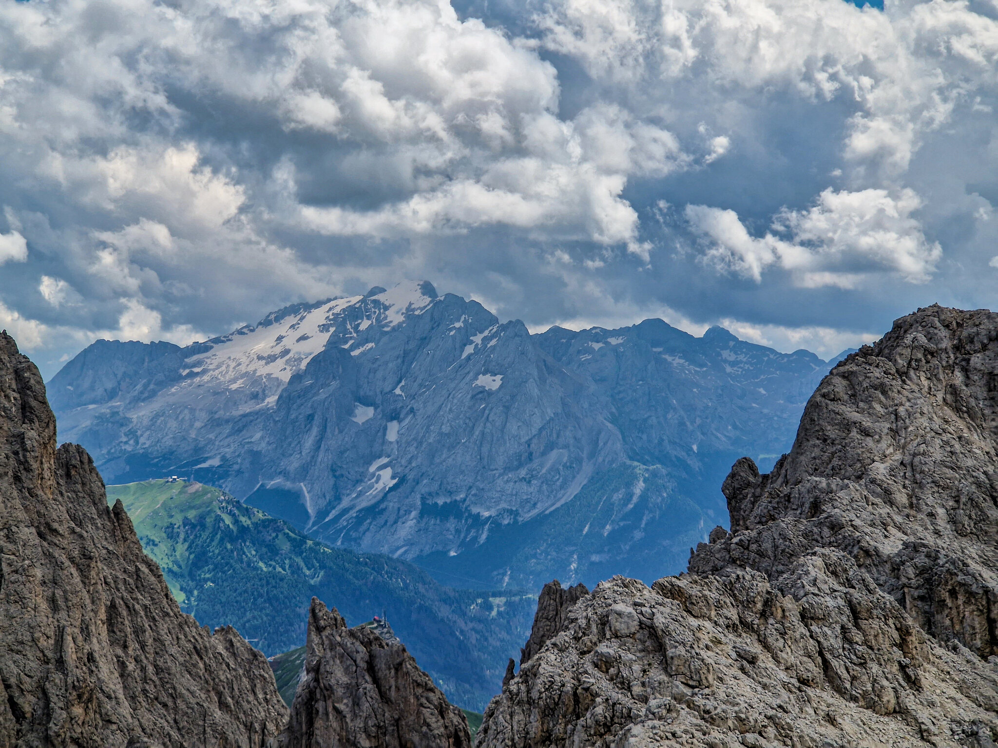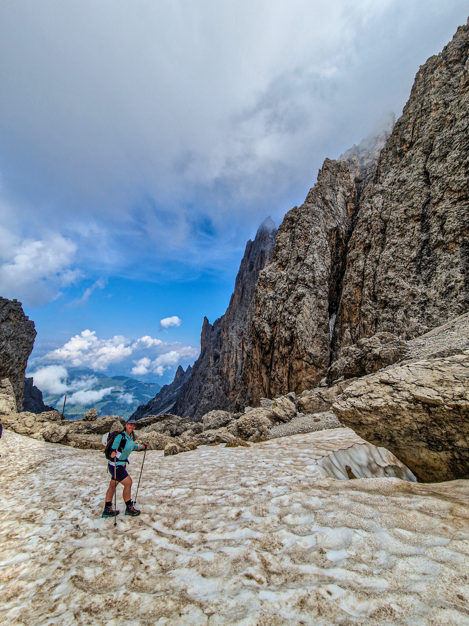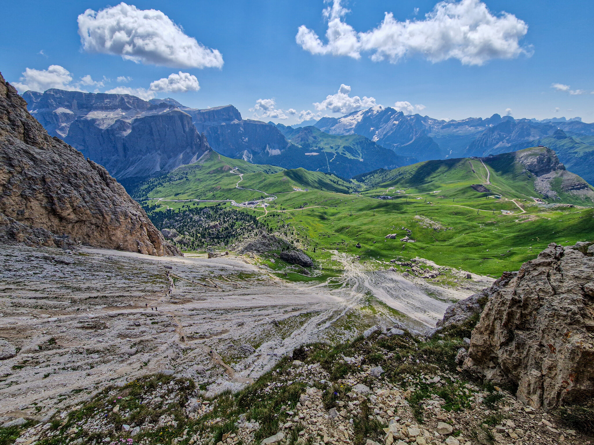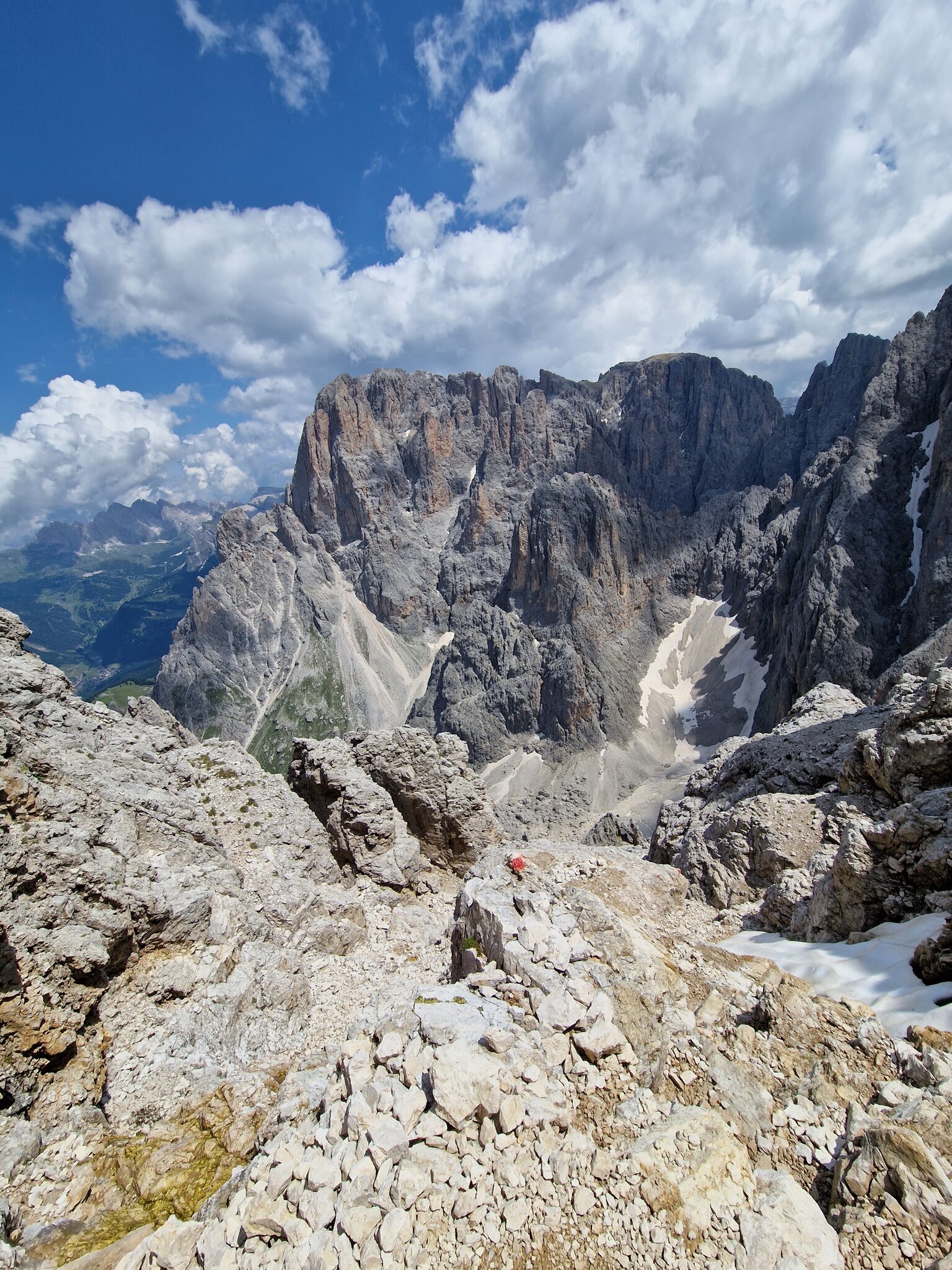 Hier Richtung schneebedeckter Marmolada Oder Richtung Gröden Rosengarten Piz Boe Vigo Mit Blick zum Schlern und Seiser Alm steigen wir über den extrem monotonen Normalweg ab Die Einkehr gibt es im Rifugio Sandro Pertini Danach über Wanderwege zurück zum Sellajoch Insgesamt haben wir ca. 7Stunden für die Tour benötigt.