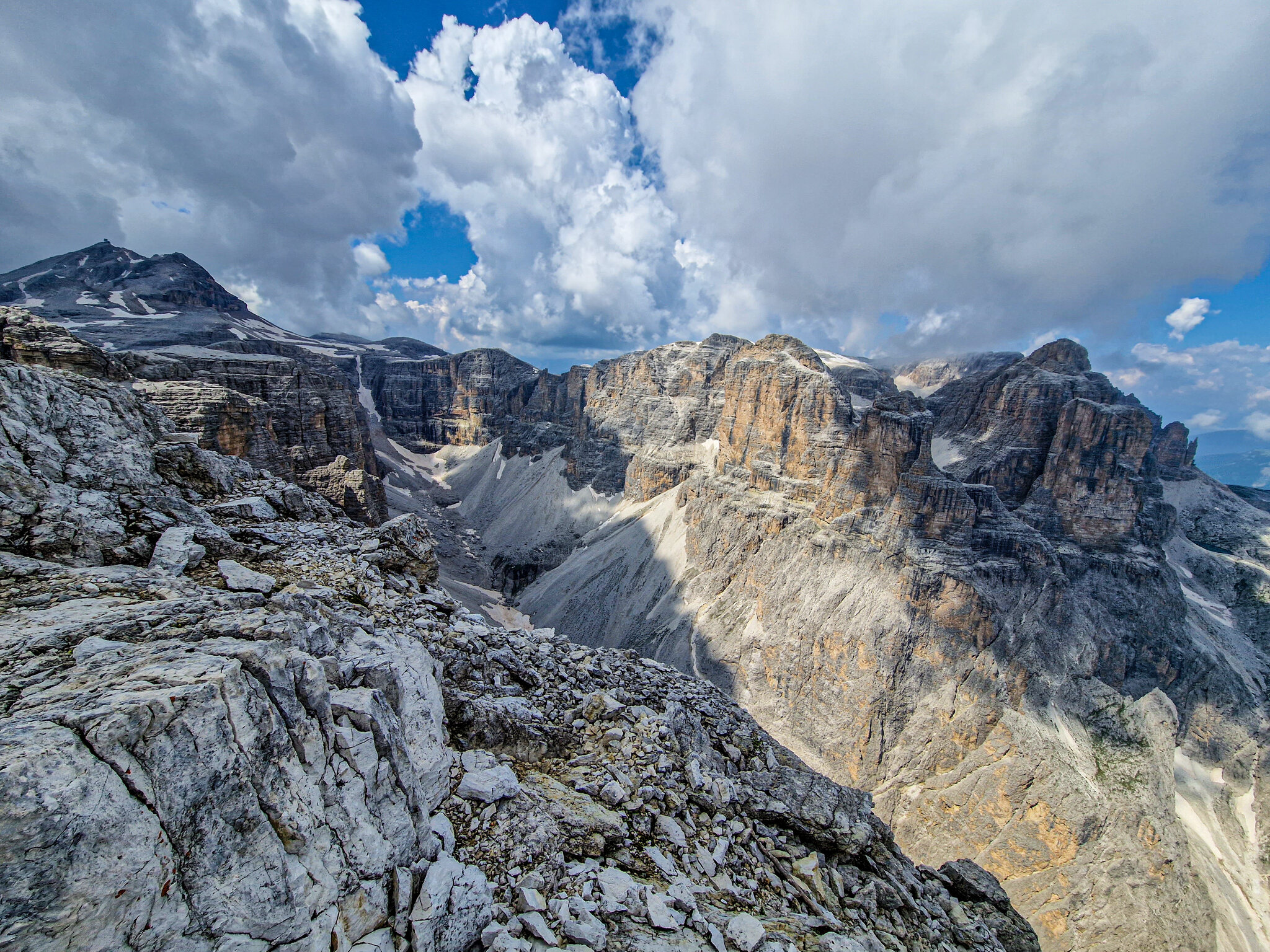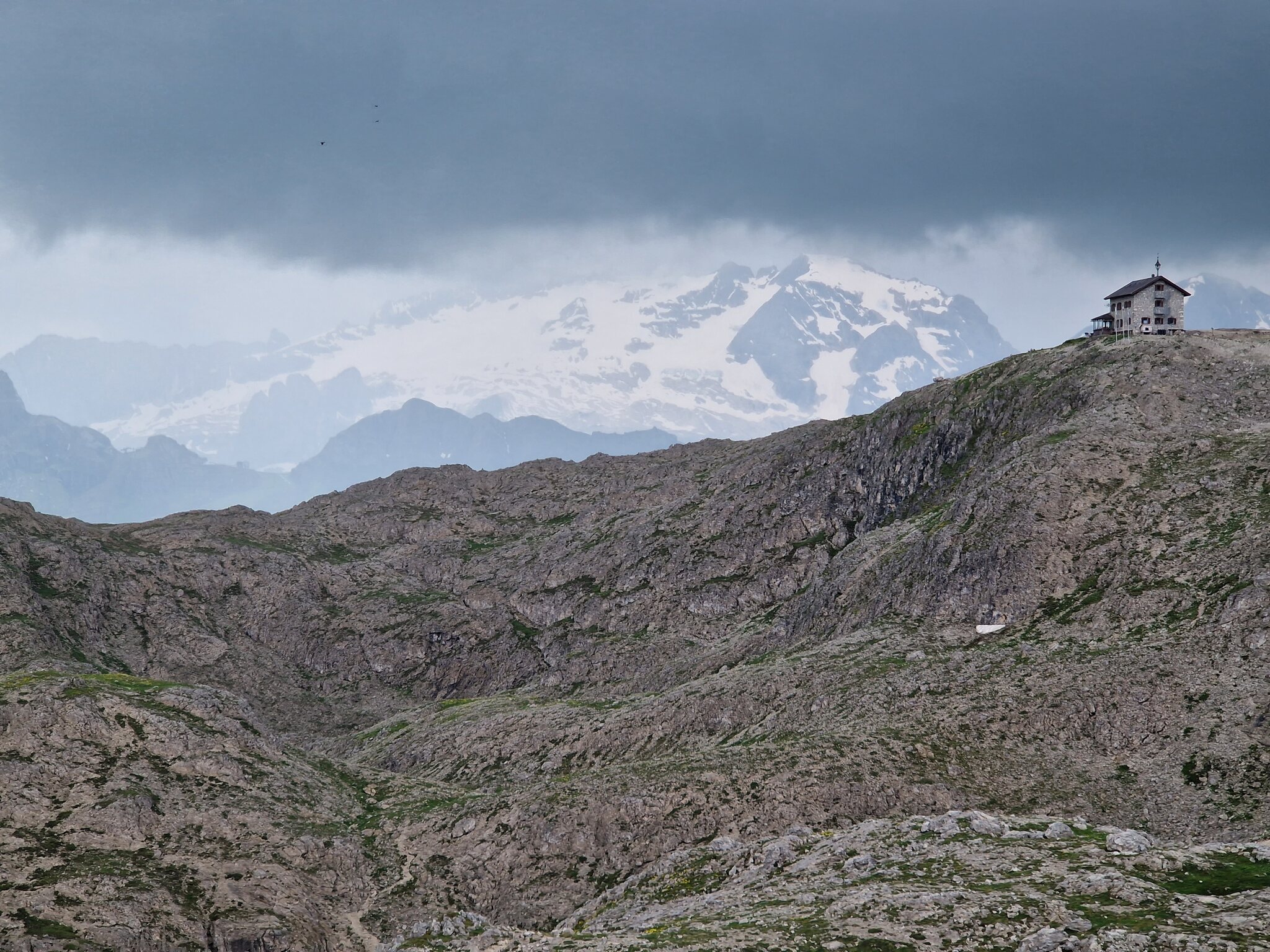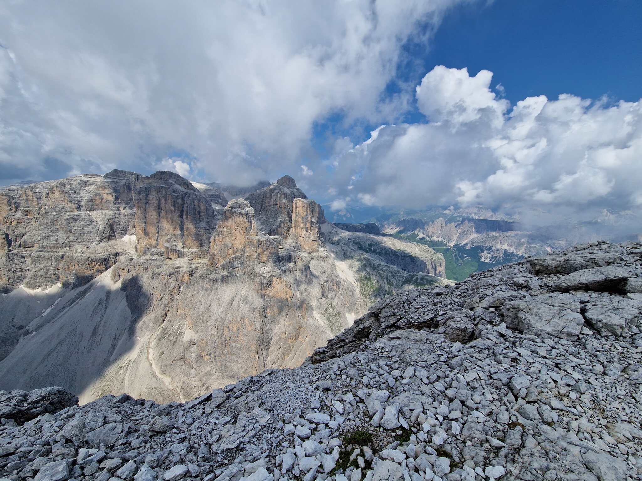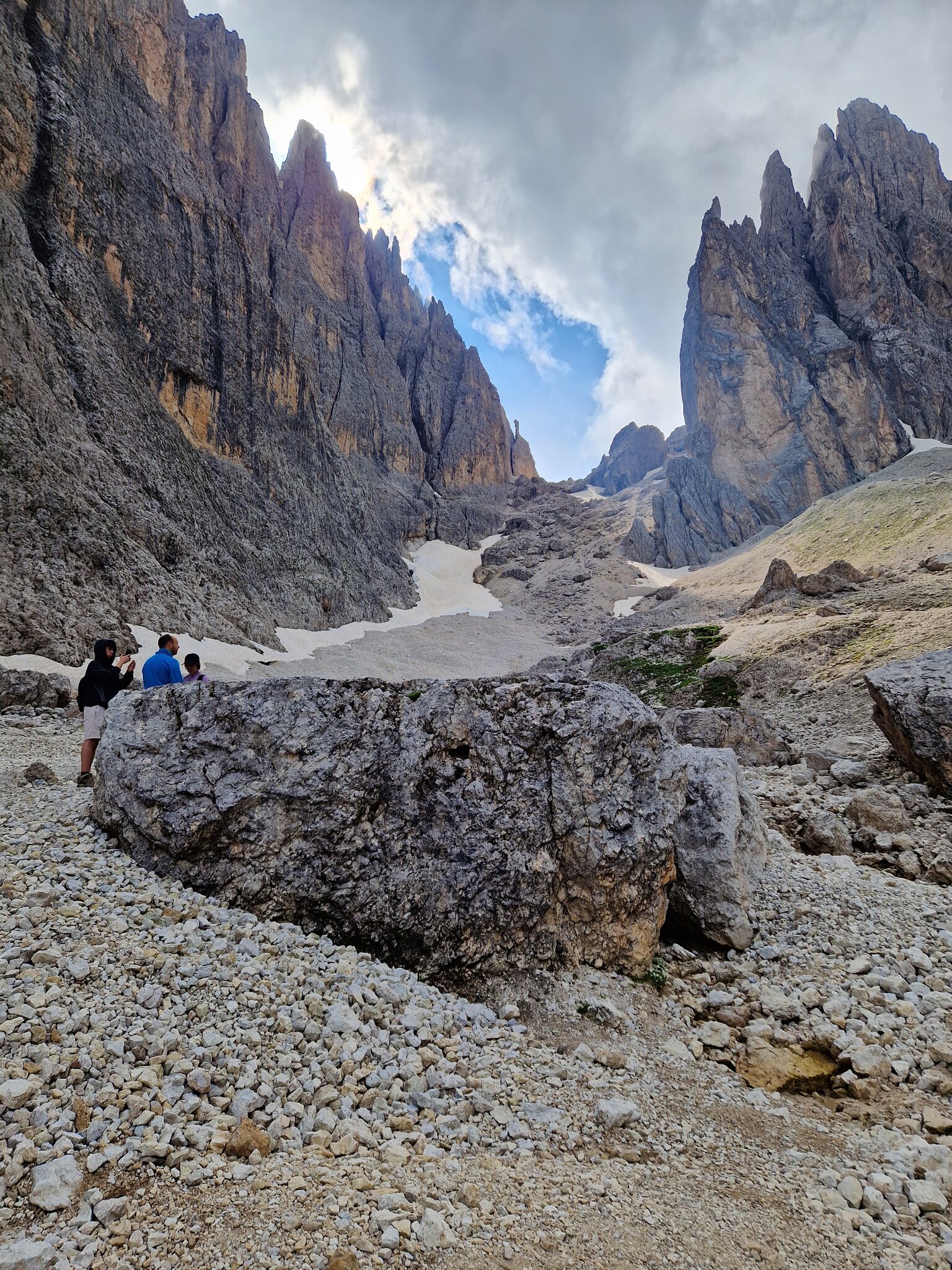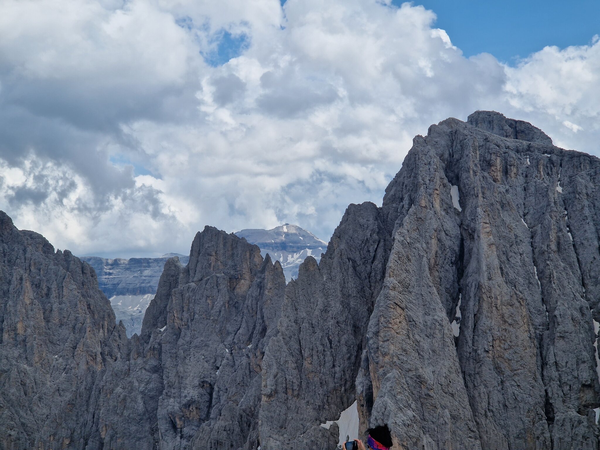Hier Richtung schneebedeckter Marmolada Oder Richtung Gröden Rosengarten Piz Boe Vigo Mit Blick zum Schlern und Seiser Alm steigen wir über den extrem monotonen Normalweg ab Die Einkehr gibt es im Rifugio Sandro Pertini Danach über Wanderwege zurück zum Sellajoch Insgesamt haben wir ca. 7Stunden für die Tour benötigt.