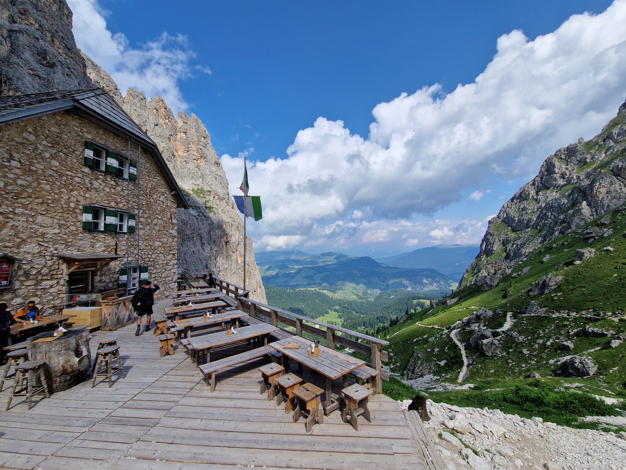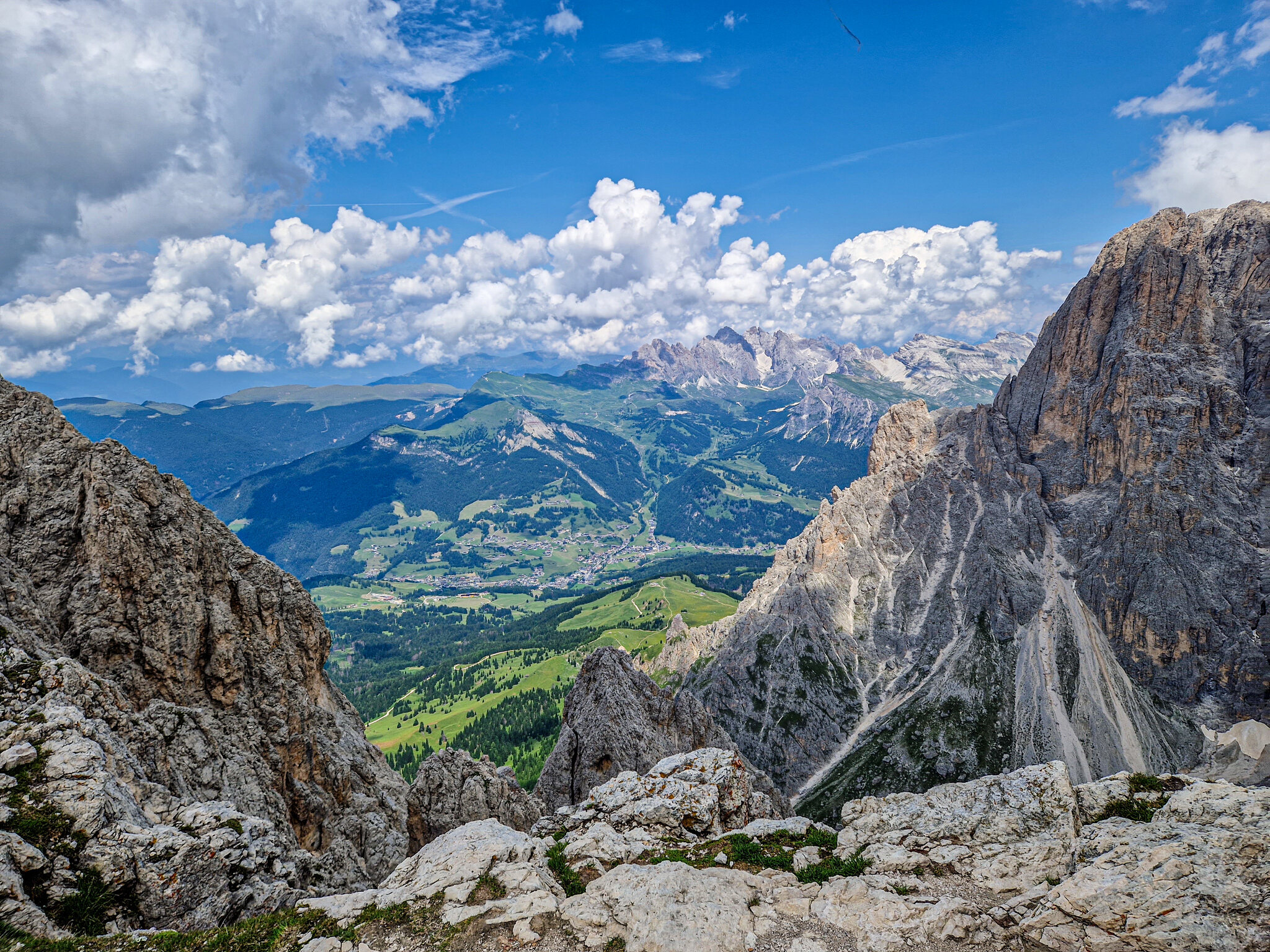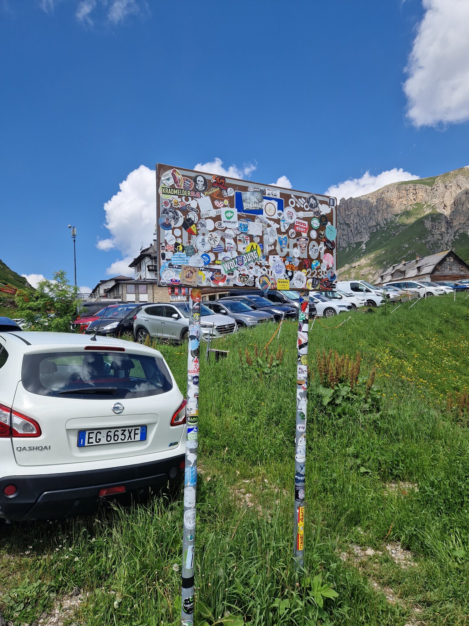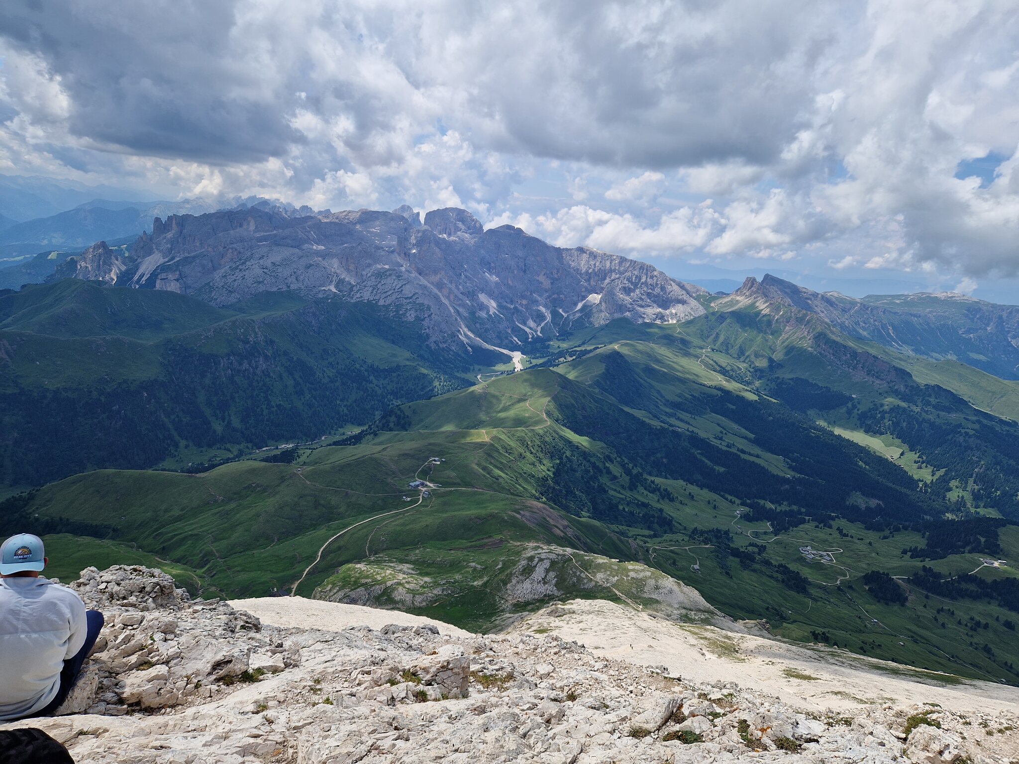 Der Blick vom Balkon macht Hoffnung Mittels Auto ging es am Morgen in 30min von Colfosco zum Sellajoch, wo wir für schlappe 22€ Tagesticket auf unseren Parkplatz eingewiesen wurden.