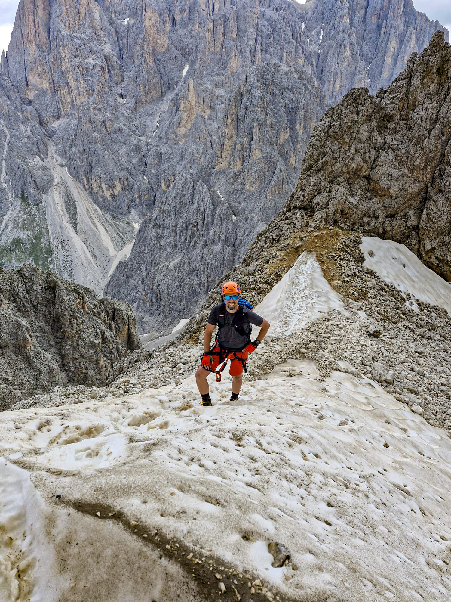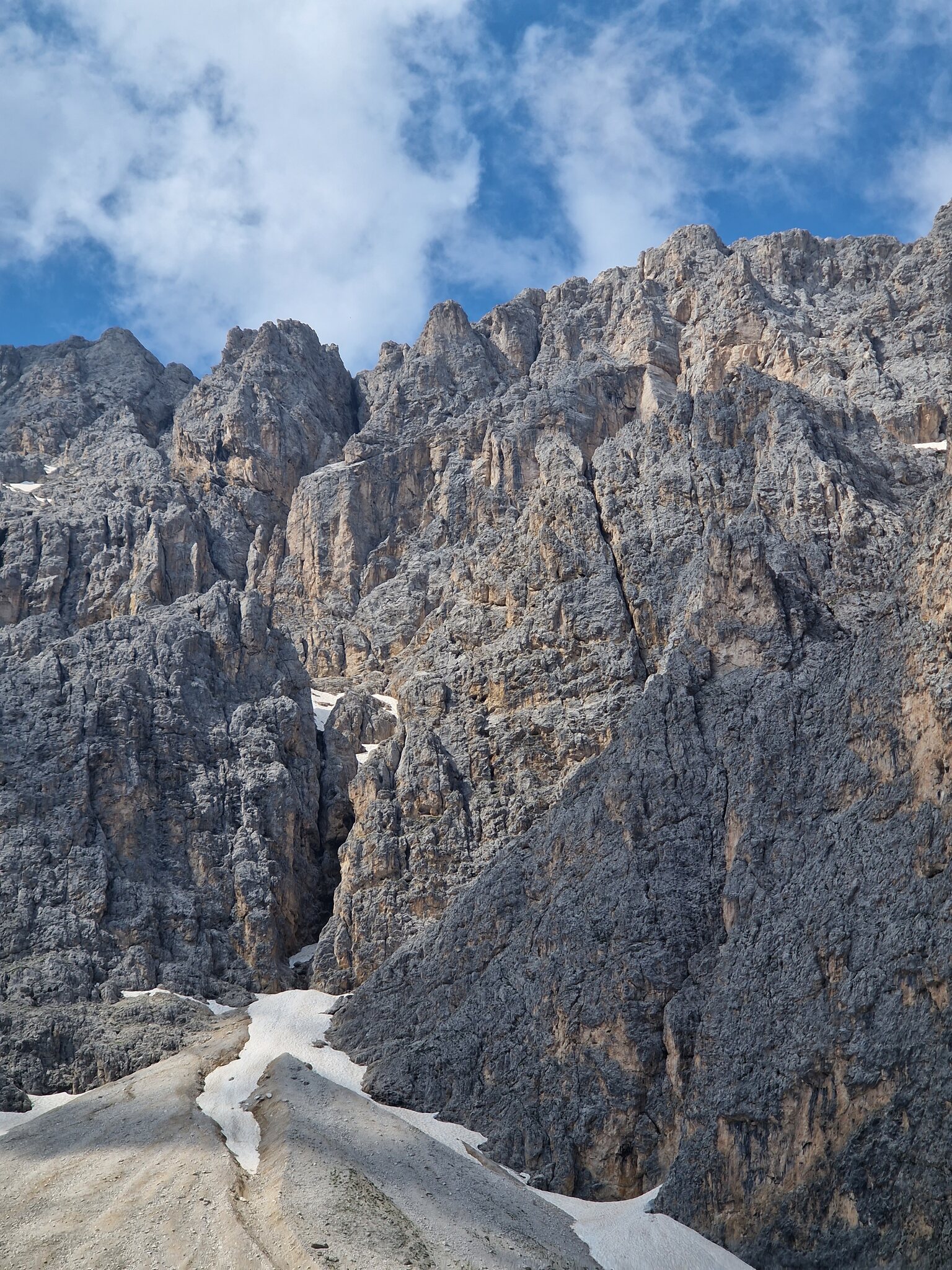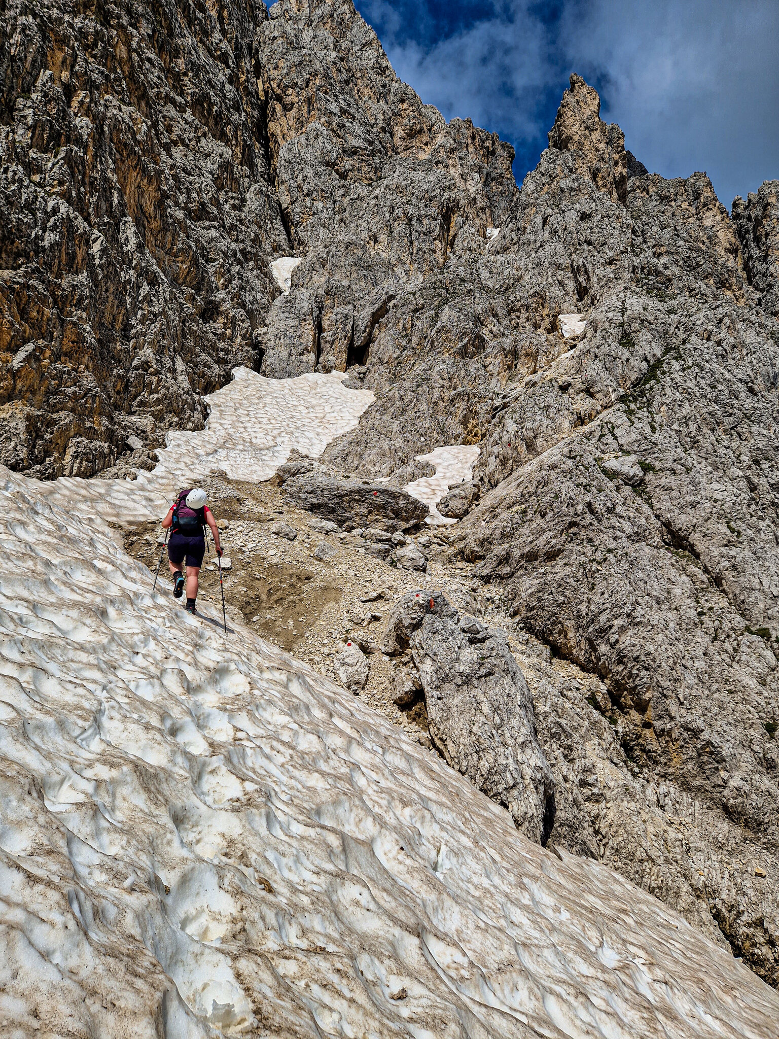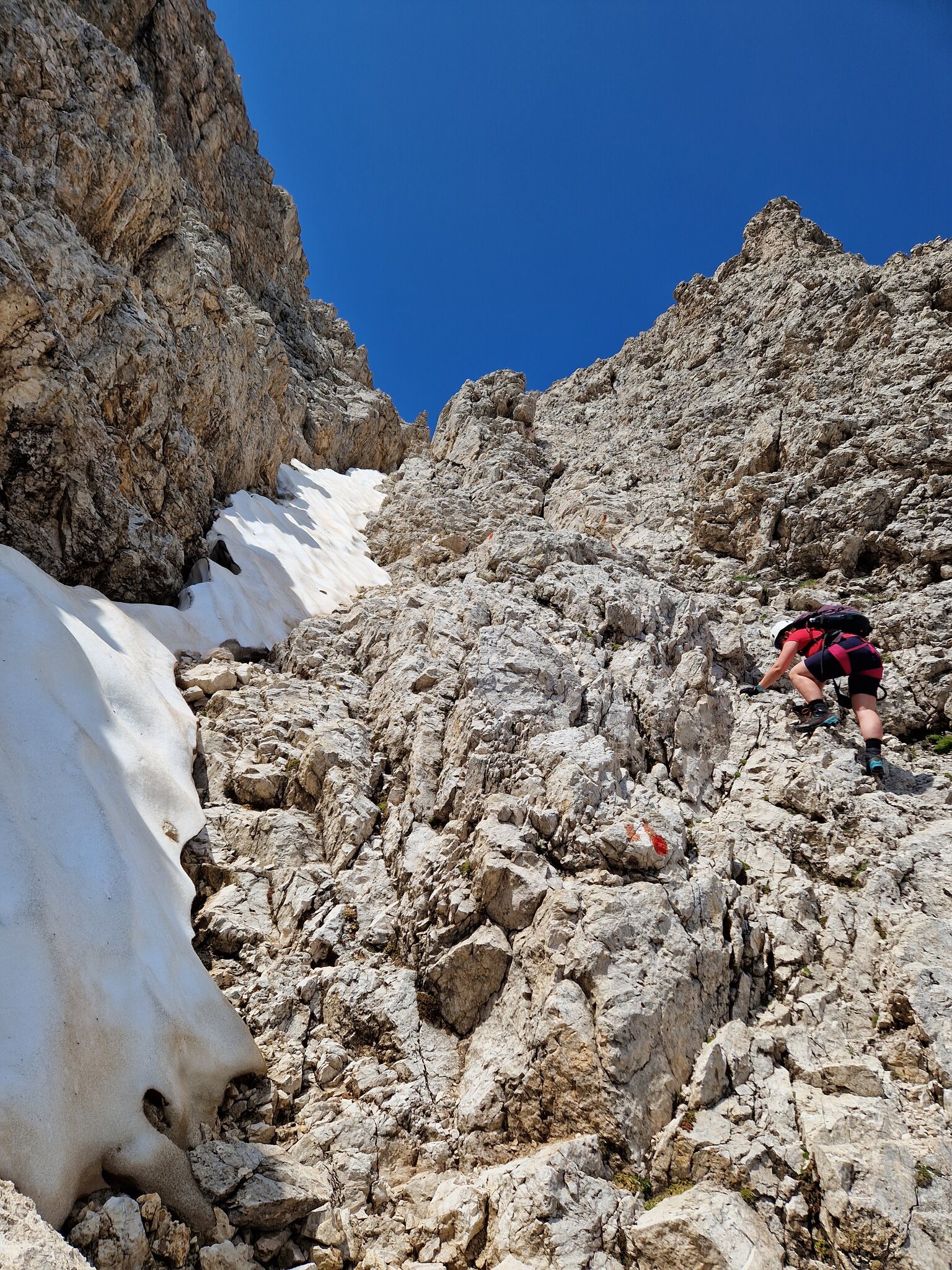 Oben angekommen gings zunächst noch über Restschnee hinab zur Langkofelhütte Rückblick hinauf zur Scharte Schnell kommen wir zur Langkofelhütte Von hier aus geht es durchs Langkofelkar wieder hinauf zum Einstiegspunkt des Klettersteigs Blick auf den Bereich des Steigs Auch direkt am Einstieg noch viel Restschnee Bevor der seilversicherte Bereich beginnt, ist zunächst eine kurze Verschneidung in leichter Kletterei zu durchqueren.