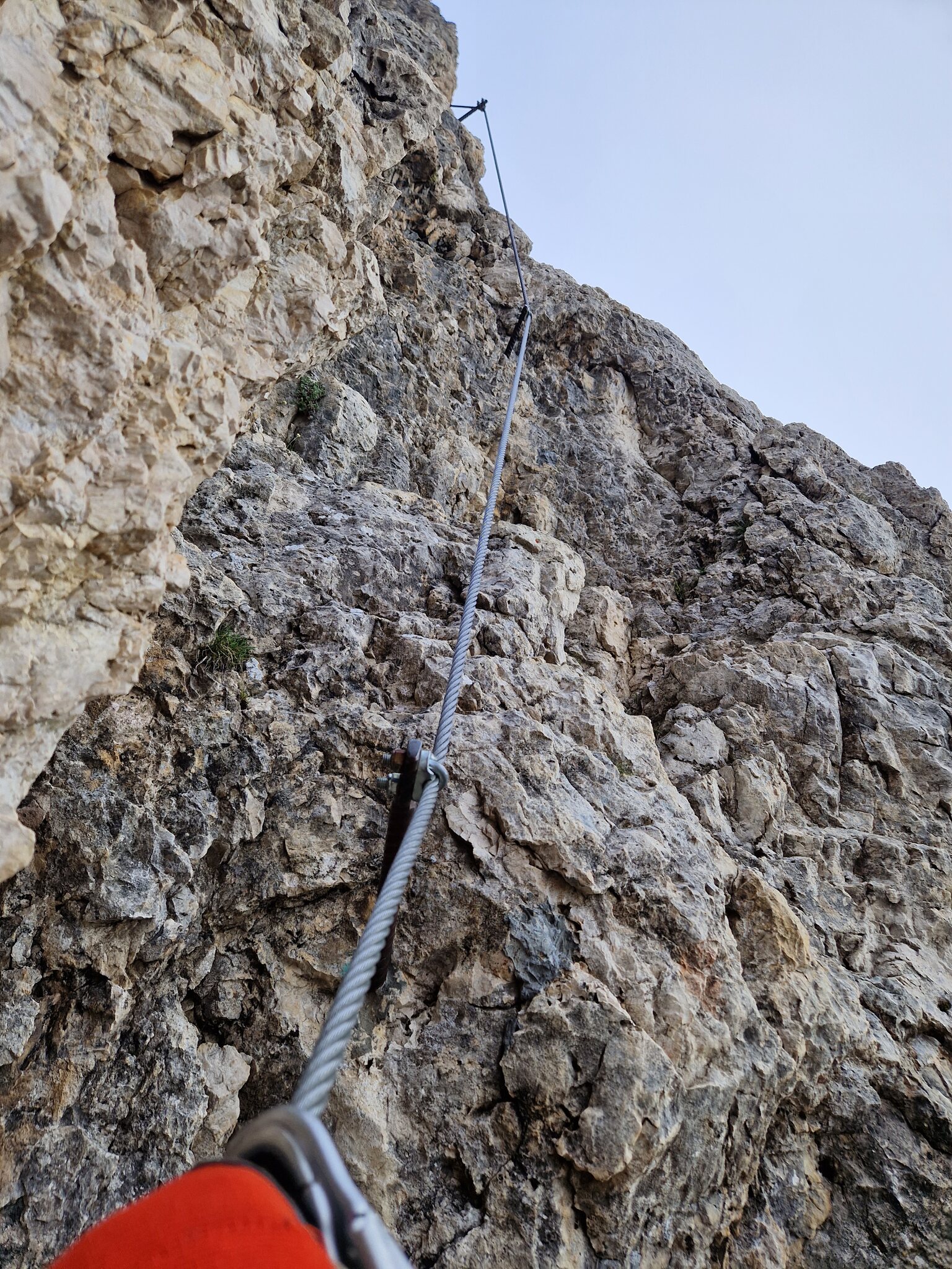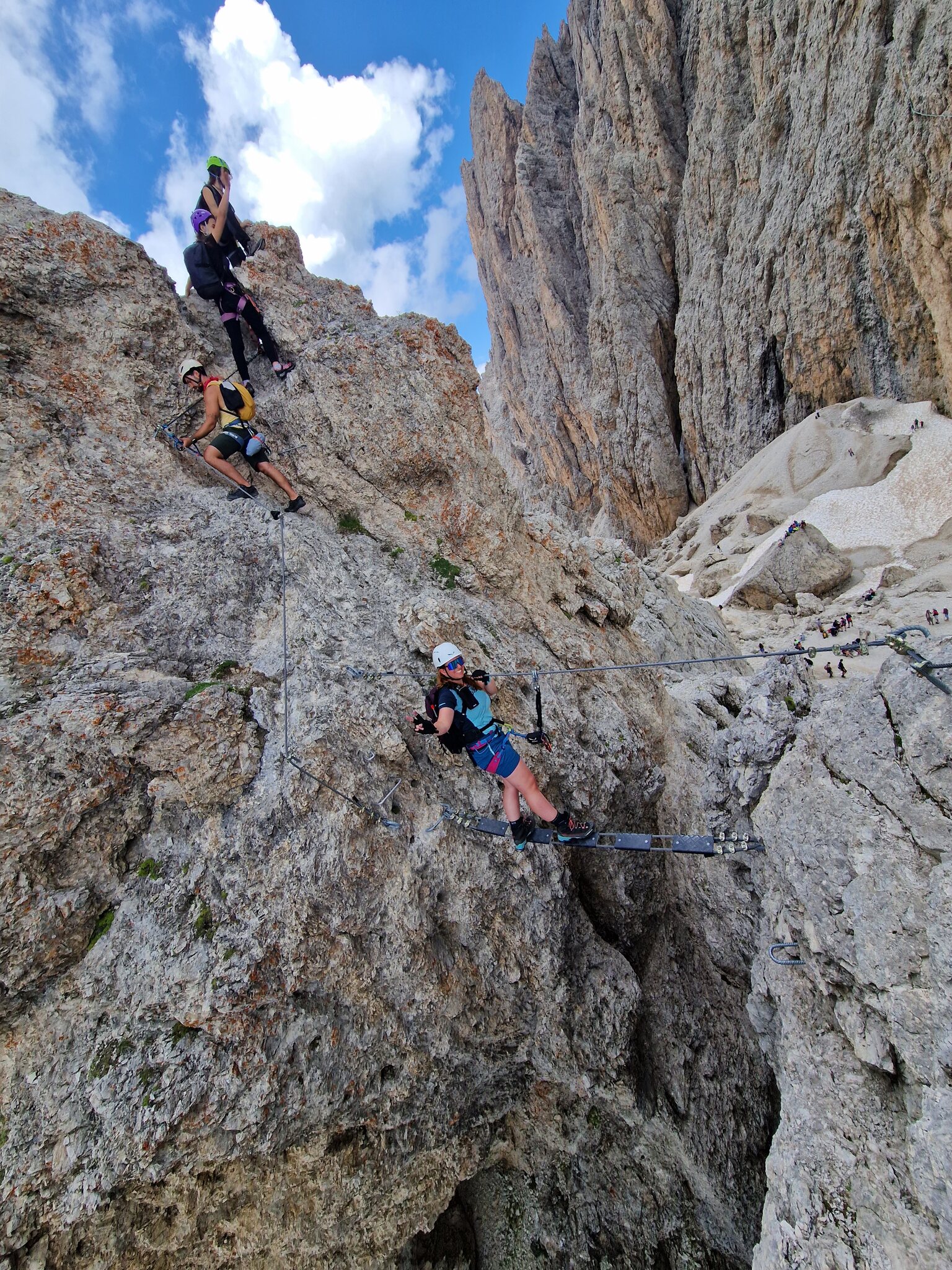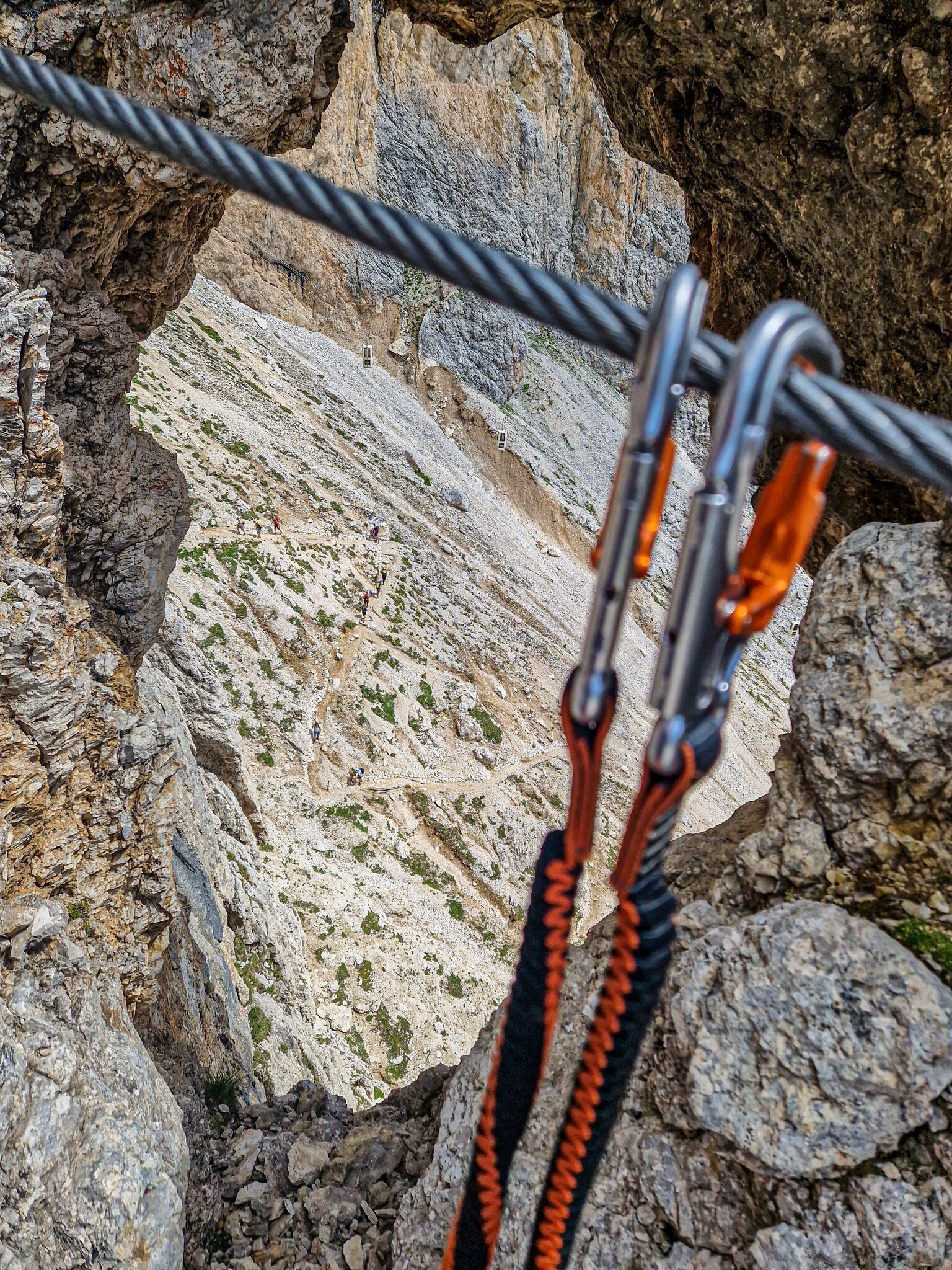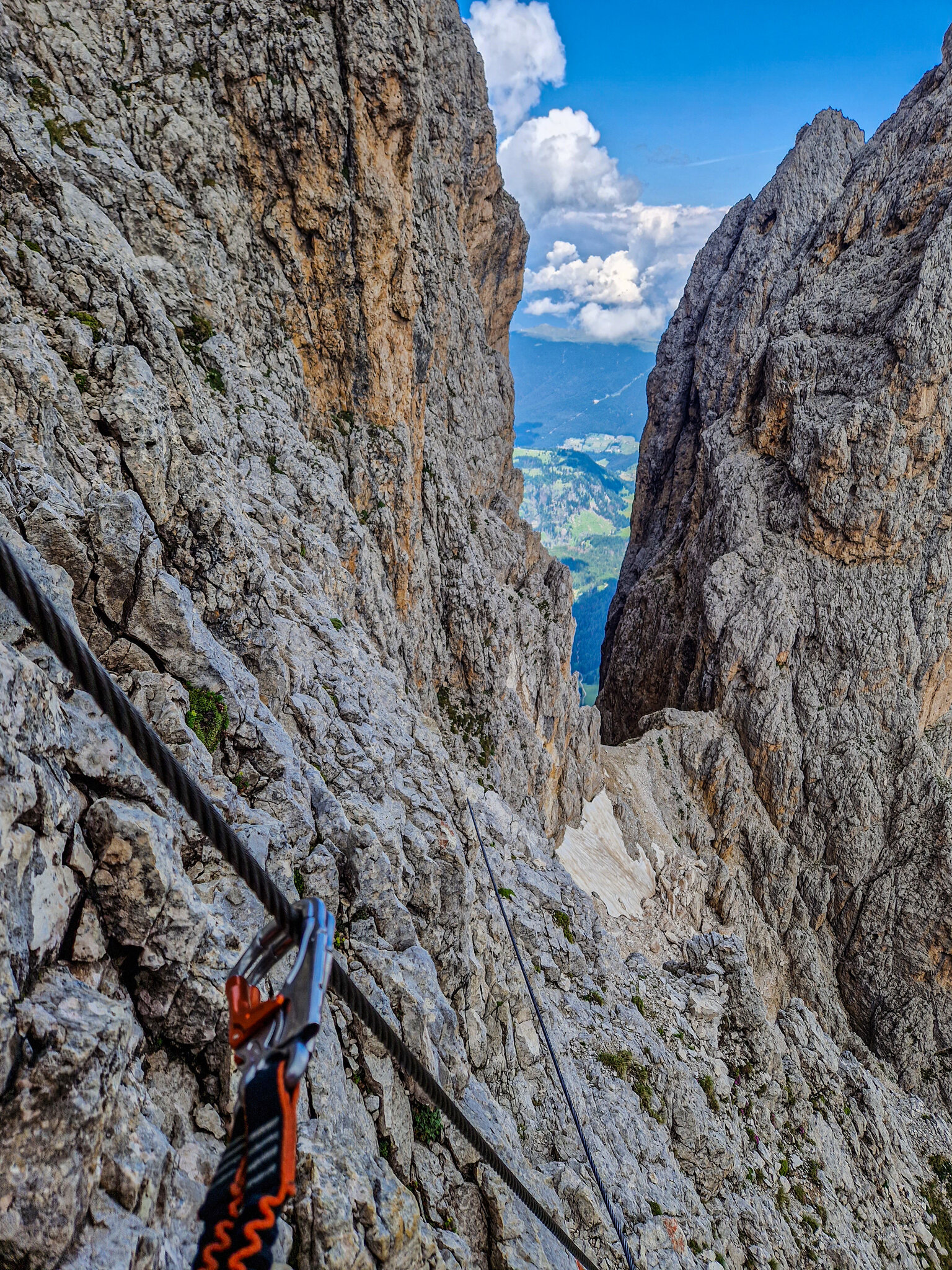 Der Steig selbst ist in sehr gutem Zustand und wohl erst vor kurzem renoviert worden. Auch die Schwierigkeit entspricht der Topo. Im Aufstieg wird man von herrlichen Tiefblicken ins Kar begleitet Und seitlich in Grödnertal Auf halber Strecke wird ein verschneites Schuttfeld gequert Am Ende der Seilsicherung wird man bereits erwartet Von hier aus ging es in die ebenfalls mit Schnee gefüllte Ausstiegsrinne Rückblick Nach knapp 3 Stunden waren wir dann am Gipfel Direkt markiert