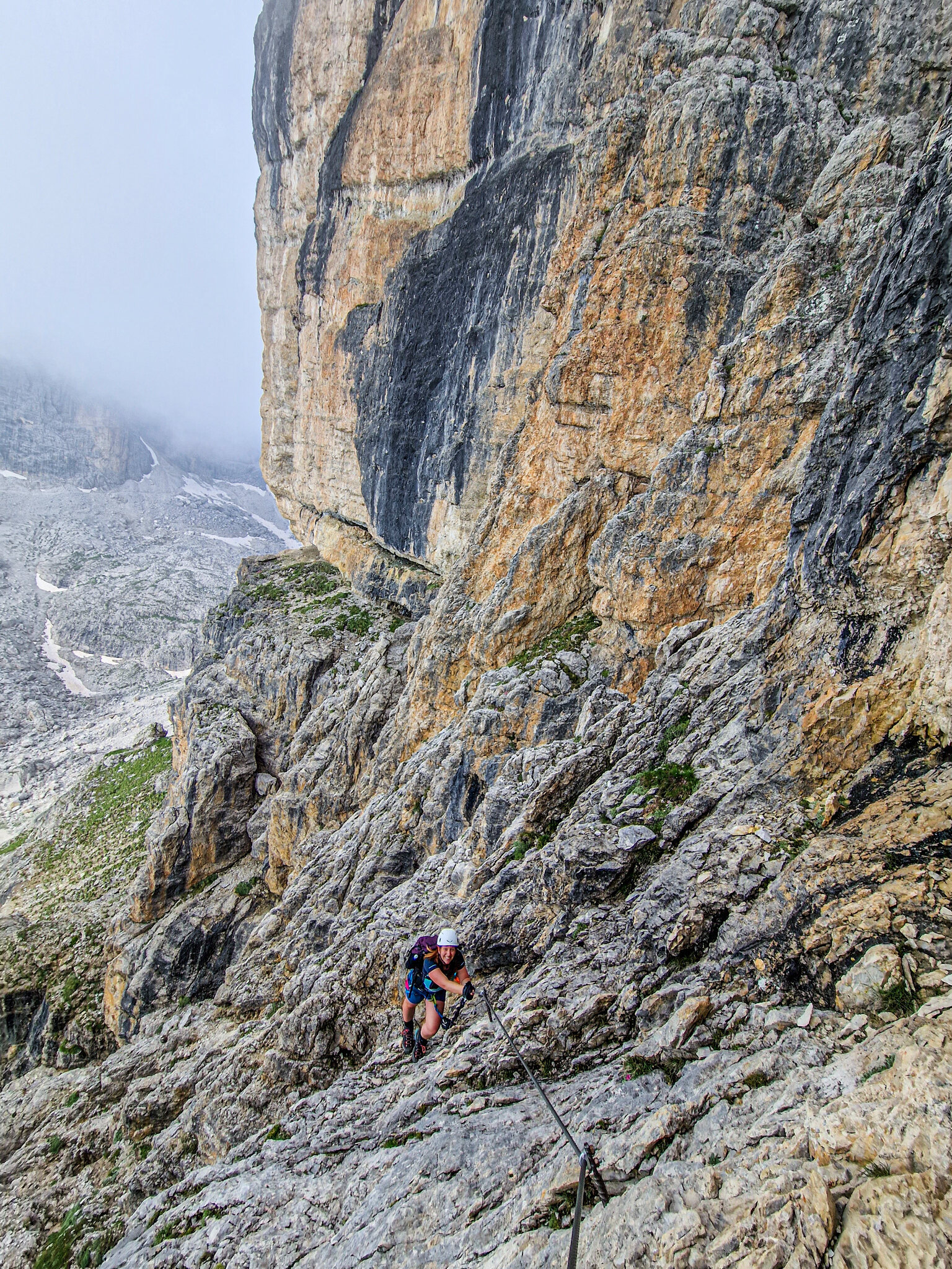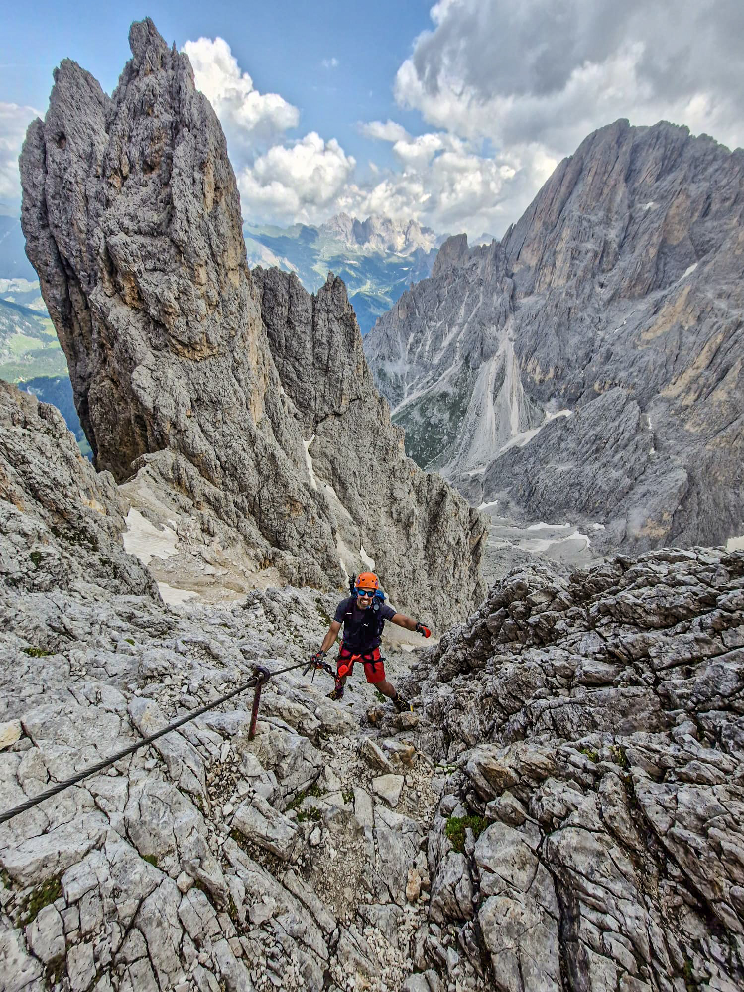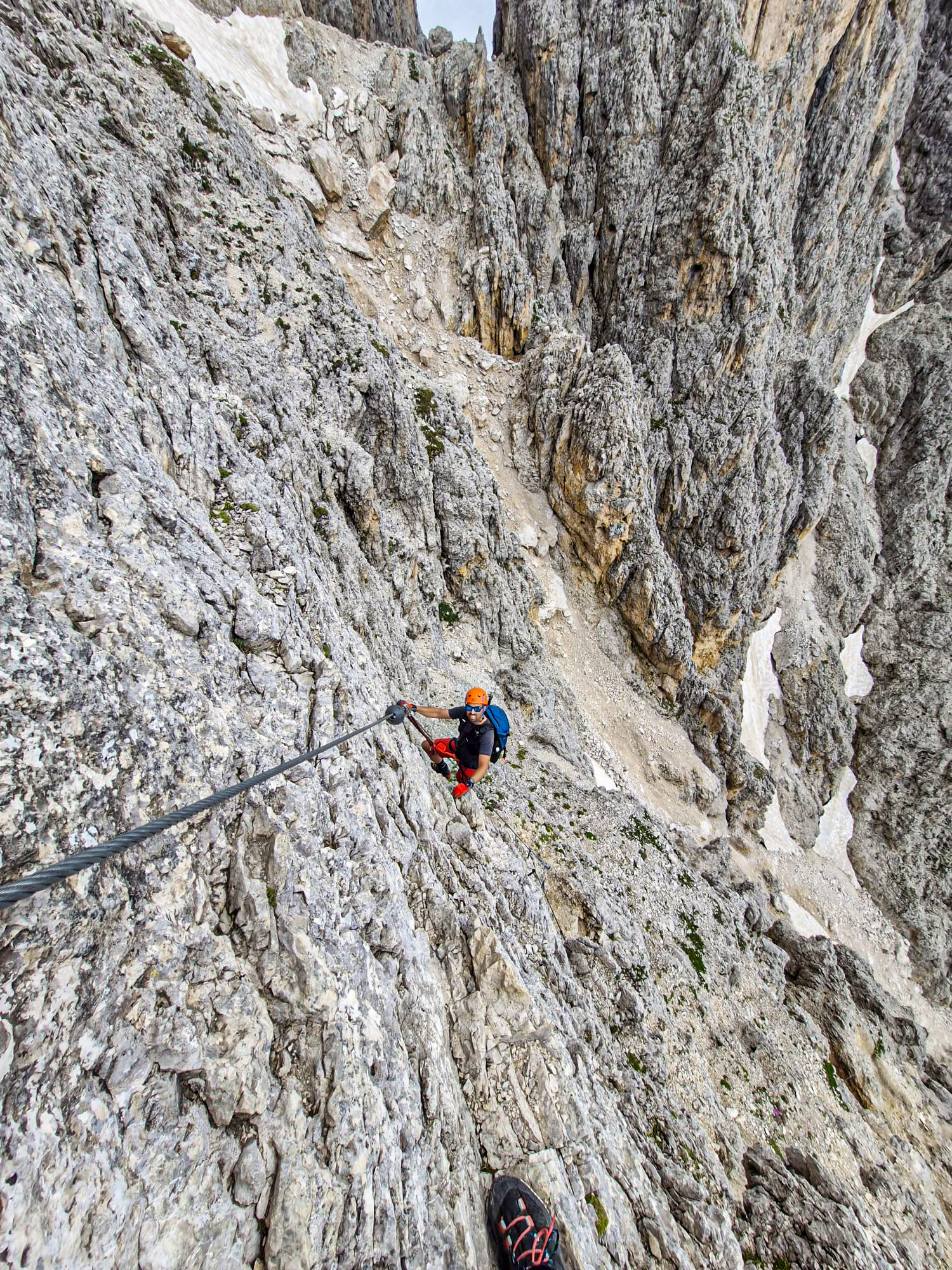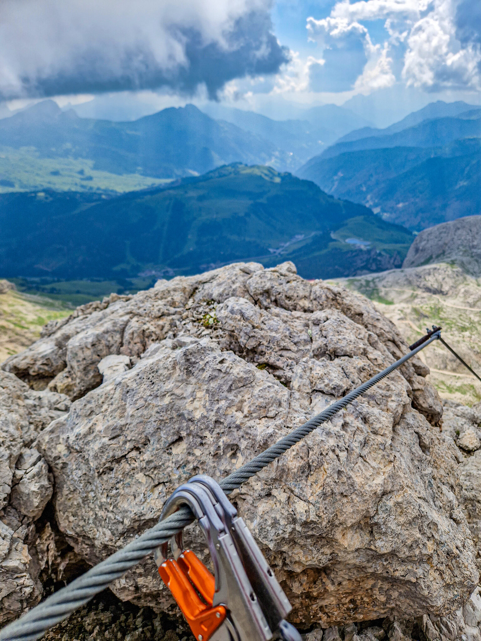 Der Steig selbst ist in sehr gutem Zustand und wohl erst vor kurzem renoviert worden. Auch die Schwierigkeit entspricht der Topo. Im Aufstieg wird man von herrlichen Tiefblicken ins Kar begleitet Und seitlich in Grödnertal Auf halber Strecke wird ein verschneites Schuttfeld gequert Am Ende der Seilsicherung wird man bereits erwartet Von hier aus ging es in die ebenfalls mit Schnee gefüllte Ausstiegsrinne Rückblick Nach knapp 3 Stunden waren wir dann am Gipfel Direkt markiert