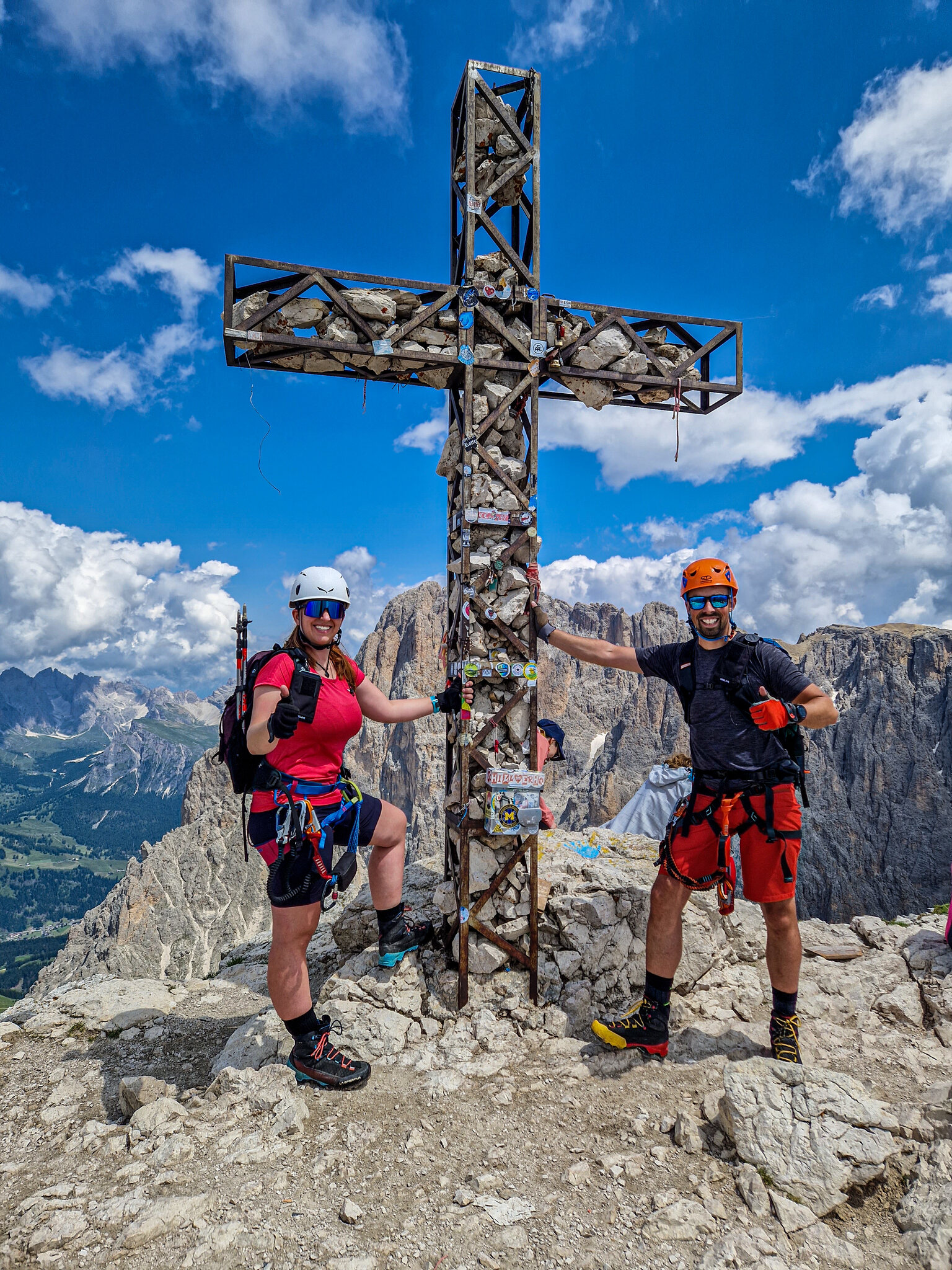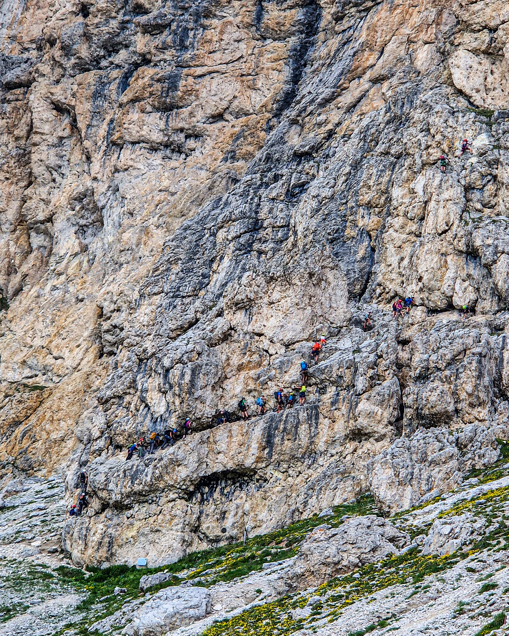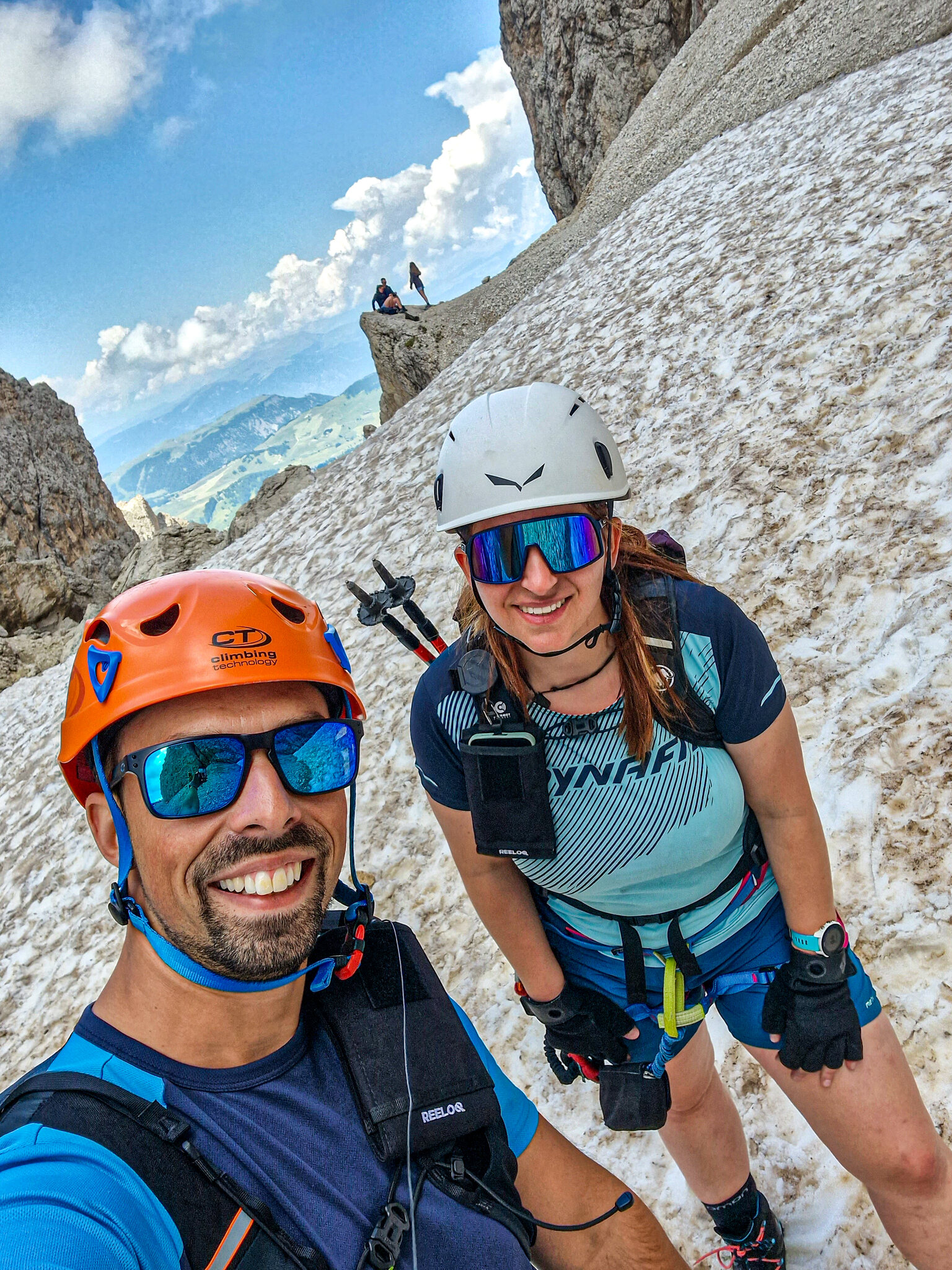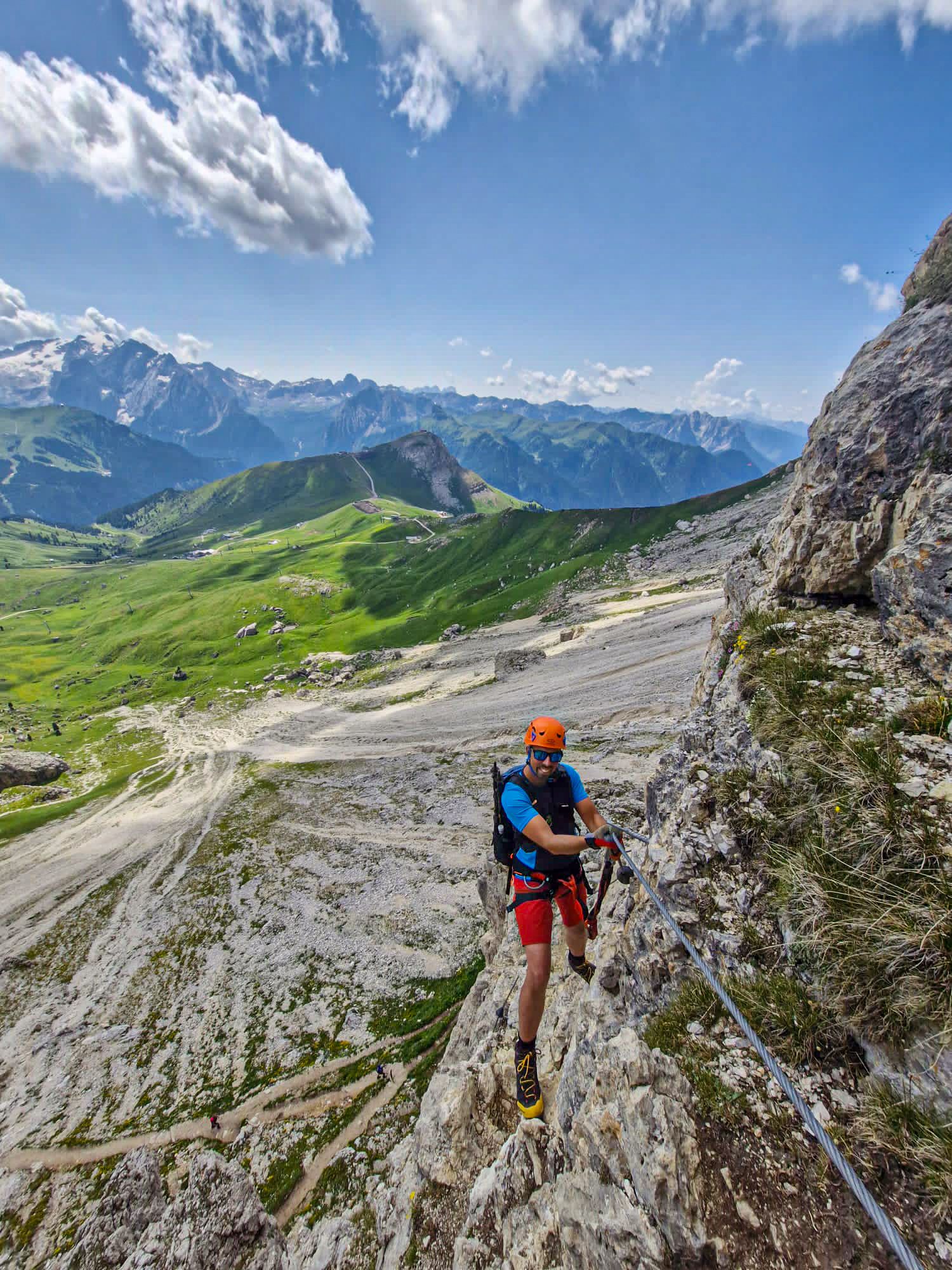 Der Steig selbst ist in sehr gutem Zustand und wohl erst vor kurzem renoviert worden. Auch die Schwierigkeit entspricht der Topo. Im Aufstieg wird man von herrlichen Tiefblicken ins Kar begleitet Und seitlich in Grödnertal Auf halber Strecke wird ein verschneites Schuttfeld gequert Am Ende der Seilsicherung wird man bereits erwartet Von hier aus ging es in die ebenfalls mit Schnee gefüllte Ausstiegsrinne Rückblick Nach knapp 3 Stunden waren wir dann am Gipfel Direkt markiert