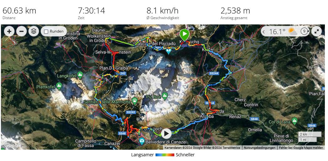 In der Recherche hierzu findet man zwar relativ schnell die liftunterstützte Umrundung der Sella mit dem Velo, zur Route ohne Lifte ist hingegen nur schwer etwas zu finden.
