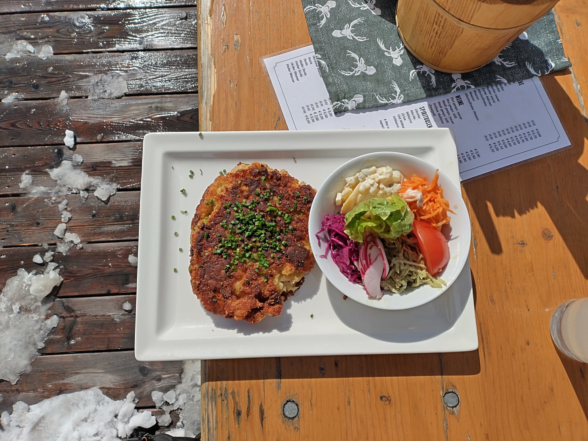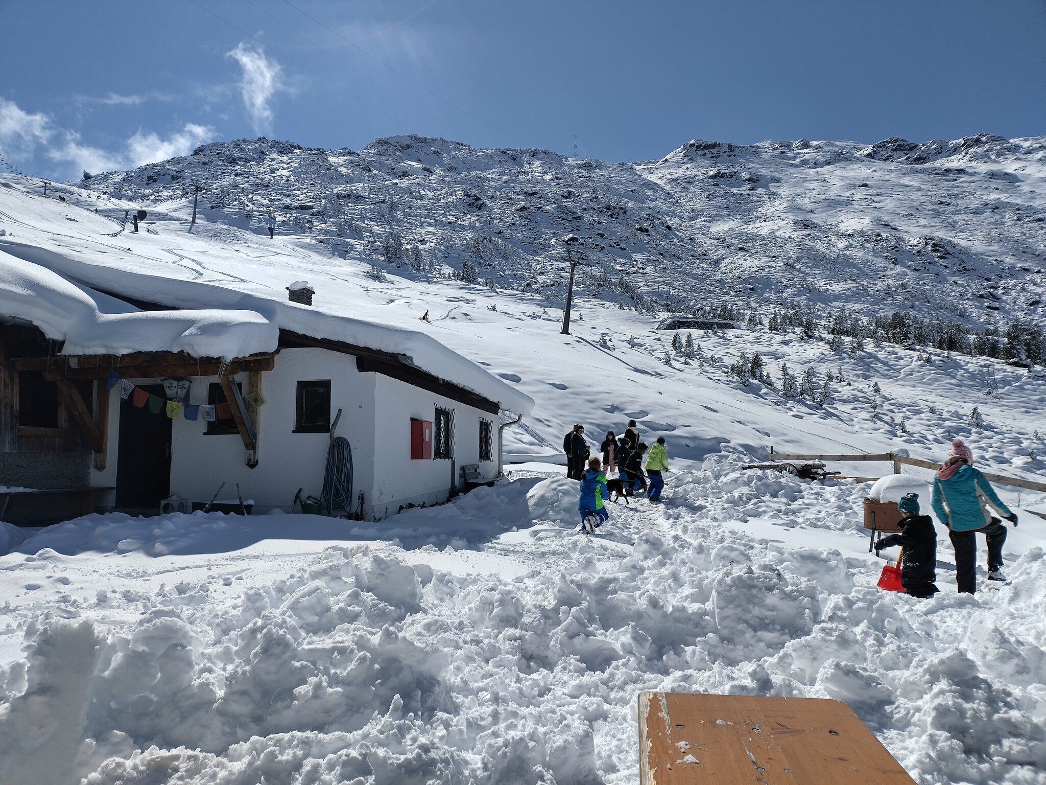 Ürsprünglich wollte ich gleich bis zur Talstation des DSB fahren, aber da ich einige Gräben sehe und noch keine Spur lege ich zuerst die Mittagspause auf der Tulfein-Alm ein, standesgemäß mit Ski bis auf die Terasse und beobachtet das Trieben im Schnee ein wenig.