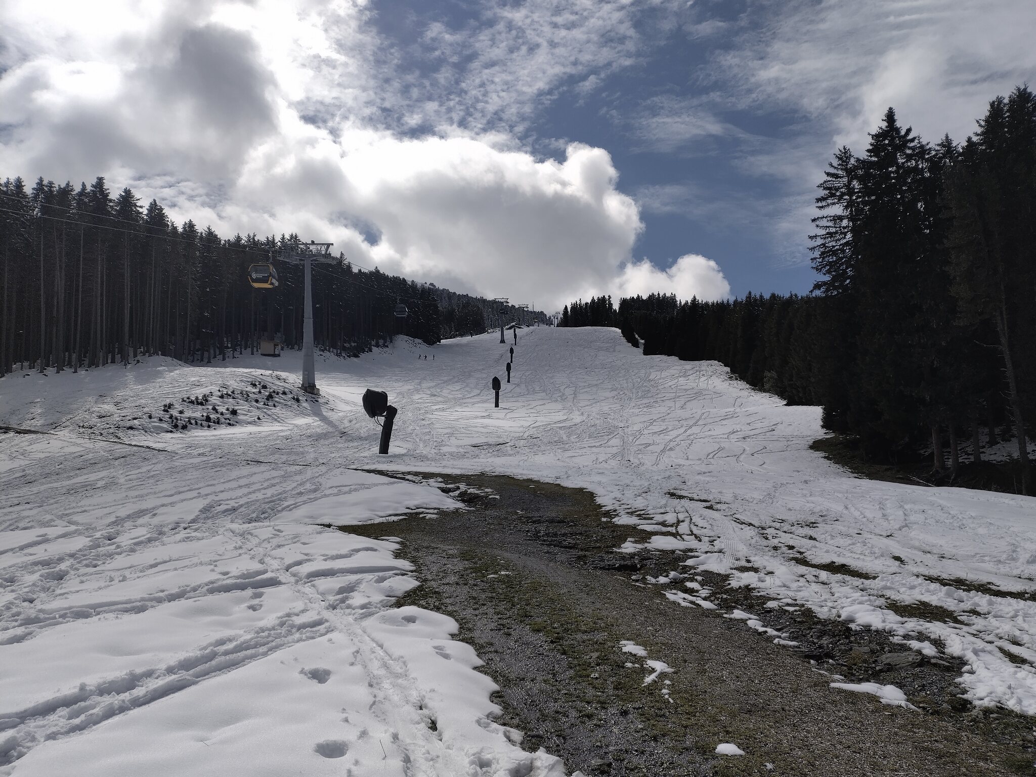 Die Abfahrt nach Halsmarter ist inzwischen ordentlich zerfahren, aber mit breiten Ski und hoher Geschwindigkeit immer noch ganz ok. Nur die Forstwege sind inzwischen fast komplett aper: