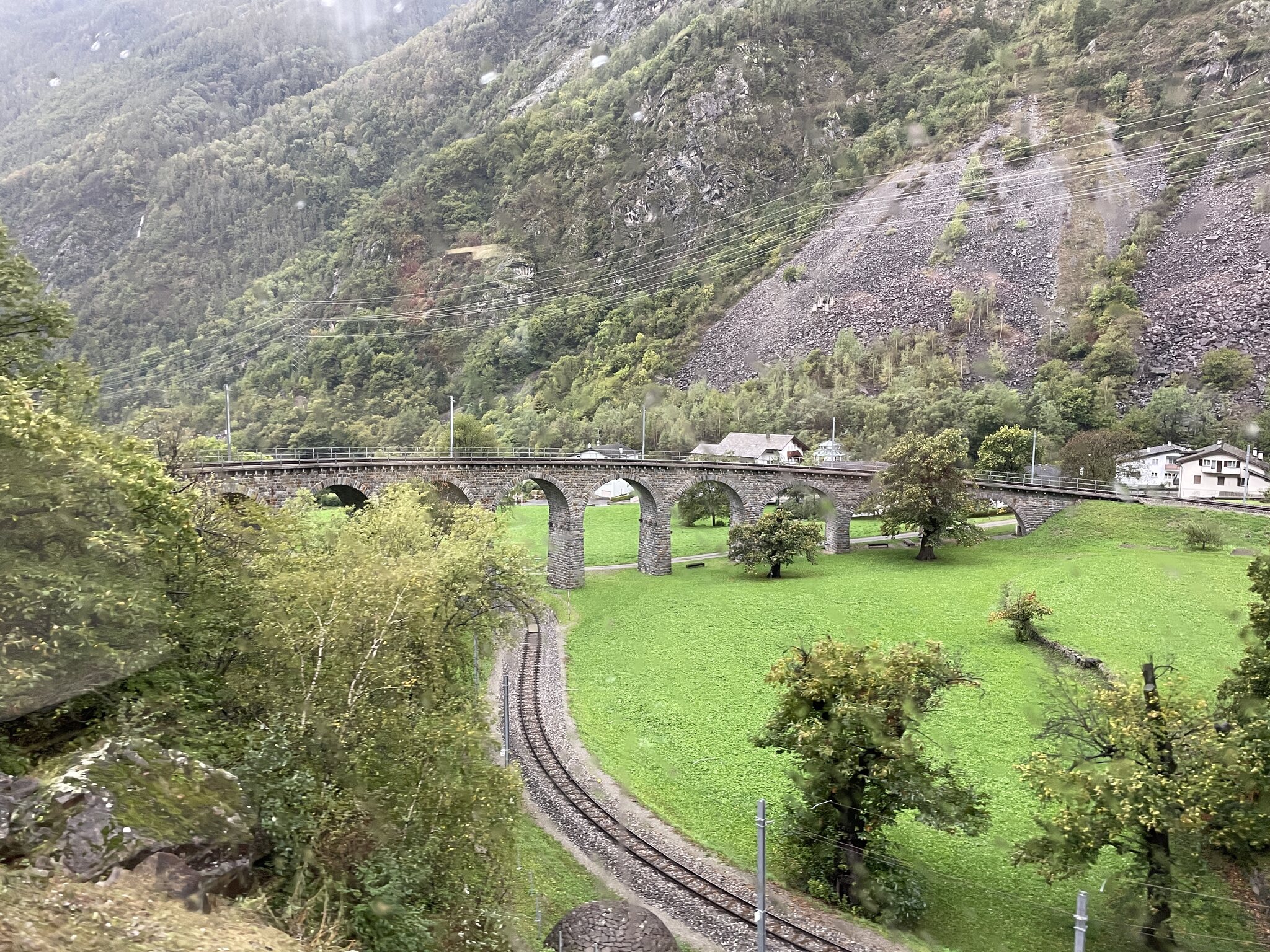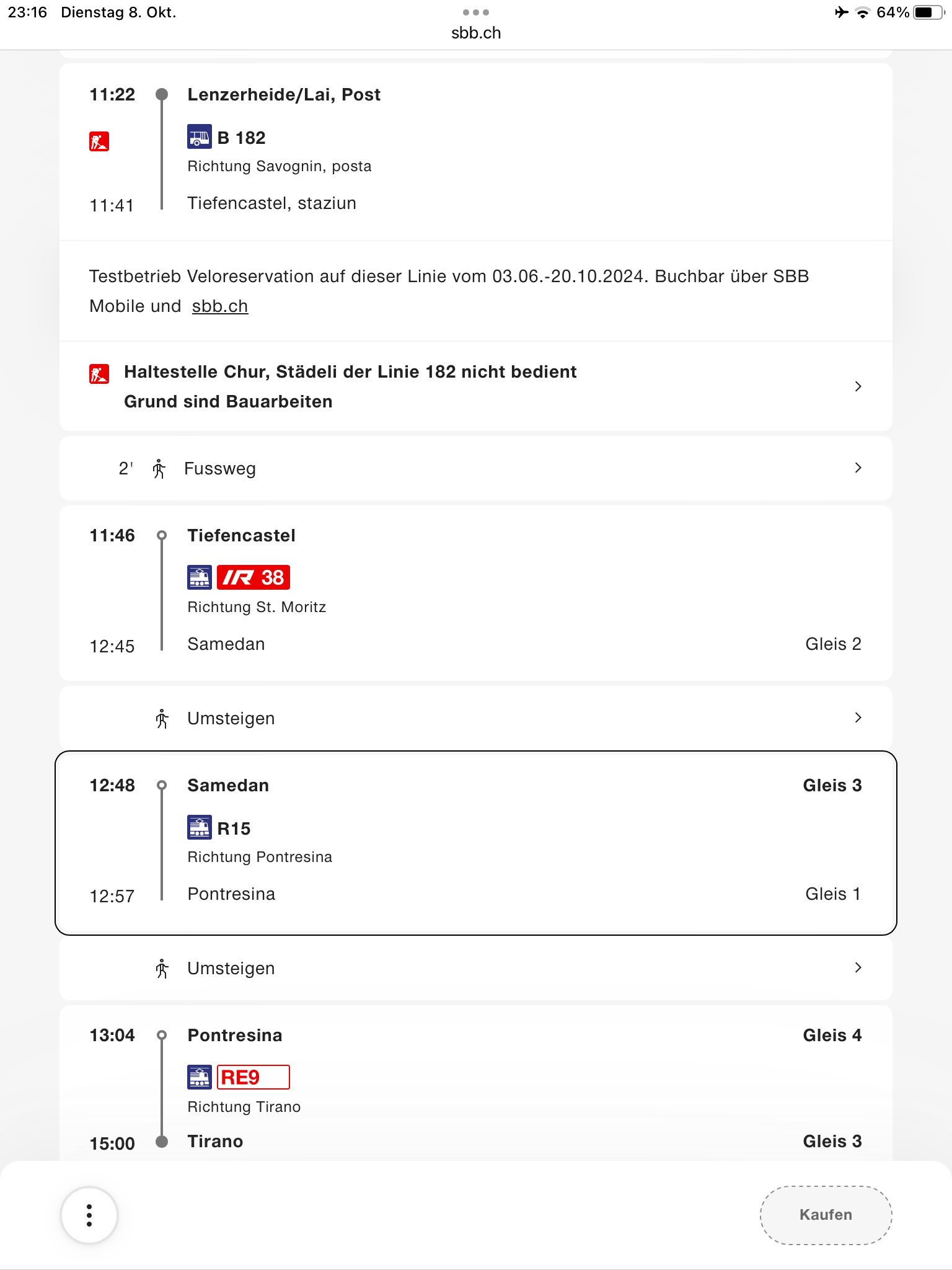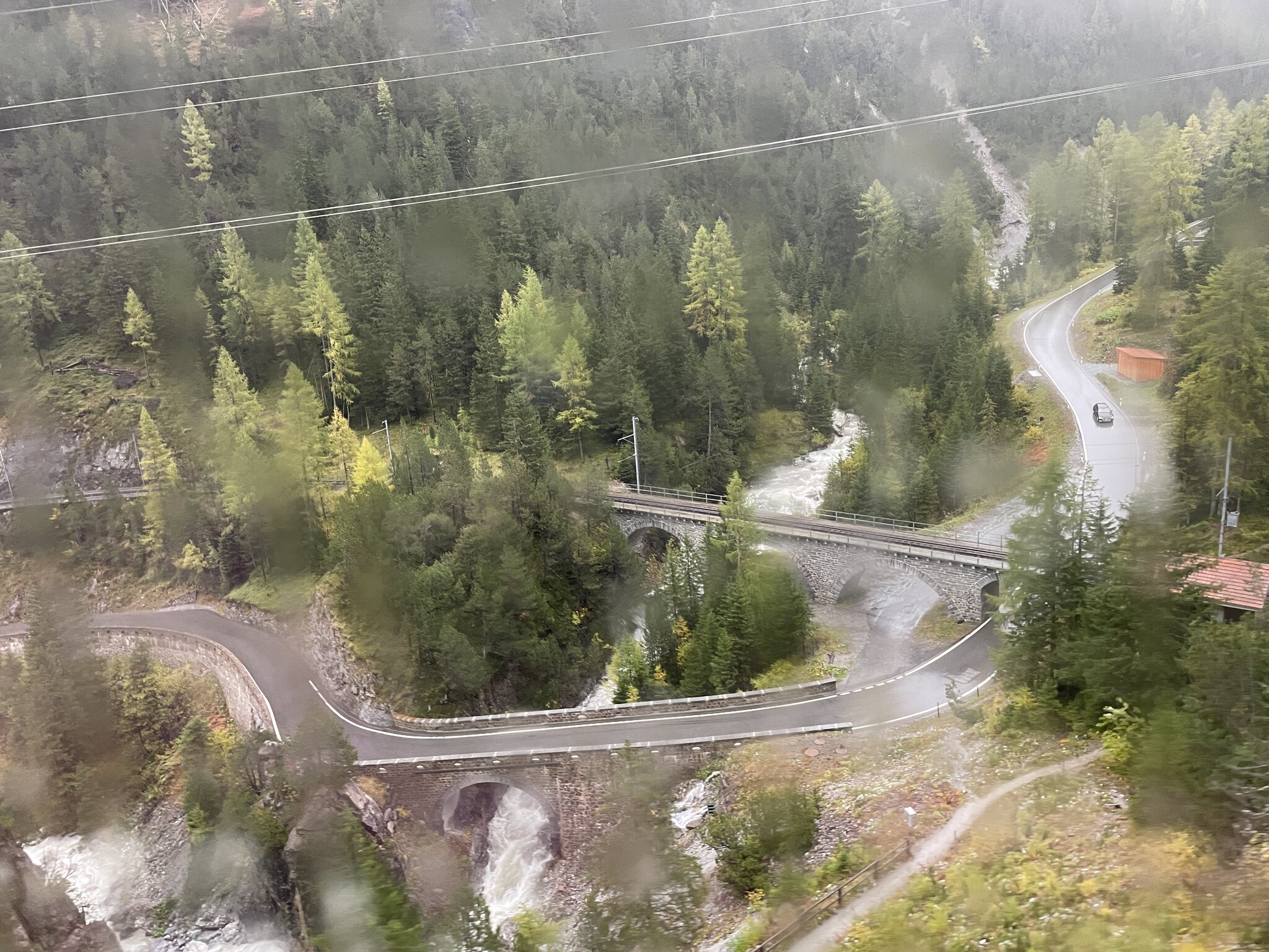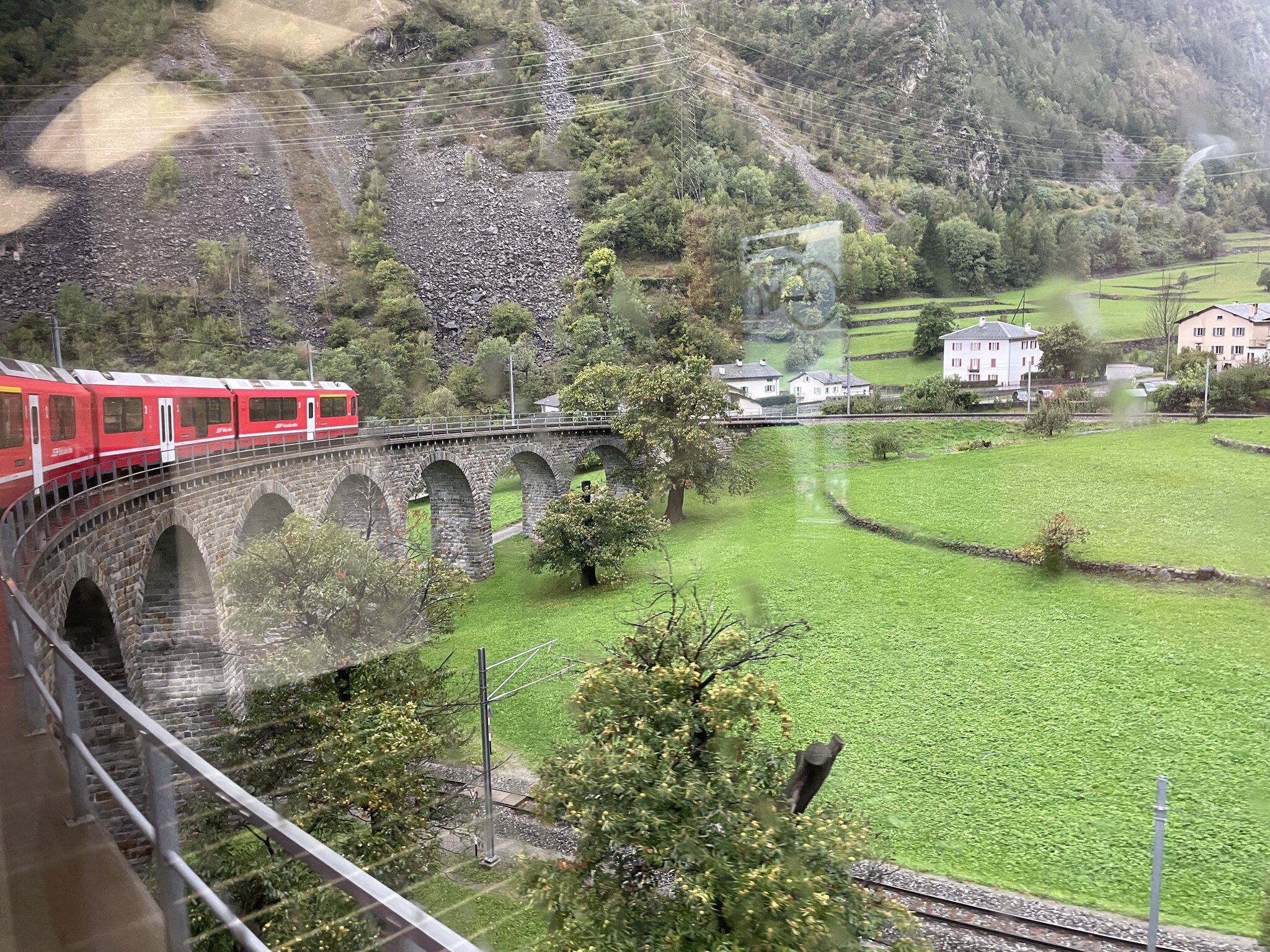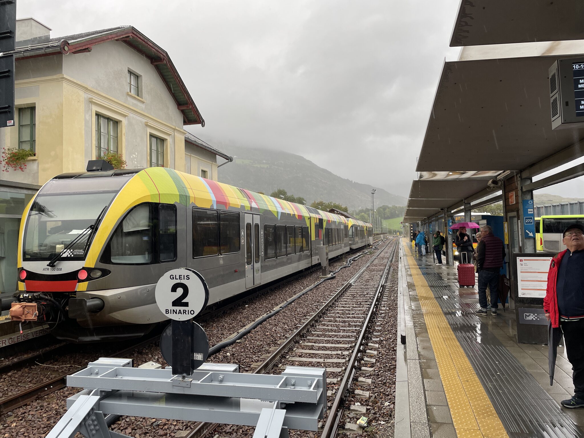 Fahrt im leeren Bus nach Tiefencastel, ab Lantsch waren wir sogar die einzigen Fahrgäste: Der heutige Fahrplan. Der schlanke, dreiminütige Anschluss in Pontresina wurde tatsächlich noch knapper, da der Zug ab Tiefencastel acht Minuten Verspätung einfuhr. Netterweise wartete der Anschlusszug aber, sodass das Umsteigen problemlos funktionierte. Auch die Weiterfahrt in Pontresina klappte den Umständen entsprechend gut. In Tiefencastel wechselten wir vom Bus auf den Zug. Mit dem linken Bus sind wir hier hergefahren. Nach Bergün kreuzt der Zug zweimal die Darlux-Sesselbahn. Wegen des starken Regens war die Sicht aus dem Fenster zeitweise sehr schlecht, was auf diesem Foto zu erahnen ist: Die Albula-Linie mit den Kehrtunneln und Brücken hat definitiv ihren Reiz: Der Zug war sehr leer. Ab Bergün hatten wir einen Wagenteil für uns alleine: Im Oberengadin steht die Zeit der goldenen Lärchen kurz bevor: An dieser Stelle, nach der Station Morteratsch, eröffnet sich einem bei besserem Wetter der bekannte Blick auf die Berge und Gletscher. Heute leider alles grau: Blick auf Poschiavo: Lago di Poschiavo: Viadukt bei Brusio: Spätestens nachdem eine Familie mit zwei Kindern bei der Alp Grüm ausgestiegen war, war das wieder eine sehr angenehme und leere Fahrt: Ankunft in Tirano: Einige Eindrücke vom Städtchen, das überraschend hübsch ist: