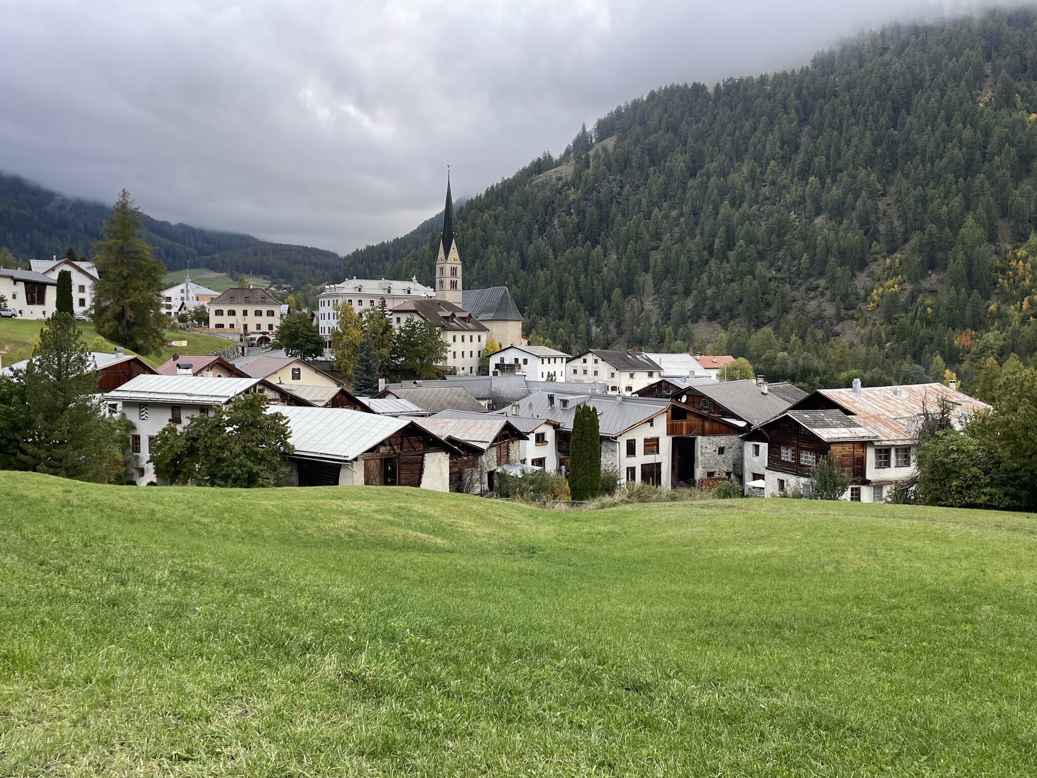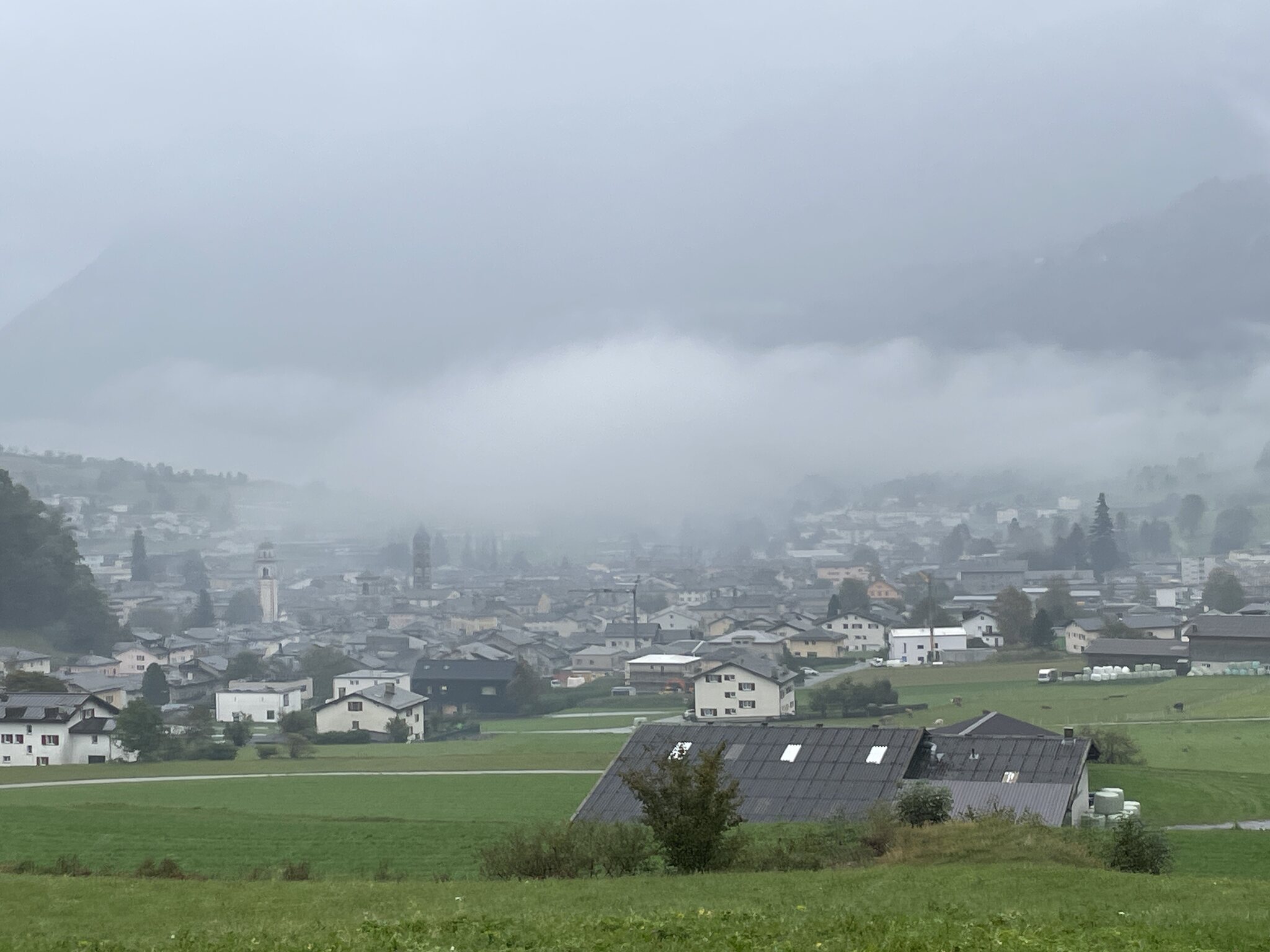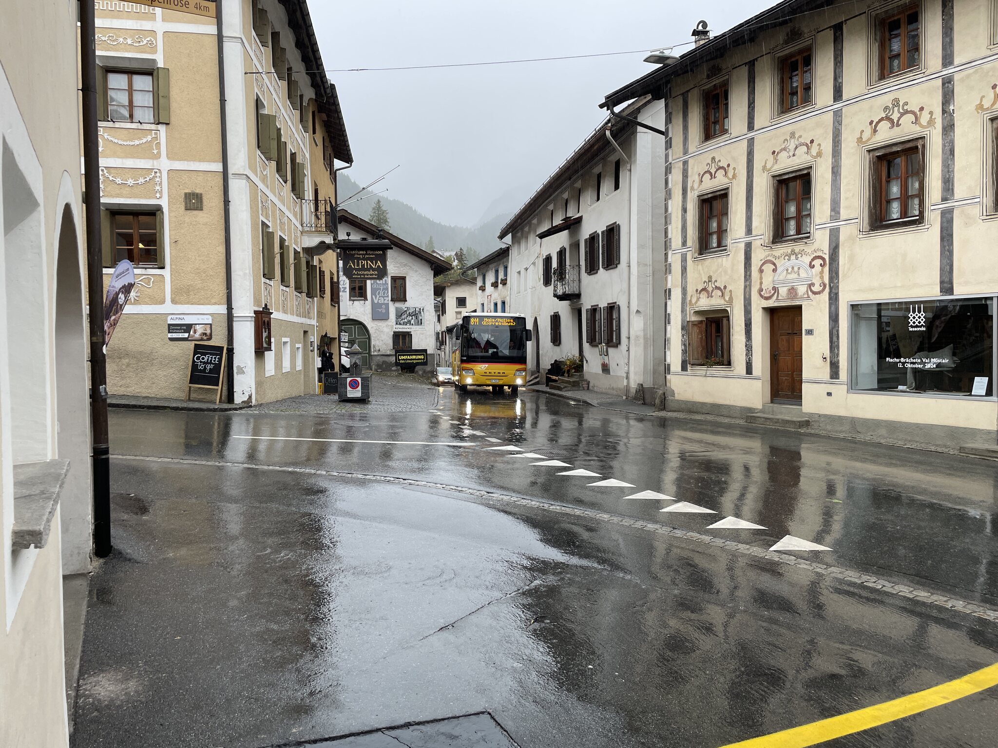 Nicht zu früh, dafür bei strömendem Regen, machten wir uns zu Fuss auf zur Post Lenzerheide, wo das Postauto nach Tiefencastel fuhr. Der Regen sollte heute ein konstanter Begleiter bleiben.