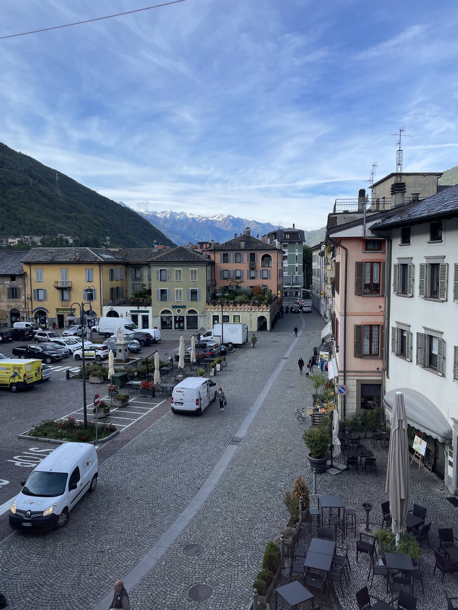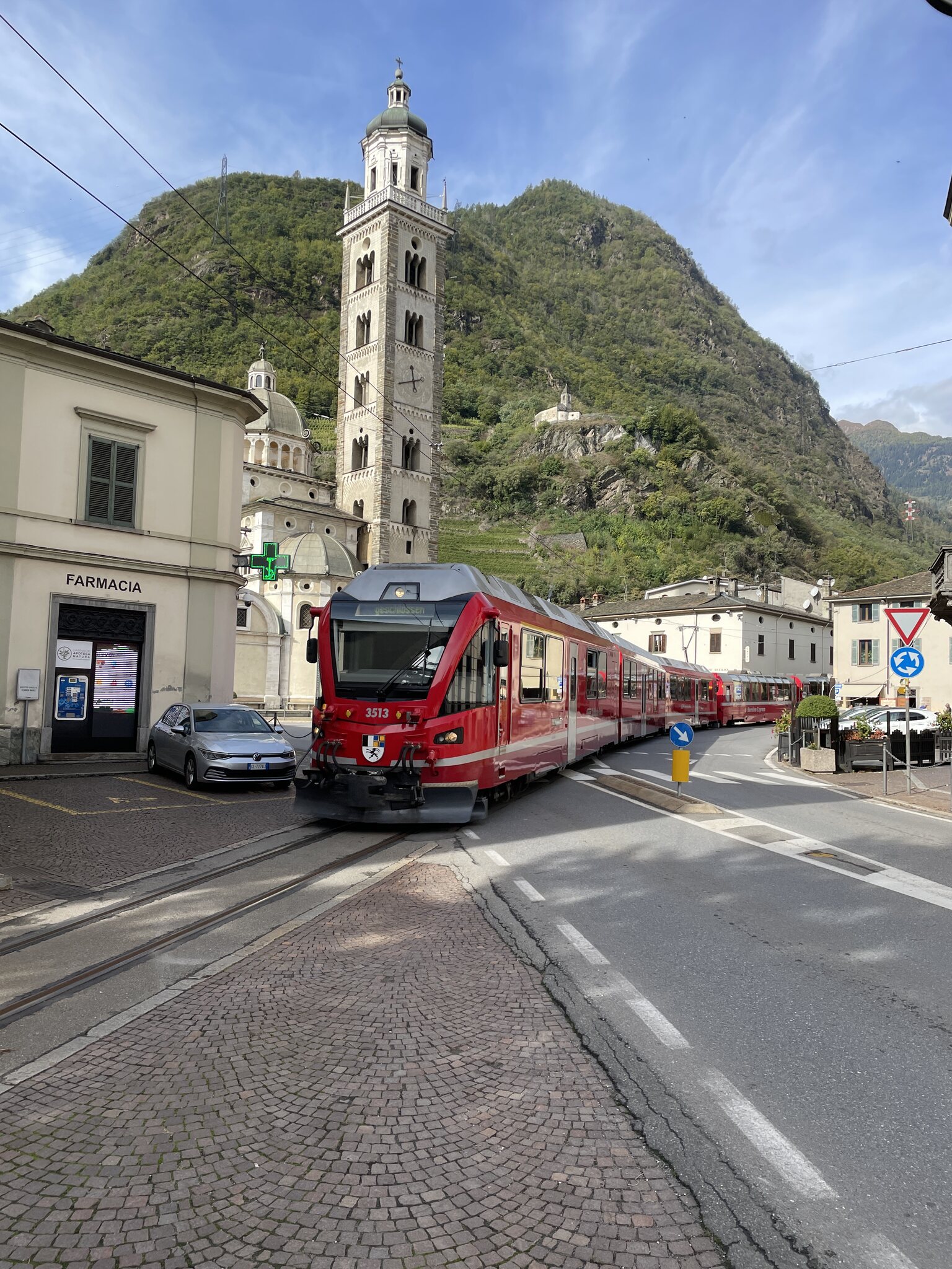 Heute Morgen wachten wir in Tirano auf und konnten erleben, wie die Aussicht aus dem Hotelzimmer auch aussehen kann: Bevor der Bus nach Santa Maria fuhr, machten wir einen Stadtbummel. Bei Sonnenschein war dies deutlich angenehmer als gestern bei sehr starkem Regen. Das obligate RhB-Föteli vor der Kirche durfte natürlich nicht fehlen: Mein Eindruck von Tirano: Eigentlich eine schöne, kleine Stadt mit vielen Restaurants. Aber es hat überall sehr viele Autos. Dadurch ist es ziemlich laut und egal, wo man ist, muss man ständig zur Seite gehen.