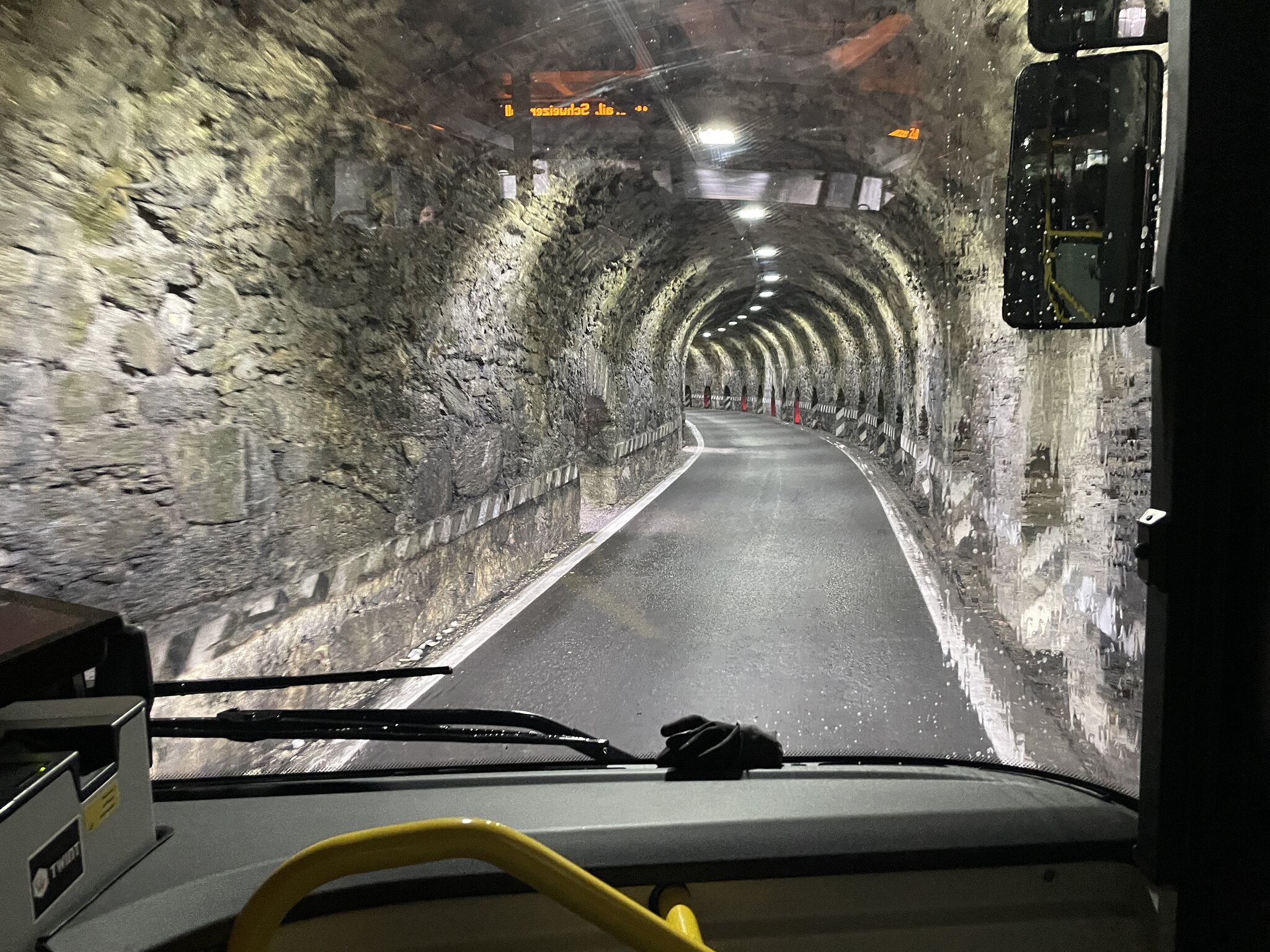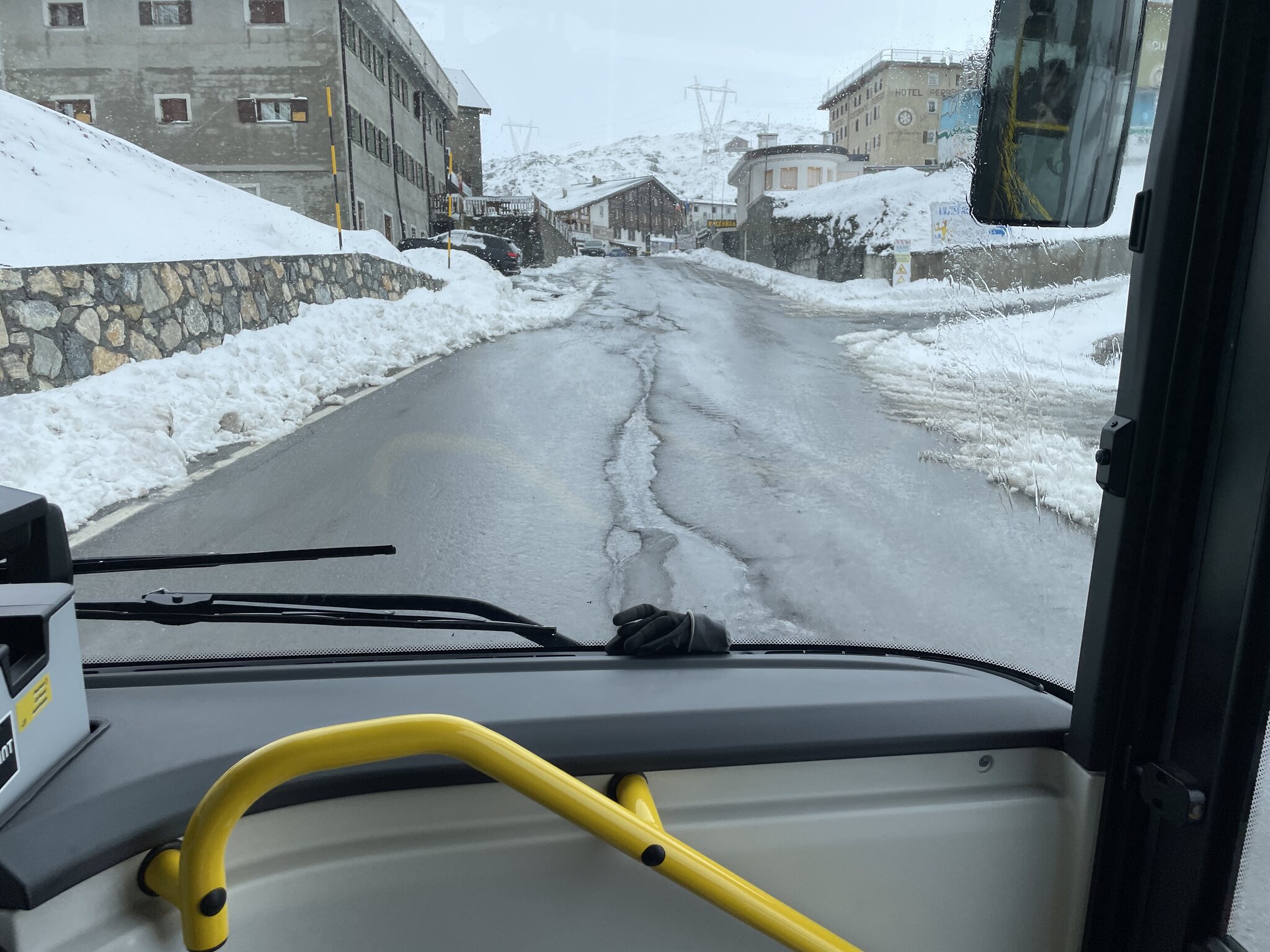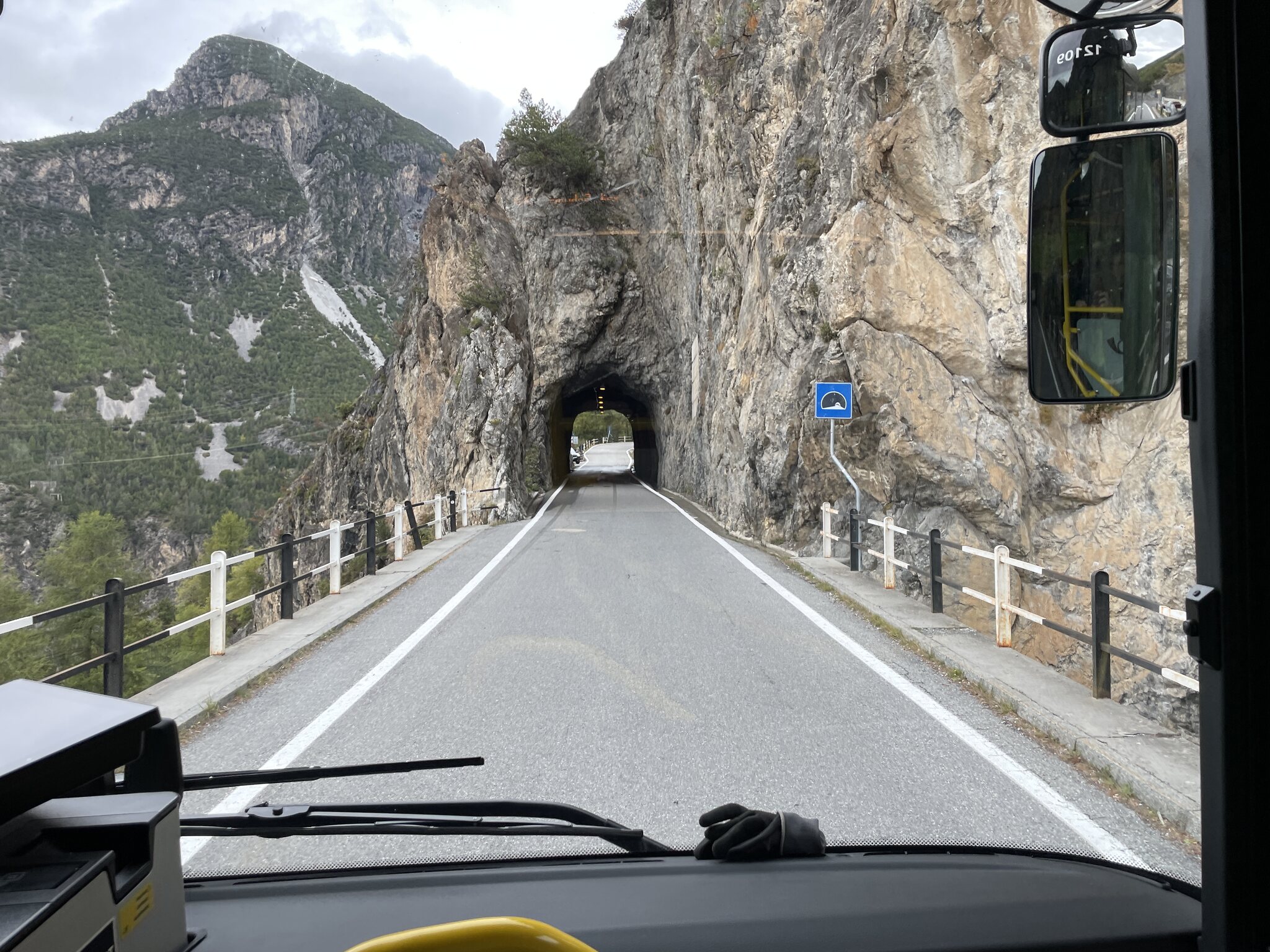 Die Abfahrt unseres Busses war um 13:45 Uhr. Beim Warten am Bahnhof konnte ich zwei Busse im RhB-Kleid fotografieren, die als „Bernina-Linie“ bis nach Lugano fahren. Diese Reise dauert über drei Stunden. Unsere Fahrt fand jedoch in einem gelben Postauto statt. Zu Beginn führt die Strecke etwa eine halbe Stunde über eine autobahnähnliche Strasse mit vielen Tunneln nach Bormio. Die gefahrene Geschwindigkeit ist hier sehr hoch, nicht selten über 90km/h. Die heutige Reise: Ortsdurchfahrt Bormio: Bus“bahnhof“ Bormio, wo es eine fünfminütige Pause gab: Nach Bormio steigt die Strasse steil an und die ersten Tunnel werden durchfahren: Im engsten und zugleich längsten Tunnel. Der Bus passierte diesen mit maximal Schrittgeschwindigkeit: Blick zurück auf die Passstrasse. Ab Bormio bis auf das Stilfserjoch sind es 36 Spitzkehren. Der Busfahrer war hart im Nehmen: Auf diesem Abschnitt fuhr er satte 80km/h. Ankunft auf der Passhöhe. Das Wetter hat sich wieder verschlechtert. Es herrschten garstige drei Grad sowie Graupelschauer und Wind. Oben hatten wir einen 40-minütigen Aufenthalt. Ich nutzte die Zeit, um die Passhöhe zu erkunden. Meine Freundin verzog sich direkt ins Restaurant. Und ja, sie hat nicht viel verpasst. Hier oben ist es, nett ausgedrückt: Speziell… Das Skigebiet ist nicht weit: Der Bus, mit dem wir gefahren sind: Nach wenigen Minuten hatte ich genug und ich ging ebenfalls ins (nicht schönere) Restaurant, um dort etwas zu trinken, bis der Bus weiterfuhr.