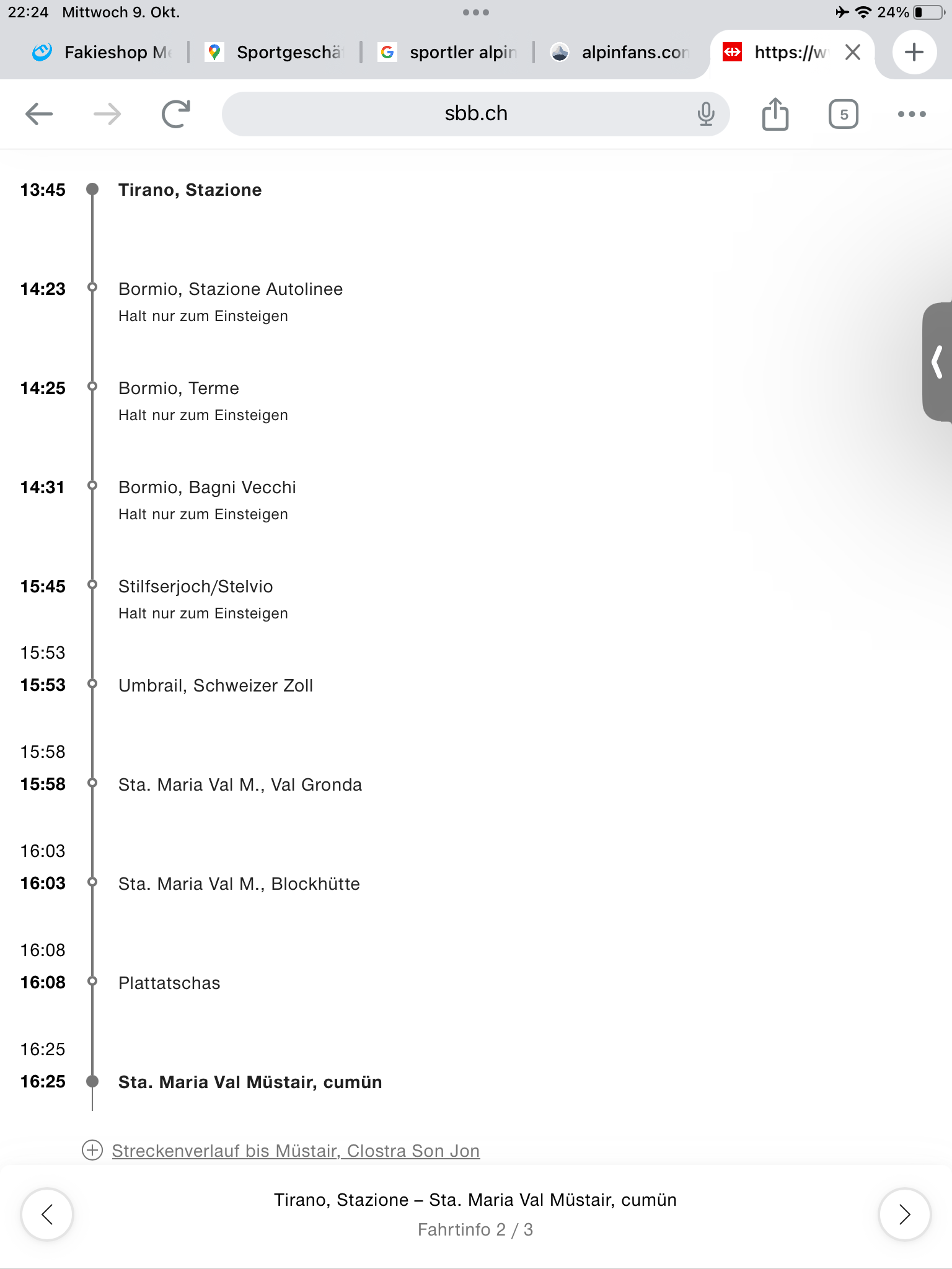 Da ich mich seit vielen Jahren für den ÖV interessiere und mich hauptsächlich mit Bus, Bahn und Co fortbewege, habe ich schon viele spannende Linien befahren können - vele stehen aber noch auf der Liste. Interessante Strecken finde ich zum Beispiel Linien, die steil, kurvenreich, schmal oder ausgesetzt sind. Die Stelvio-Linio, vom italienischen Tirano ins schweizerische Münstertal, vereint einige dieser Parameter. Da weder Tirano, noch das Münstertal von meinem Wohnort im Schweizer Mittelland und auch nicht vom Zweitwohnsitz Lenzerheide schnell erreichbar sind, hatte sich diese Fahrt bis jetzt nicht ergeben. Dazu kommt, dass meine Freundin von Zeit zu Zeit (gerne!) solche Abenteuer mitmacht, sie sich grundsätzlich aber Spannenderes vorstellen kann. Daher musste es Herbst 2024 werden, dass wir diese Reise in Angriff nahmen. Ich plante also eine Reise, bei welcher sich die Fahrt über das Stilfserjoch gut integrieren liesse. Und wenn wir schon in dieser Ecke sein sollten, so dachten wir, könnten wir auch gleich noch einen Abstecher nach Meran und Bozen machen, wo wir ebenfalls noch nie waren.