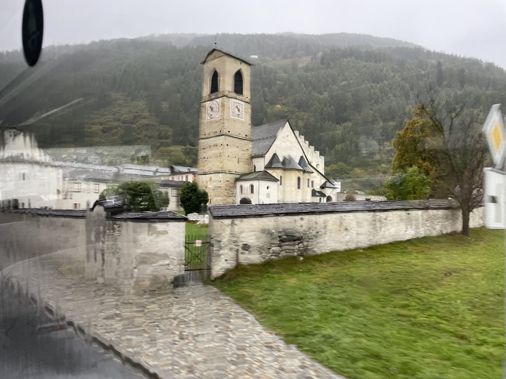 In der Nacht fiel viel Regen vom Himmel. Den Wassermassen im Bach zufolge auch weiter oben im Tal, denn der Fluss neben unserem Hotel in Santa Maria wies eine grosse Abflussmenge auf: Unser erstes Verkehrsmittel ist in Anfahrt: Fahrt vorbei am Kloster in Val Müstair, kurz nach welchem wir die italienisch-schweizerische Grenze passierten: Die Strecke ist durchaus ansprechend. Auffällig fand ich auch heute wieder, wie schnell der Bus unterwegs war. Das bin ich mir aus der Stadt/Agglo und der Lenzerheide nicht gewöhnt. Verschwommener Blick auf Mals (rechts): Vor Mals fährt der Bus durch Gluns. Diese Stadt (?) sah sehr interessant aus: Grosse Stadtmauer, enge Stadttore, historisches Zentrum etc.