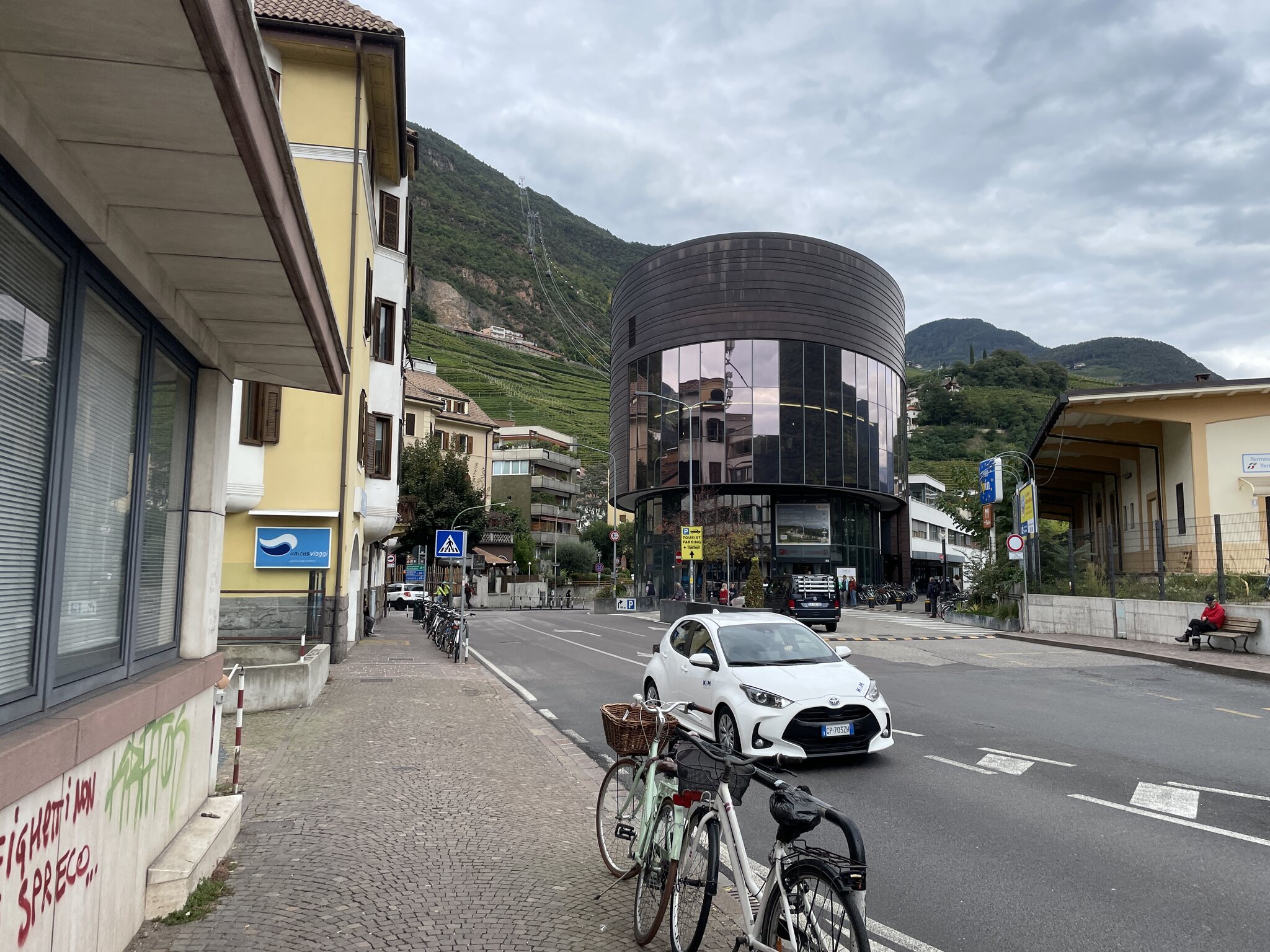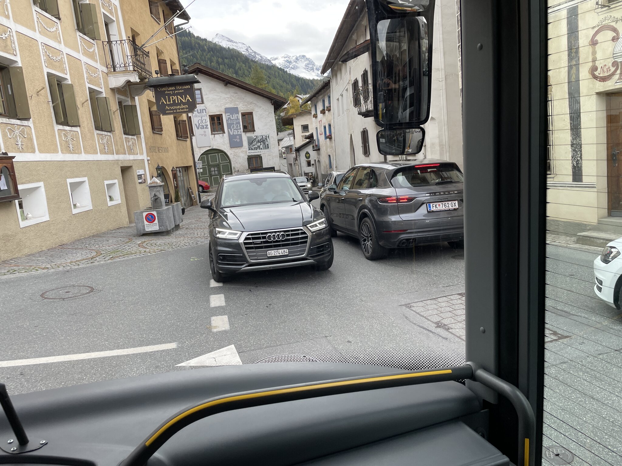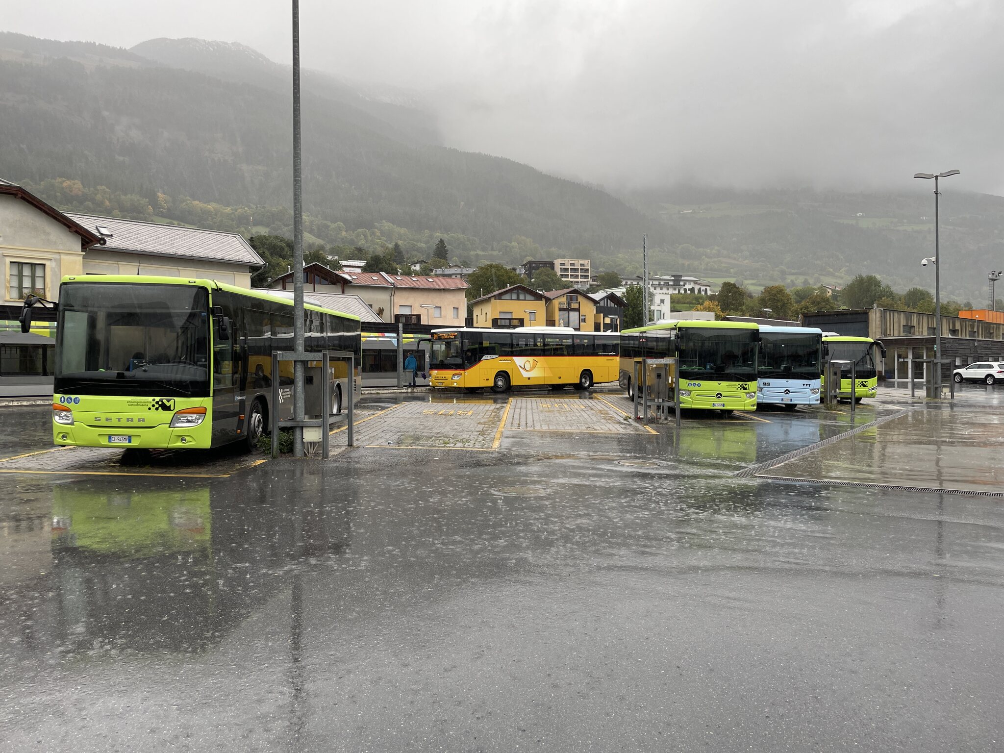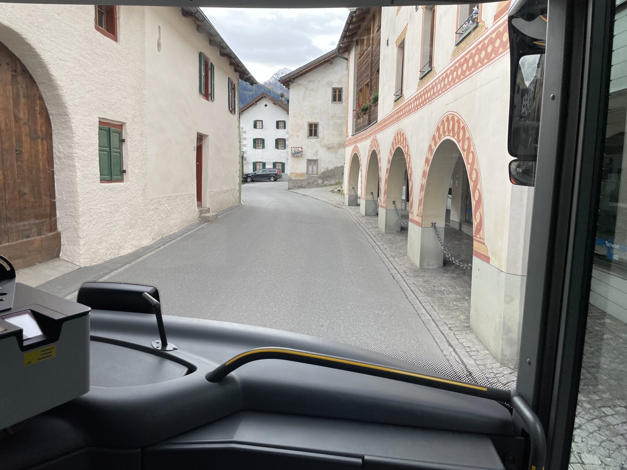 Bei der Hinfahrt konnte ich von der Durchfahrt Gluns' keine Fotos machen. Bei der Rückfahrt hatten wir im Bus einen besseren Platz, sodass sich drei Fotos vom Städtchen ergaben: Apropos Bus: Mit der Zeit bemerkt und lernt man so einiges. So weiss ich zum Beispiel bei vielen Modellen von Postauto Graubünden, welcher Platz am bequemsten ist (bspw. bezüglich Beinfreiheit oder Polsterung). Wenn also ein Bus naht, sage ich meiner Freundin, wo wir am besten sitzen würden und sie kümmert sich dann um den Rest. Da sie auf Zack und sehr gross ist (= lange Beine = schnell), ist sie im Ergattern von was auch immer sehr guteasyrider hat geschrieben: 11.10.2024, 00:01 Teil 3: Santa Maria Val Müstair - Meran, 10.10.2024